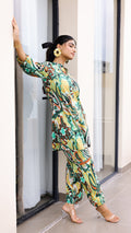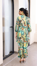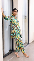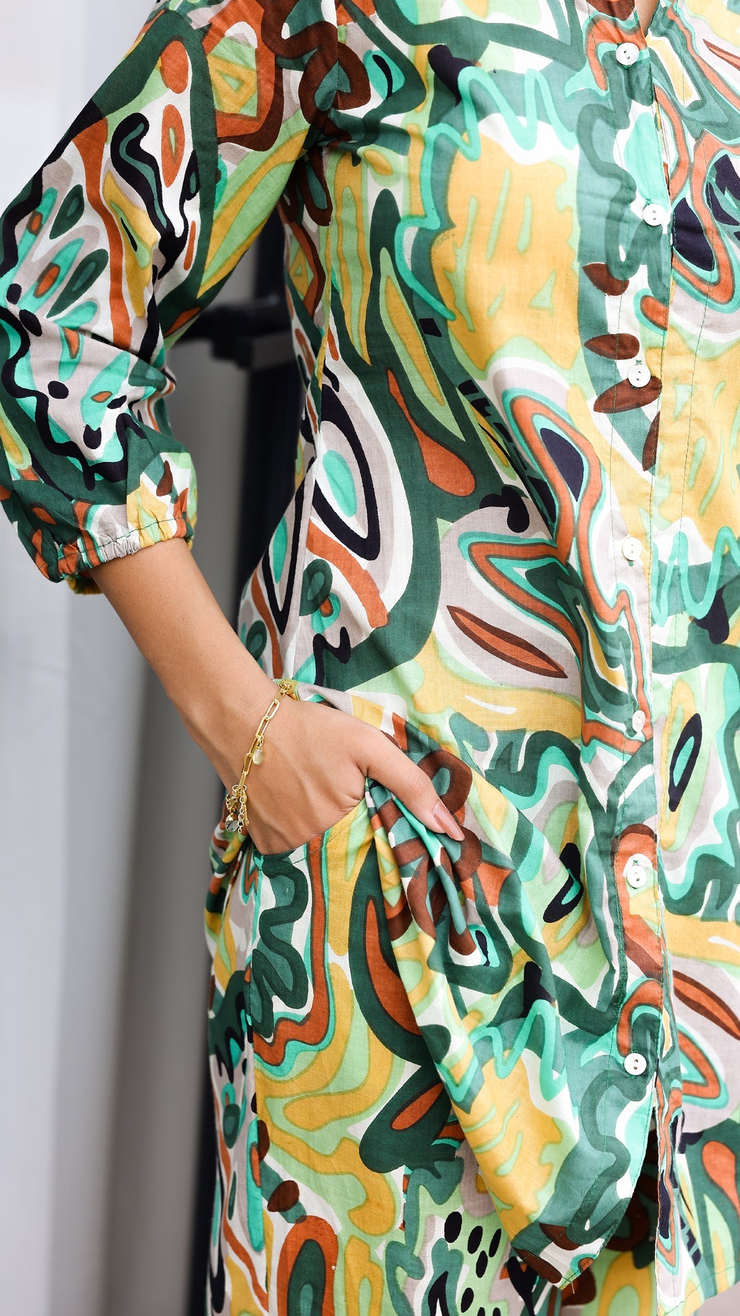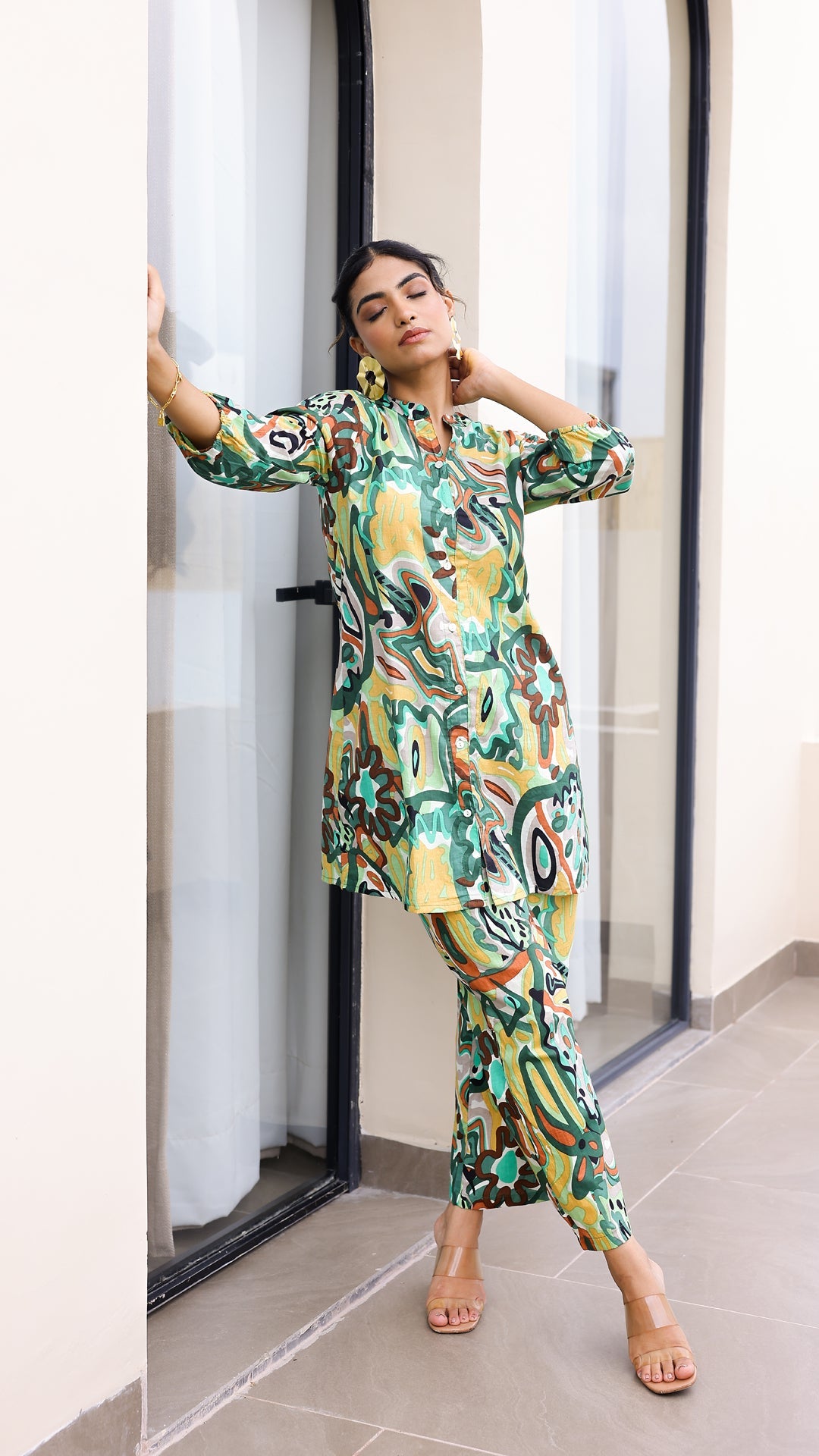 Fresh, artistic, and fashion-forward — this green abstract print co-ord set is a must-have for bold style lovers. Made with breathable cotton-linen, the kurta features a button-down front with soft balloon sleeves, paired with relaxed-fit matching pants. Ideal for travel, brunch, or weekend chic.