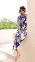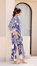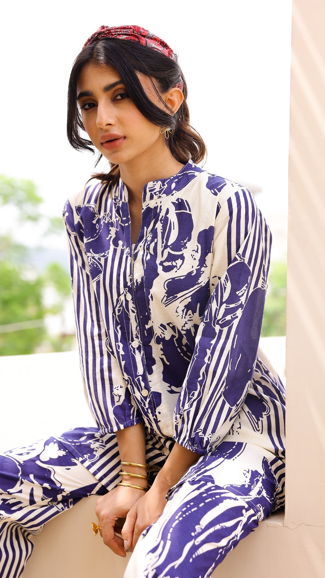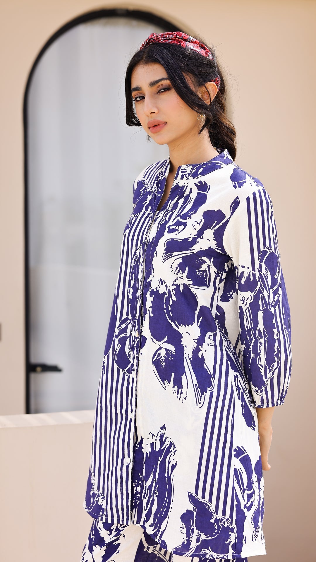 Step into effortless elegance with this ivory and indigo co-ord set. Featuring a striking mix of bold florals and vertical stripes, this cotton-linen ensemble includes a mandarin-collared kurta with a button-down front and straight-fit pants. Lightweight, breezy, and full of charm—perfect for daywear chic.