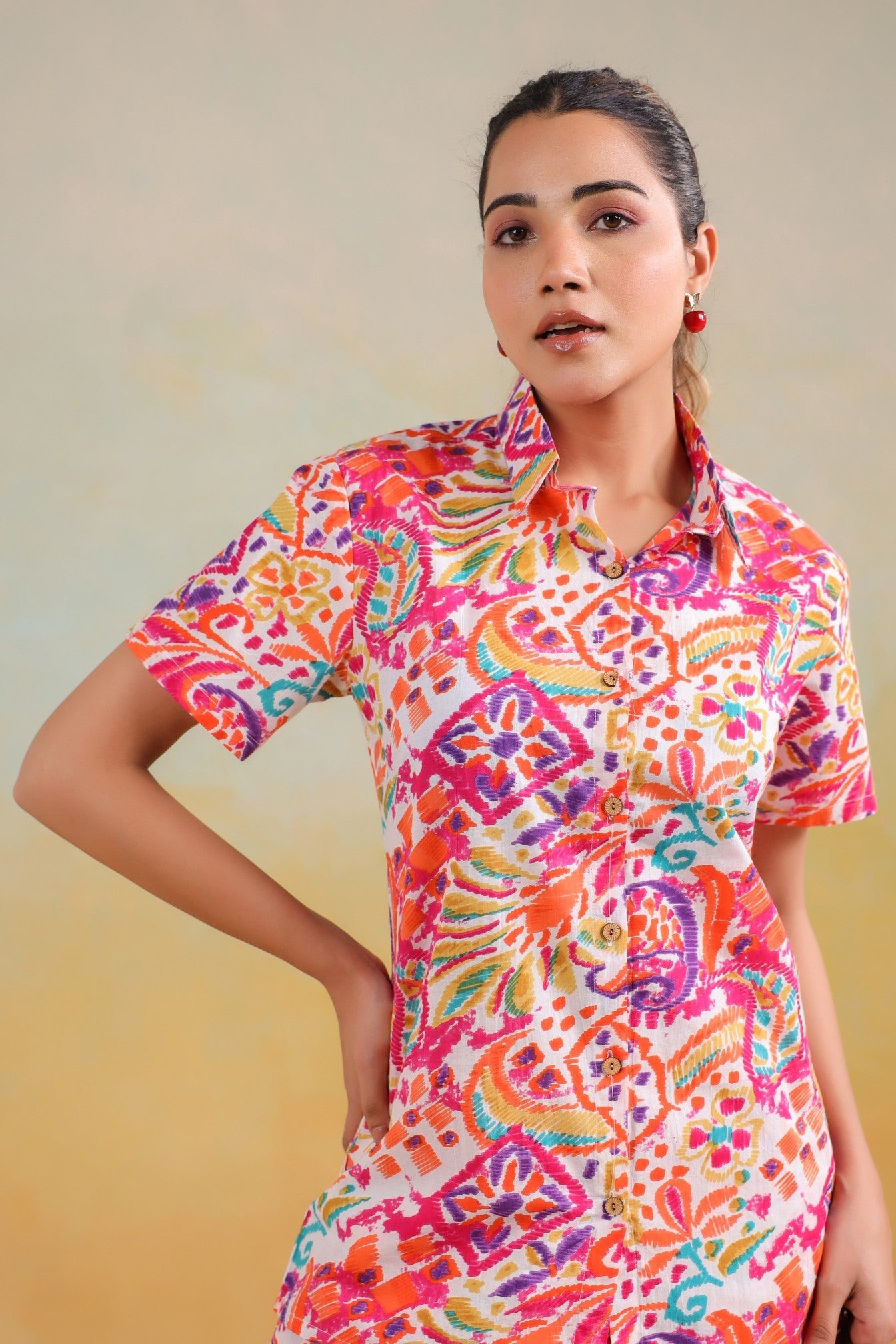 Step into a world of color and comfort with the Sunset Mirage Co-ord Set, a radiant expression of boho-chic elegance. Designed with an intricate blend of vivid hues, this ensemble embodies a free-spirited charm, making it a must-have for your summer wardrobe.