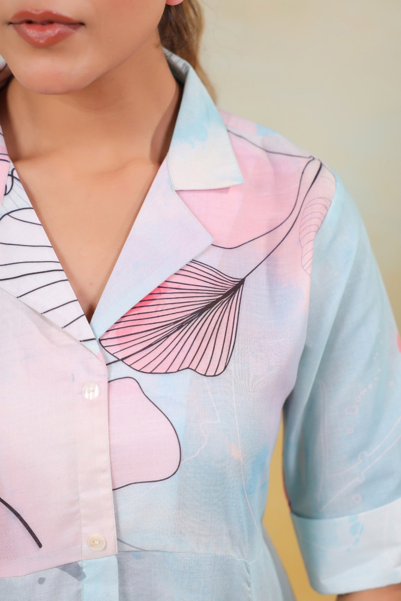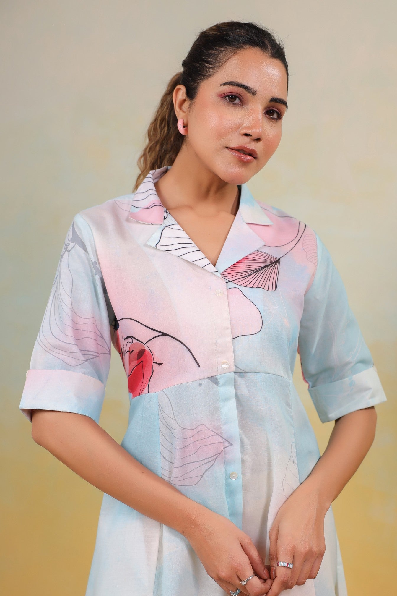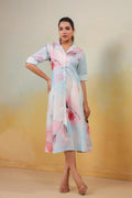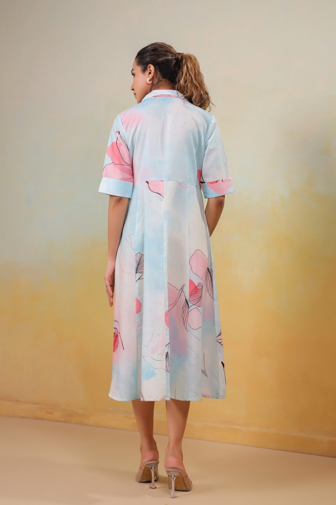 Step into serene elegance with the Ethereal Bloom Midi Dress – a masterpiece of effortless sophistication. This enchanting dress features delicate watercolor florals on a soft pastel base, evoking a sense of dreamy romance. The tailored fit, structured collar, and flowing silhouette make it the epitome of refined femininity.