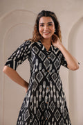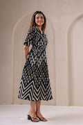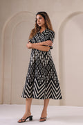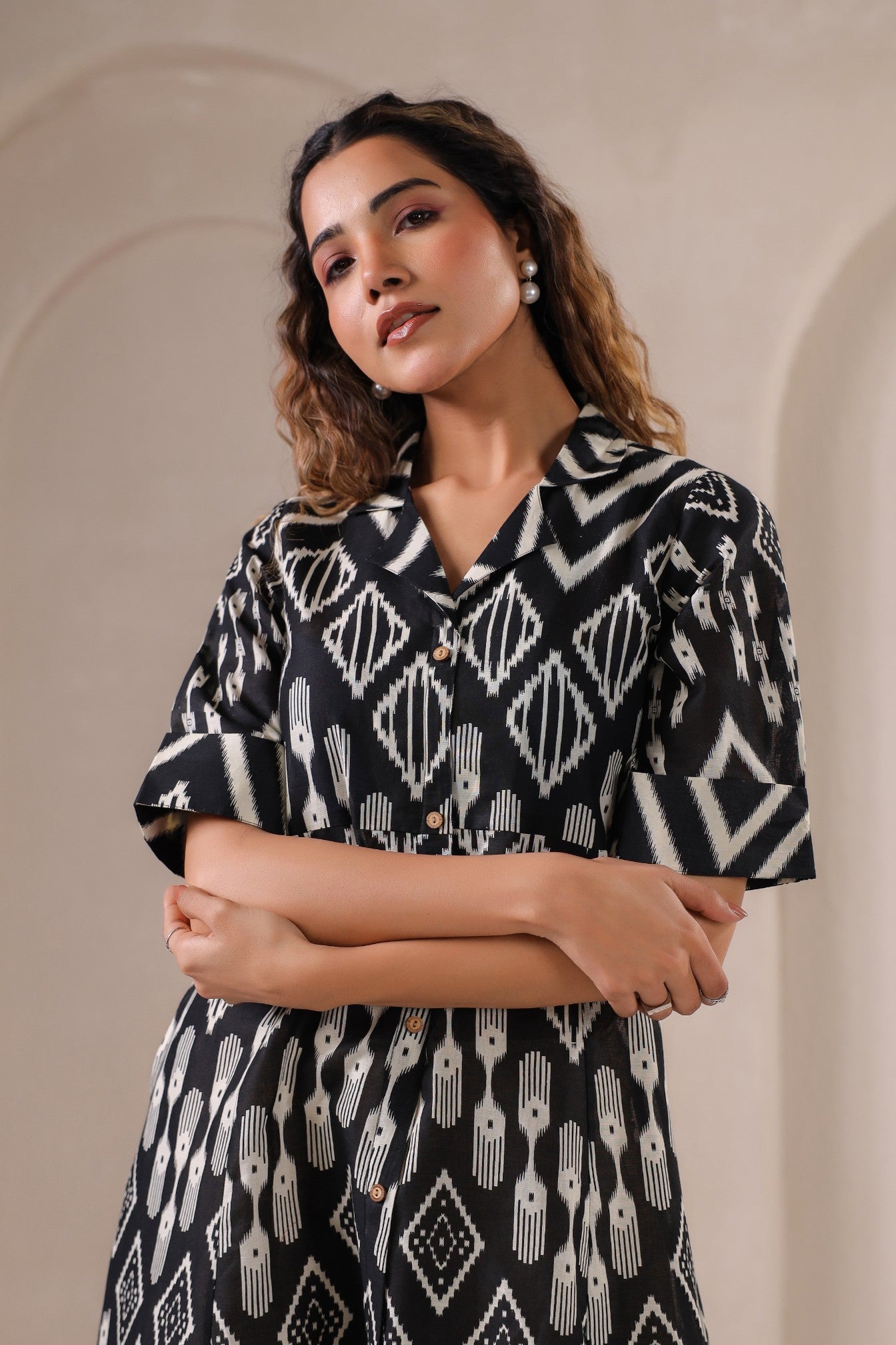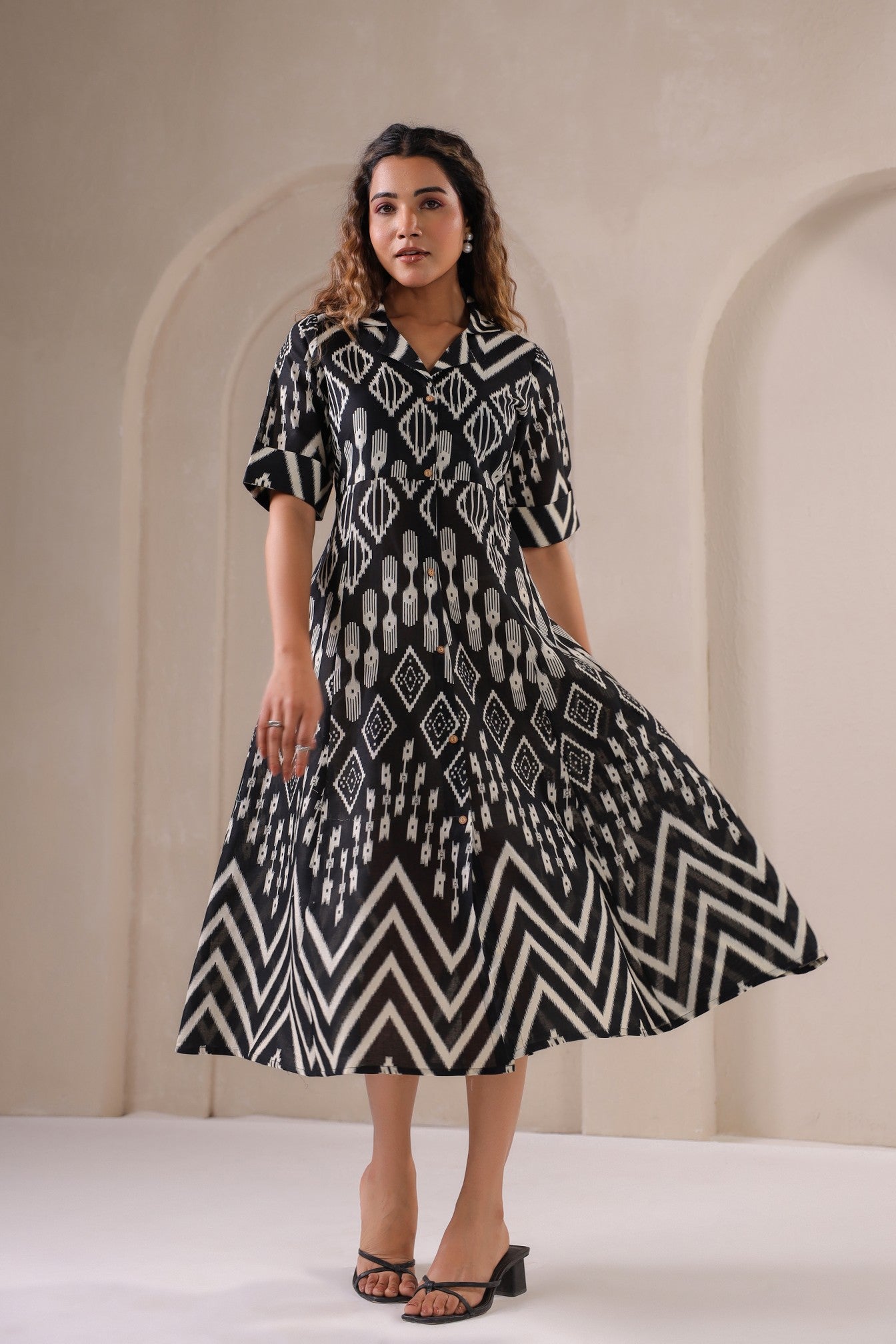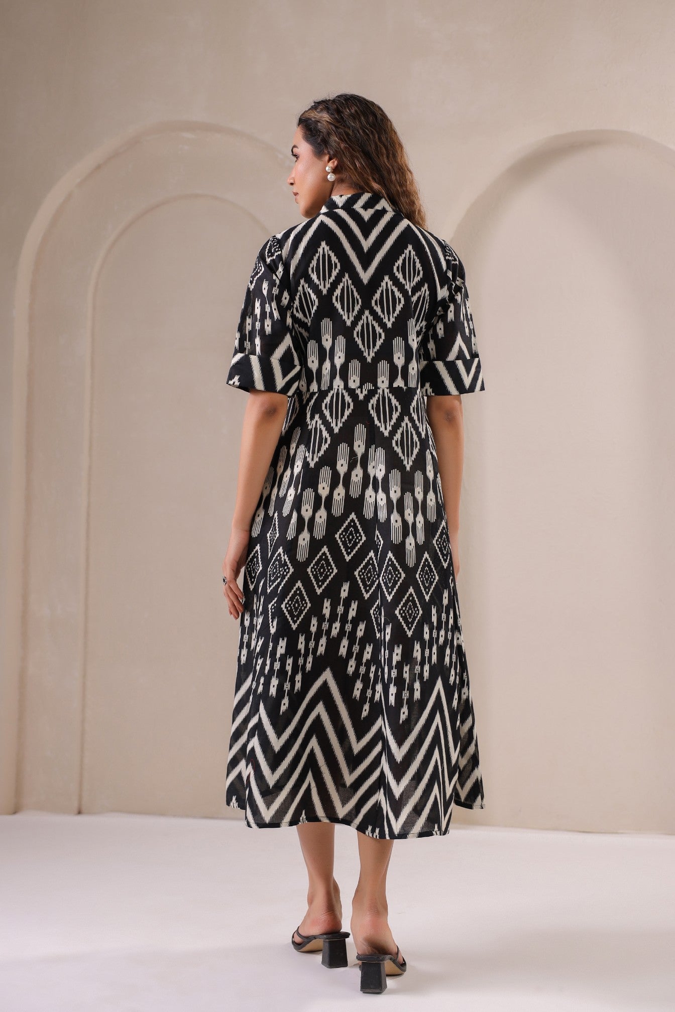 Unleash the power of monochrome with the Noir Majesty Midi Dress, where tradition meets modern sophistication. This stunning black & white Ikat dress boasts a mesmerizing handwoven-inspired print, a tailored collar, and a fluid A-line silhouette that flatters every movement. Perfect for day-to-night elegance, this versatile piece ensures you stand out with effortless grace.