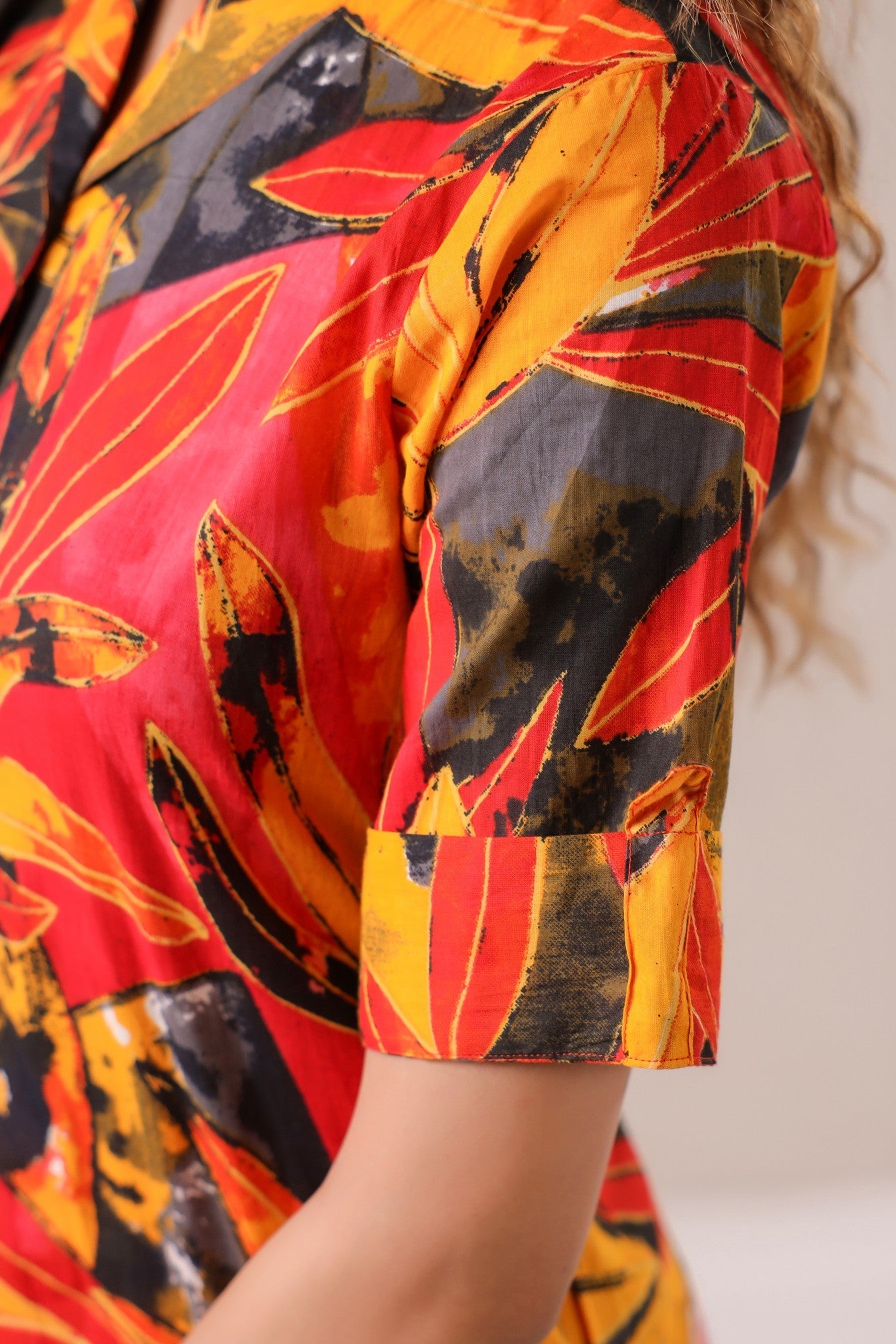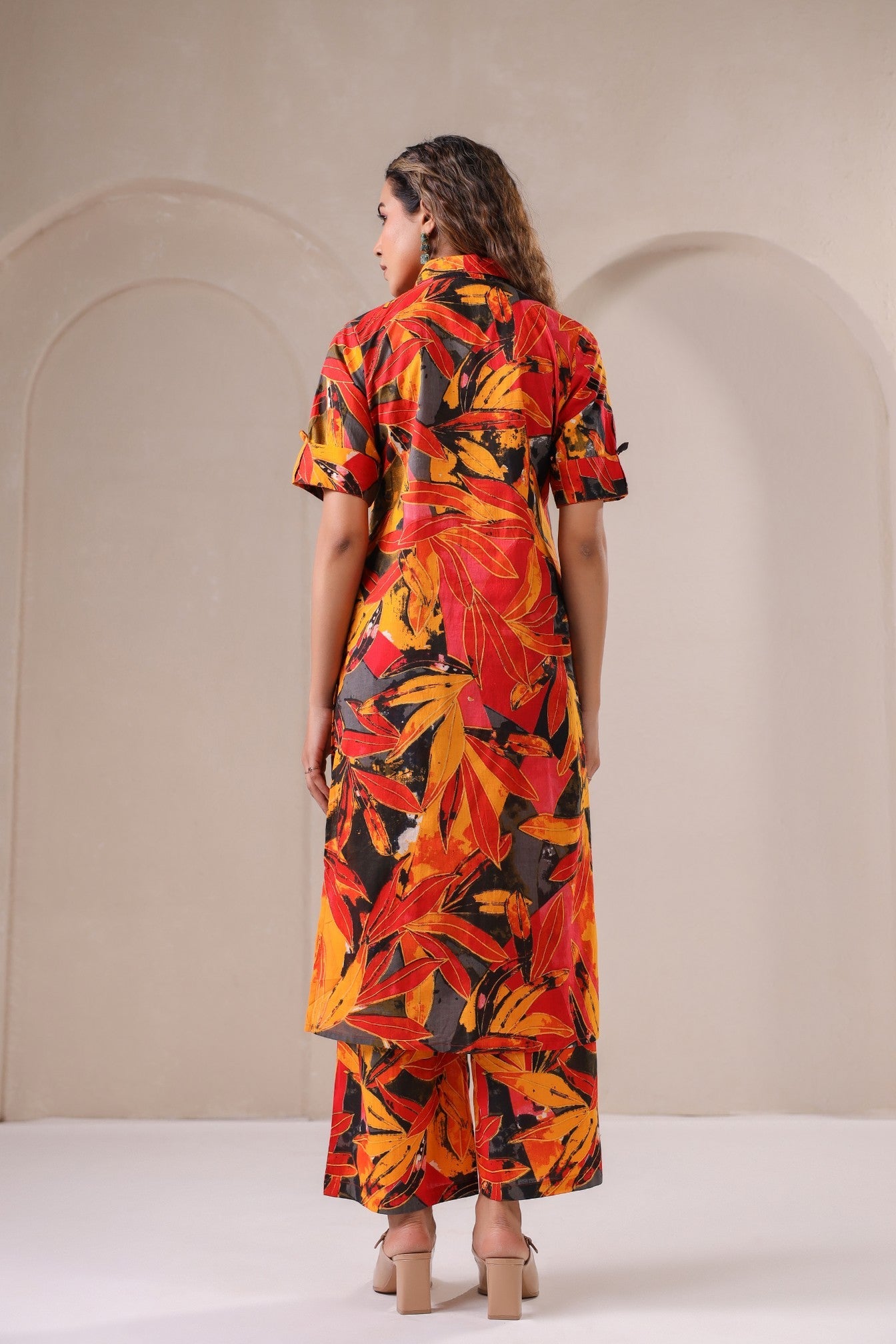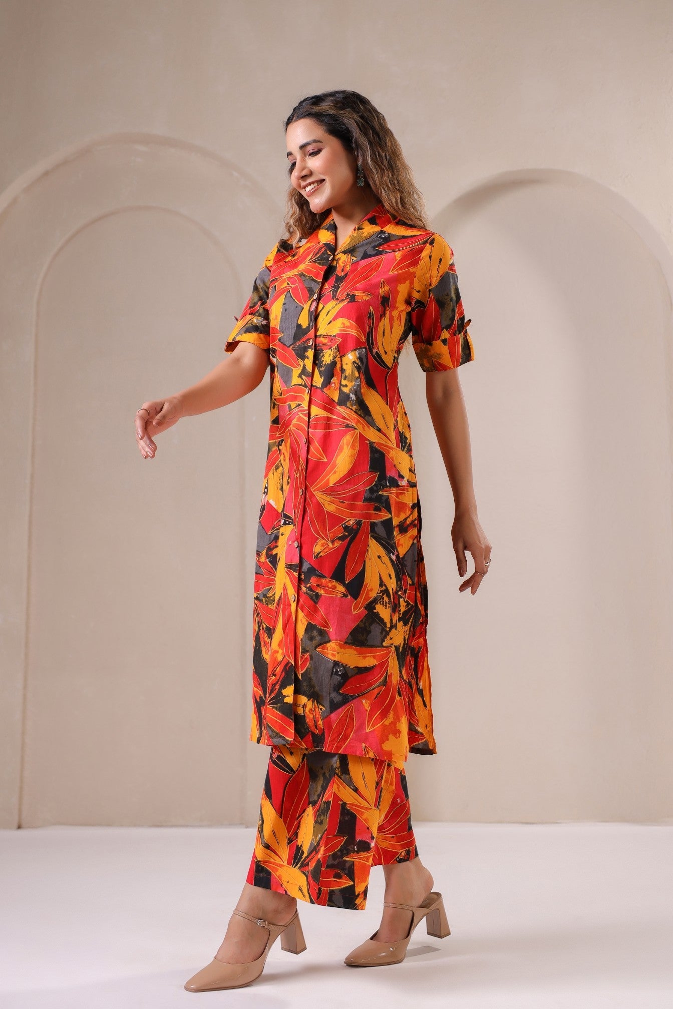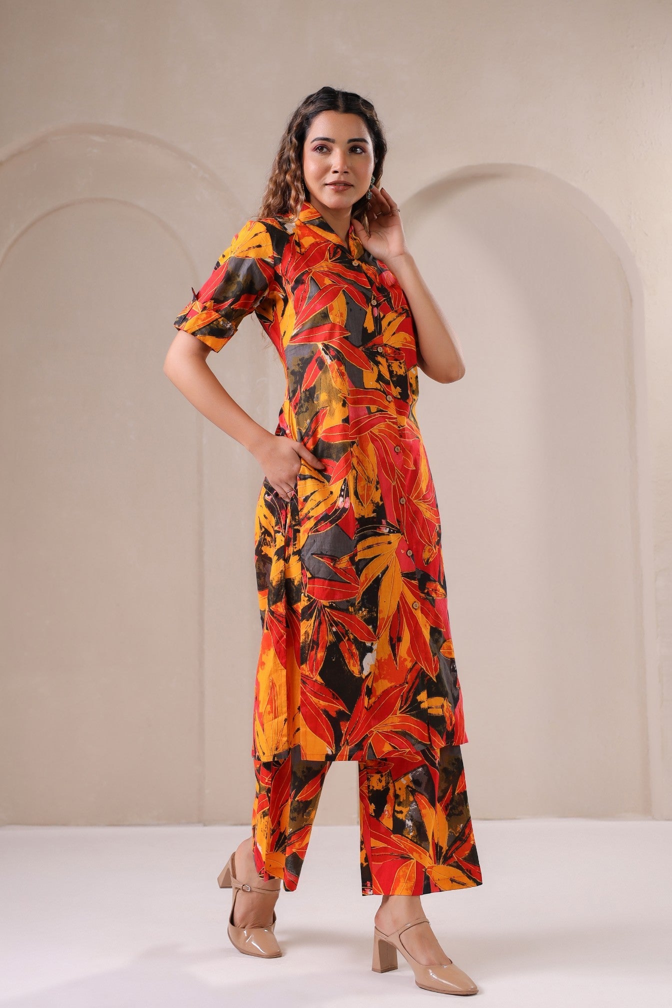 Drape yourself in the warmth of autumn hues with the Ember Bloom Co-Ord Set, a celebration of bold prints and timeless elegance. Featuring an eye-catching blend of deep reds, burnt oranges, and midnight blacks, this co-ord set is designed for the modern muse who loves to stand out. The structured button-down tunic pairs effortlessly with flowy straight-leg pants, creating a silhouette that is both sophisticated and effortlessly chic. Whether styled for an intimate gathering or a casual day out, Ember Bloom brings vibrance and energy to every step.