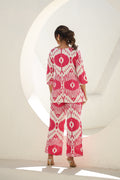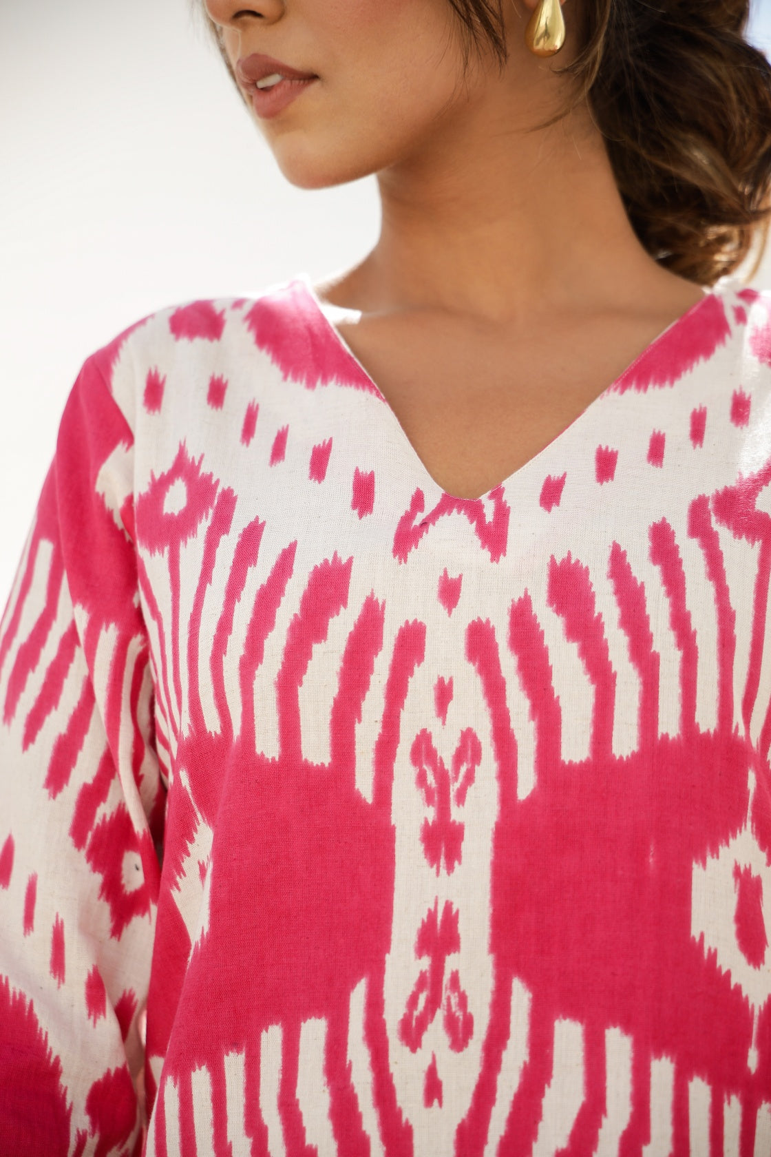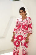 Make a bold statement with this pink & white ikat print co-ord set, designed for style and comfort. The soft, breathable cotton fabric keeps you cool all day, while the modern V-neck top with three-quarter sleeves and wide-leg pants create an effortlessly chic look. Perfect for brunches, vacations, casual outings, and day-to-night transitions.