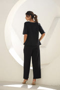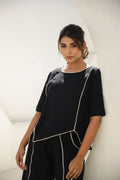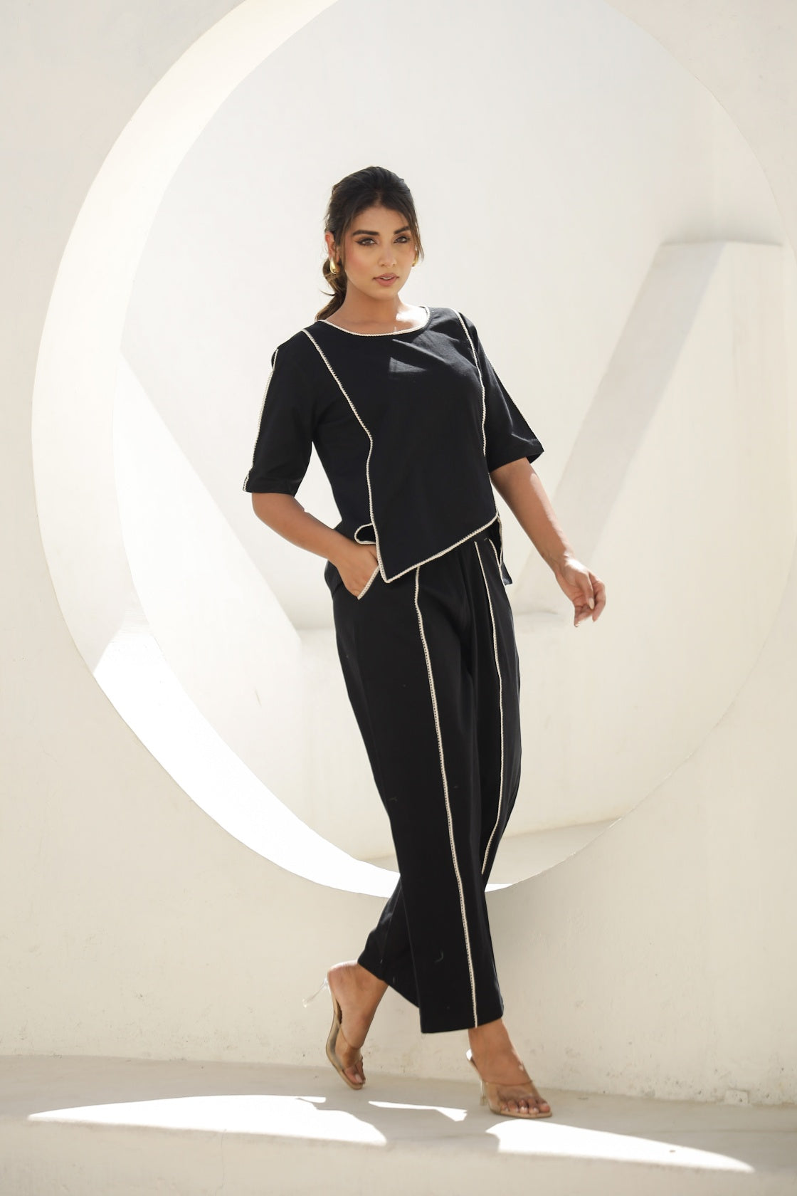 Upgrade your wardrobe with this chic black co-ord set, designed to blend elegance with modern style. The asymmetrical top features contrast white stitch detailing, giving it a structured yet effortless appeal. Paired with wide-leg pants featuring matching contrast stitching, this outfit is perfect for casual outings, office wear, or evening events.