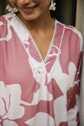 Step into breezy elegance with our Blush Pink & White Floral Co-Ord Set, tailored for the modern Indian woman. This two-piece outfit features a flowy V-neck top with intricate lace detailing at the neckline and sleeves, paired with wide-leg pants that offer both comfort and flair.