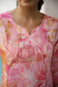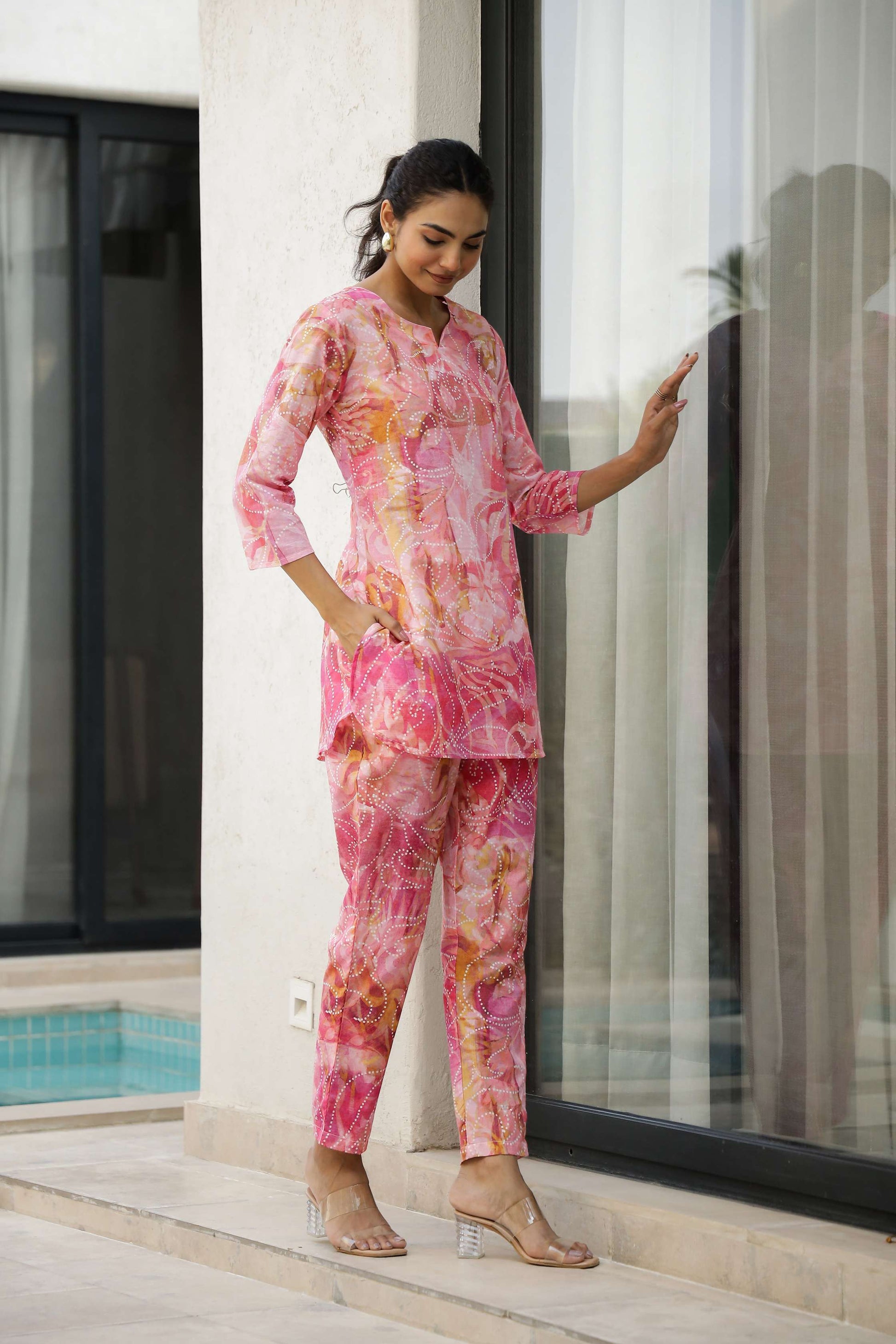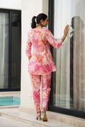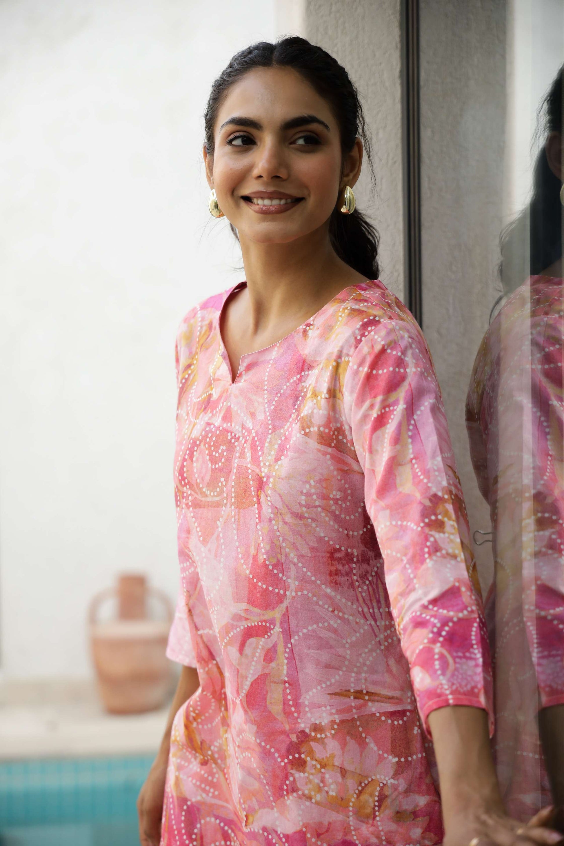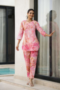 Brighten up your summer wardrobe with Label Flavia’s stunning Pink Floral Printed Co-Ord Set. Crafted in breathable cotton fabric, this easy-breezy ensemble features a knee-length kurta with a delicate notched neckline, paired with tapered pants – both showcasing a vibrant mix of floral and abstract prints in shades of pink, peach, and white.