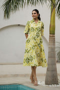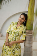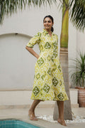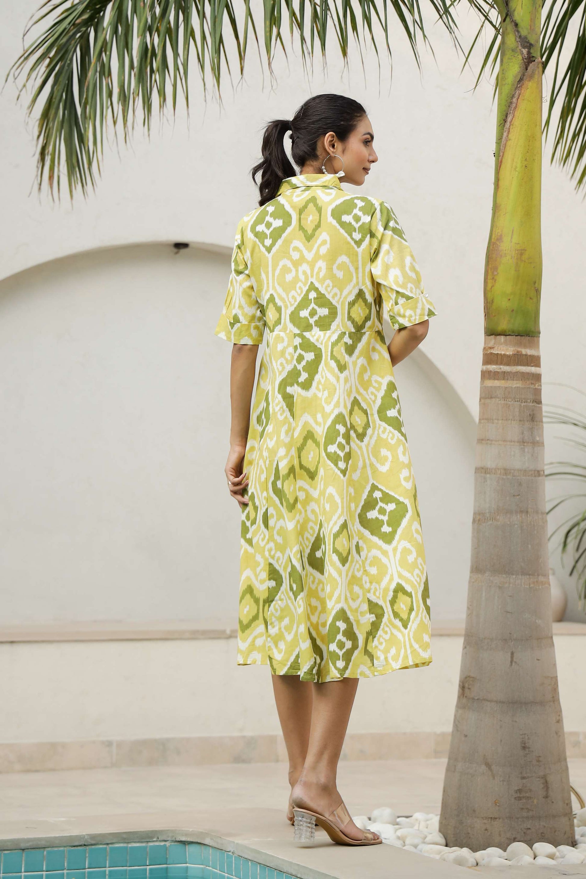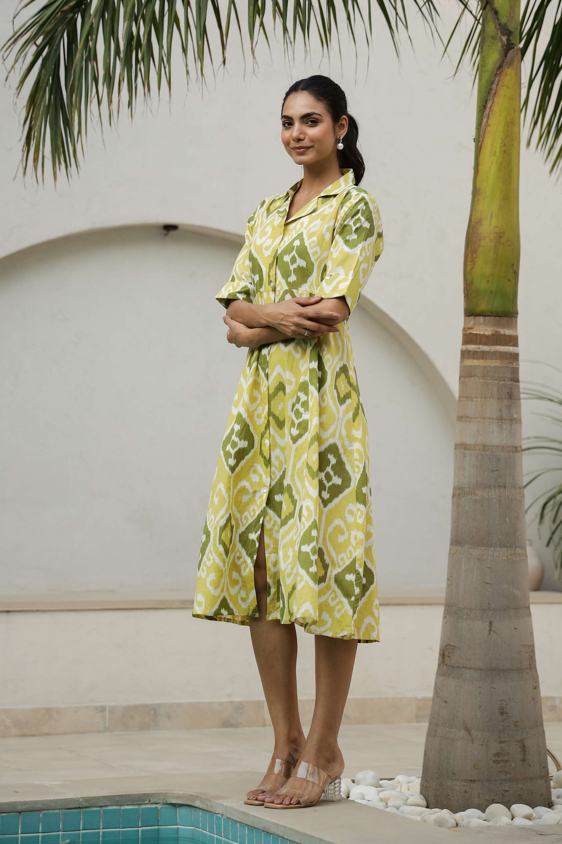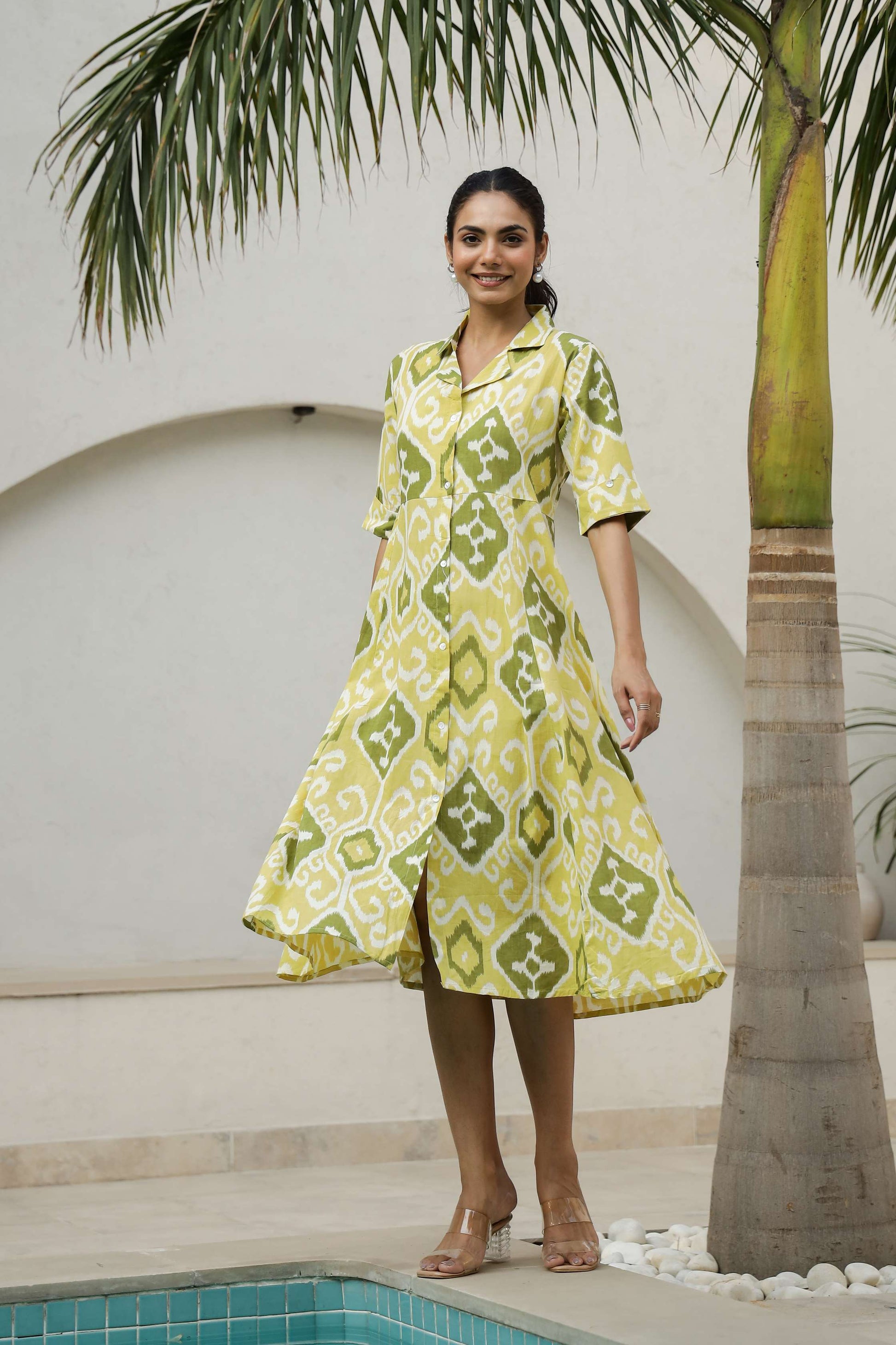 Green & Yellow Ikat Cotton Shirt Dress – Flared Midi