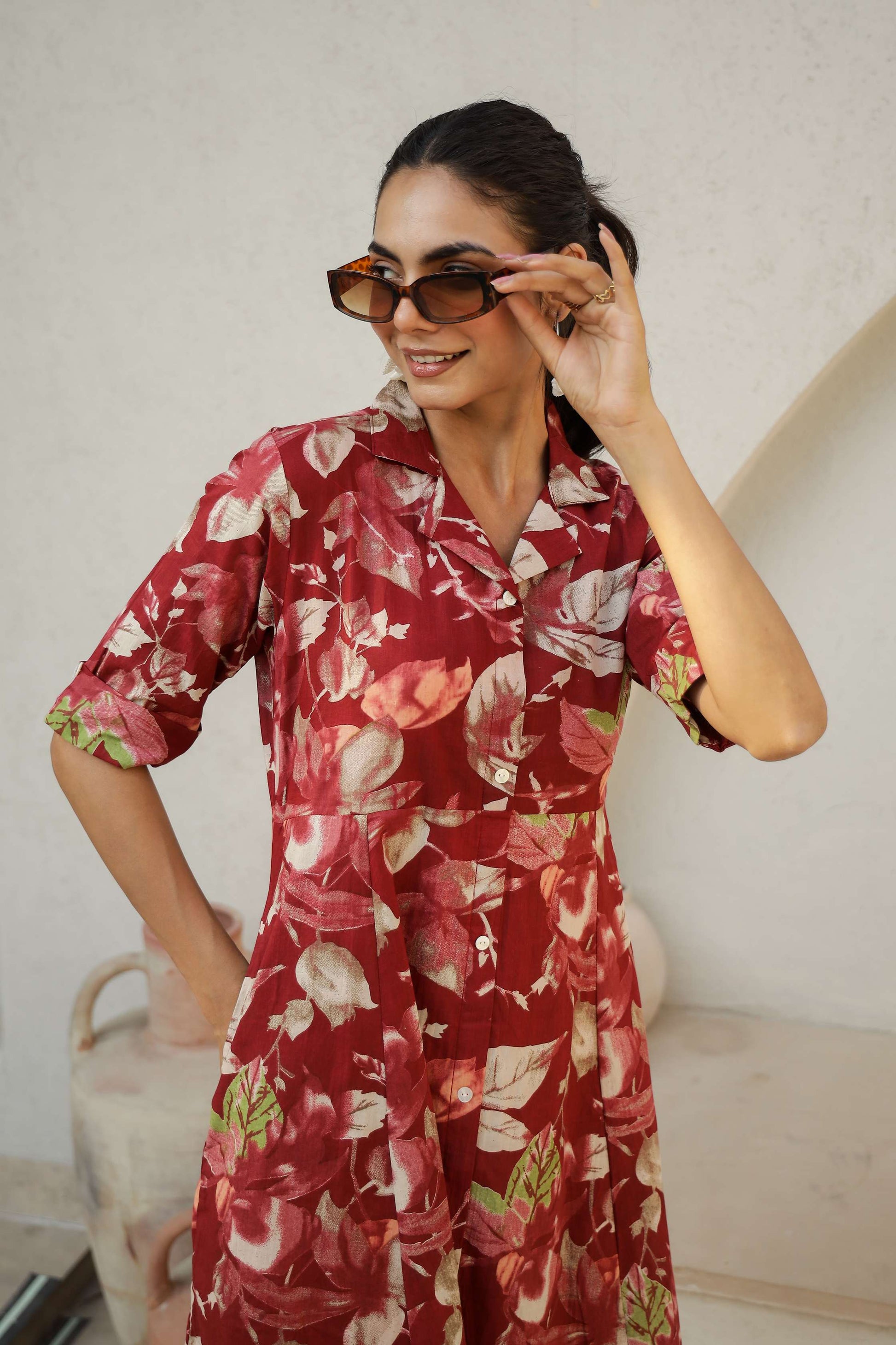 Fall in love with florals in our Red Floral Cotton Shirt Dress – a timeless midi dress perfect for breezy summer days and stylish brunch outings. Made from pure cotton, this piece blends sophistication with ease, featuring a flattering flared silhouette, classic shirt collar, and button-down front.