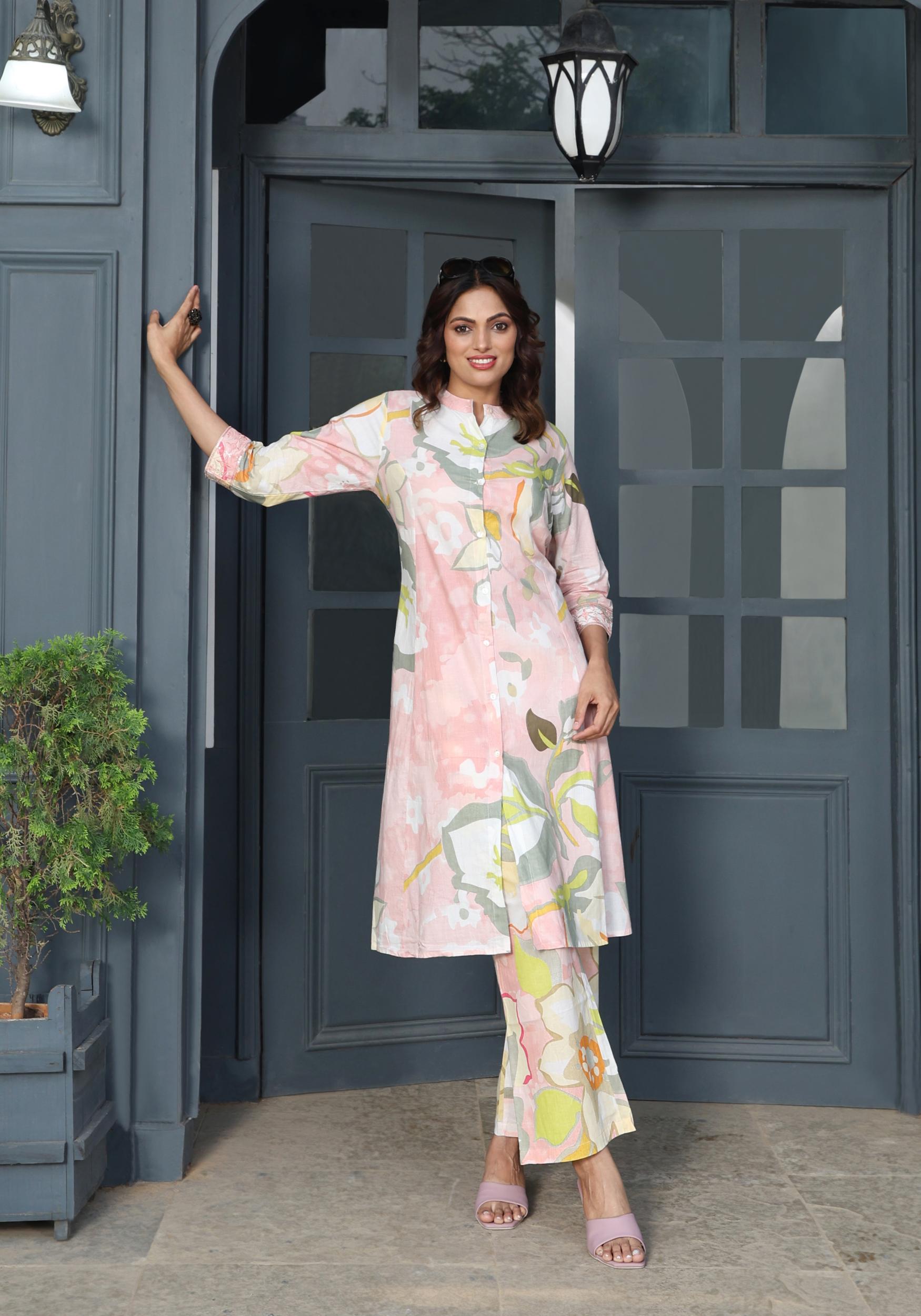 Elevate your everyday style with this pastel floral kurta set. Crafted in breathable cotton, the straight-fit kurta features a soft floral print, mandarin collar, and 3/4th sleeves. Paired with matching printed pants, it's a chic and comfortable choice for day outings or casual events.