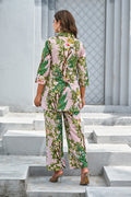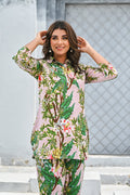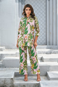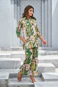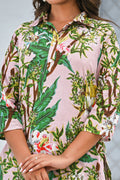 Step into effortless style with this pink tropical floral print co-ord set crafted from breathable cotton. The shirt features a relaxed fit with a button-down front and three-quarter sleeves, paired with matching wide-leg pants for all-day comfort. Perfect for casual outings, vacations, or summer gatherings, this set blends vibrant tropical prints with a soft pastel base for a chic, breezy look.