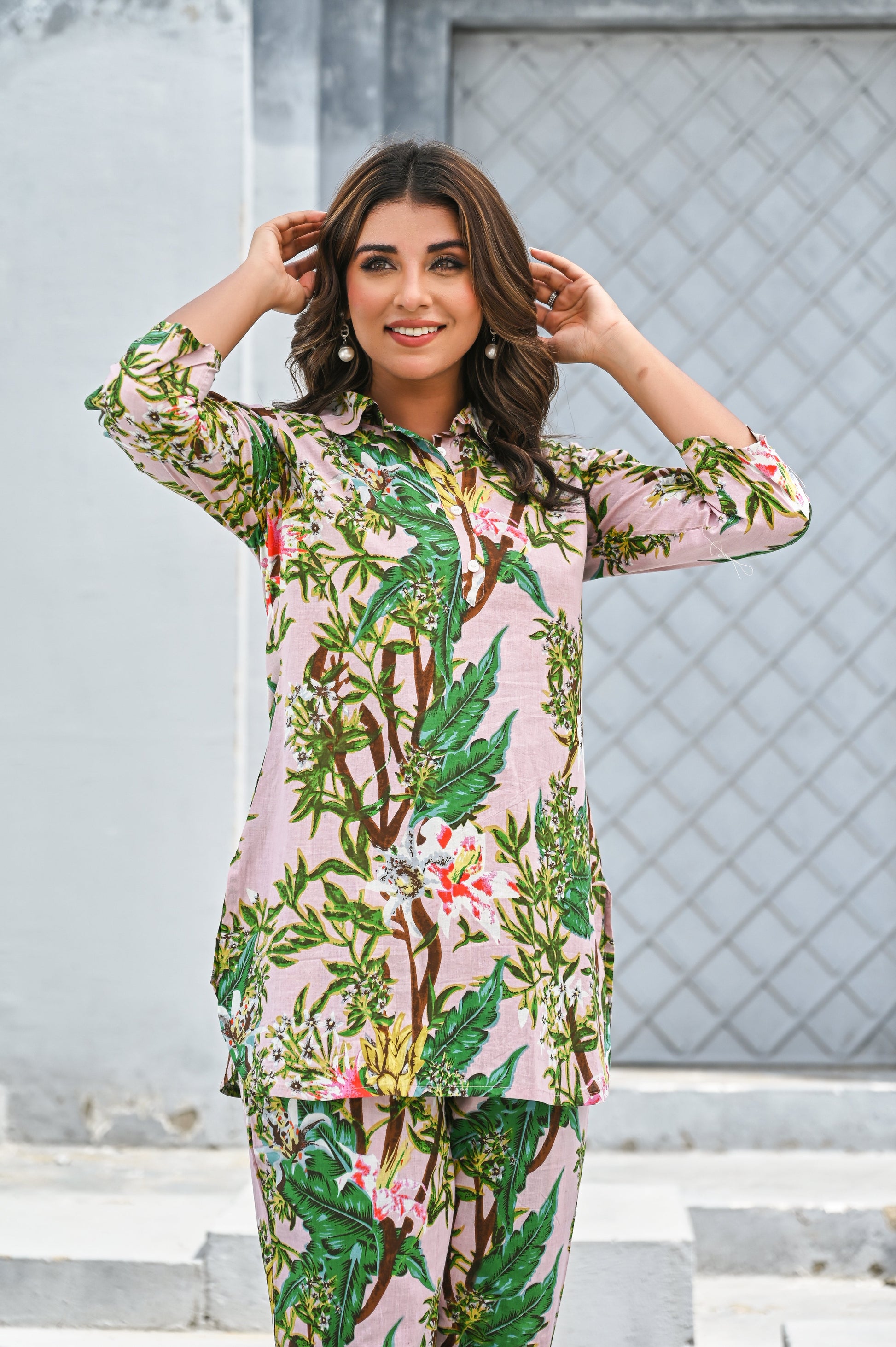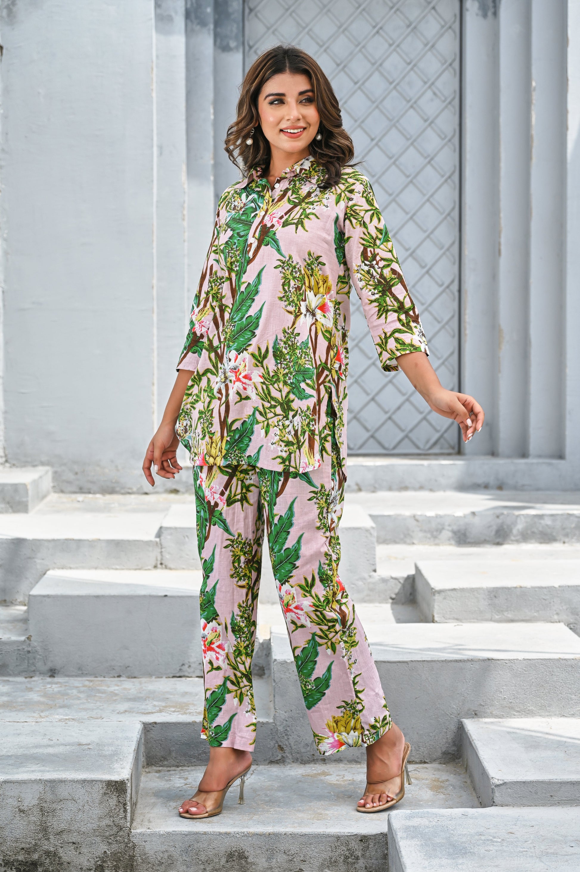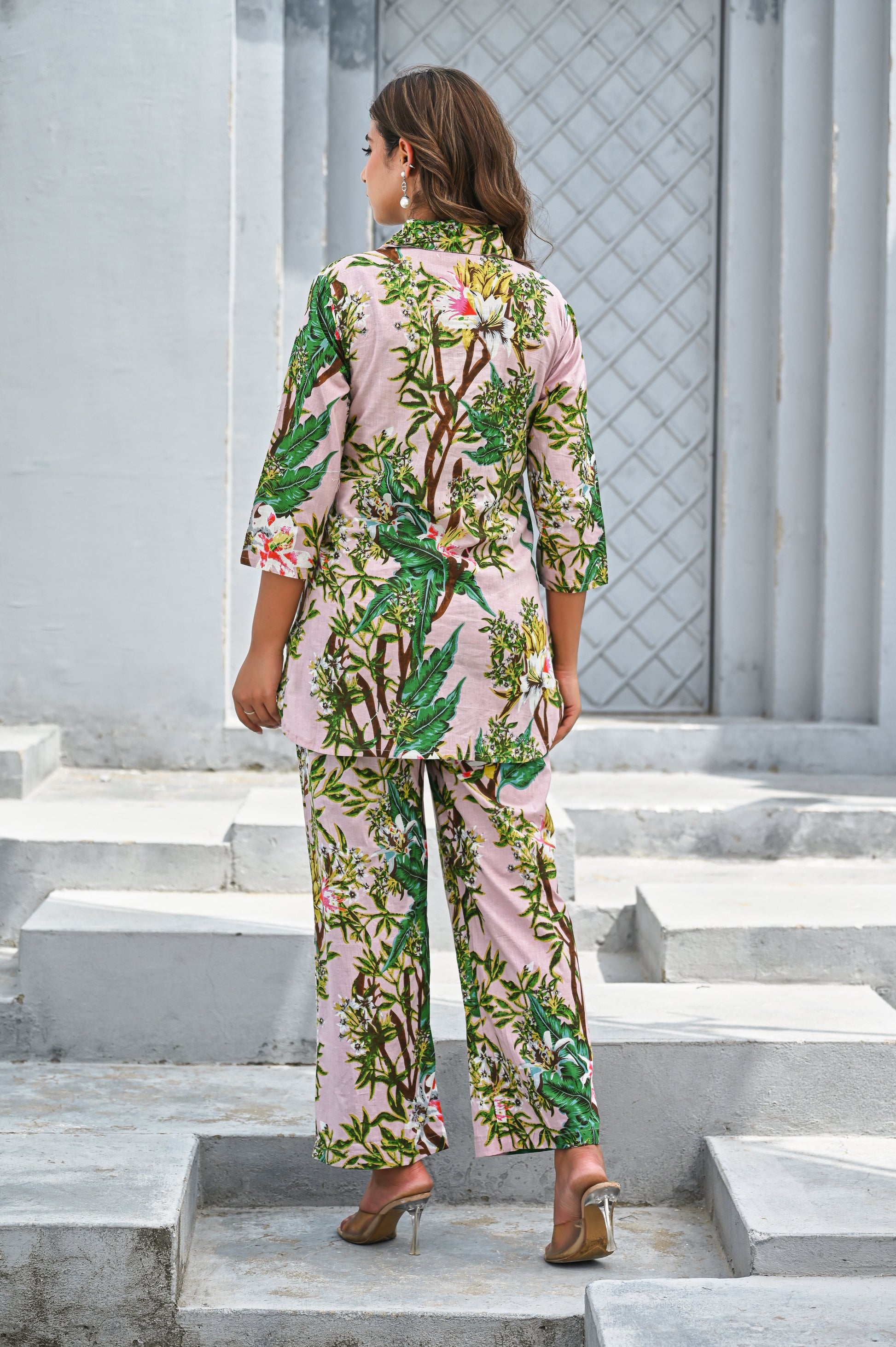 Women’s Pink Tropical Floral Print Co-ord Set – Cotton