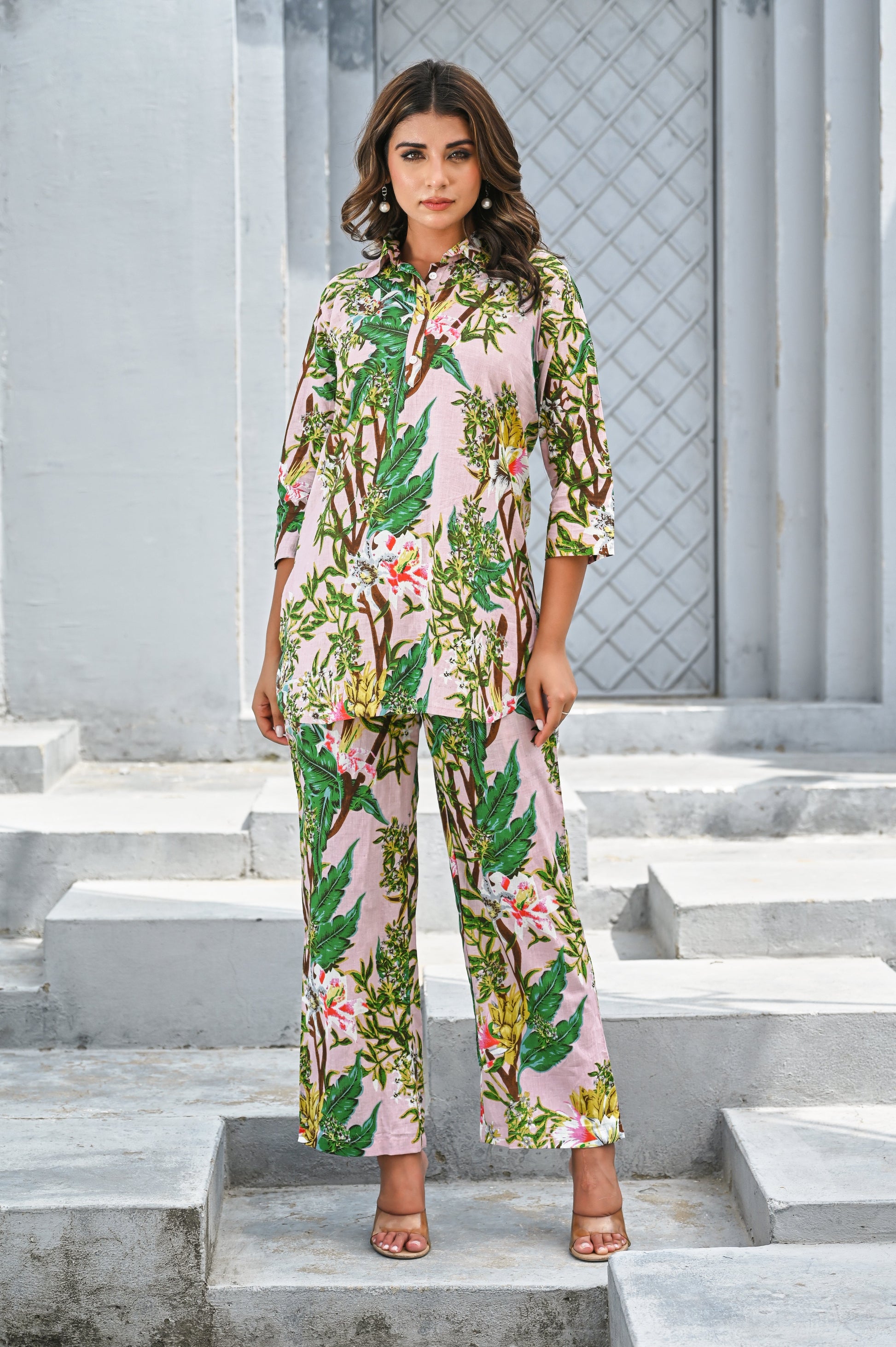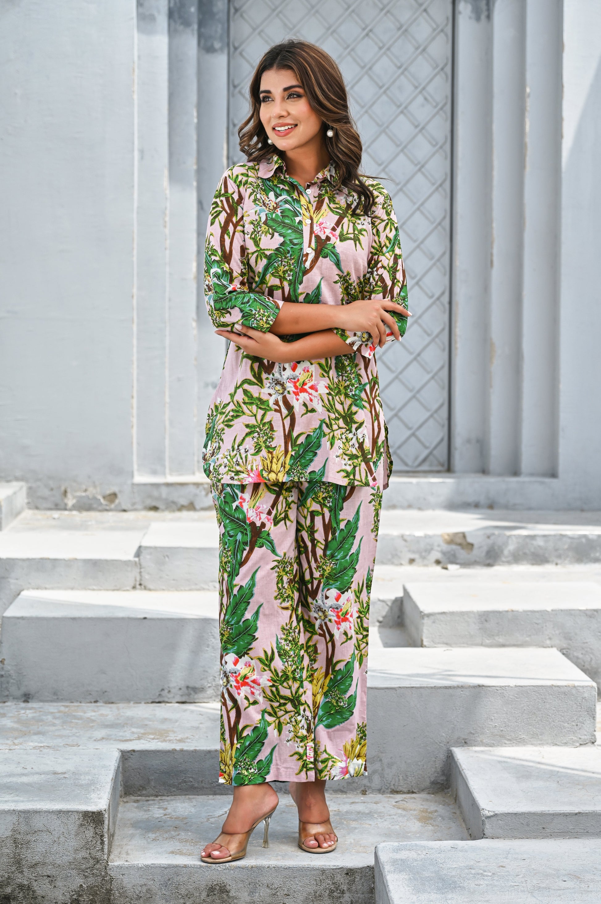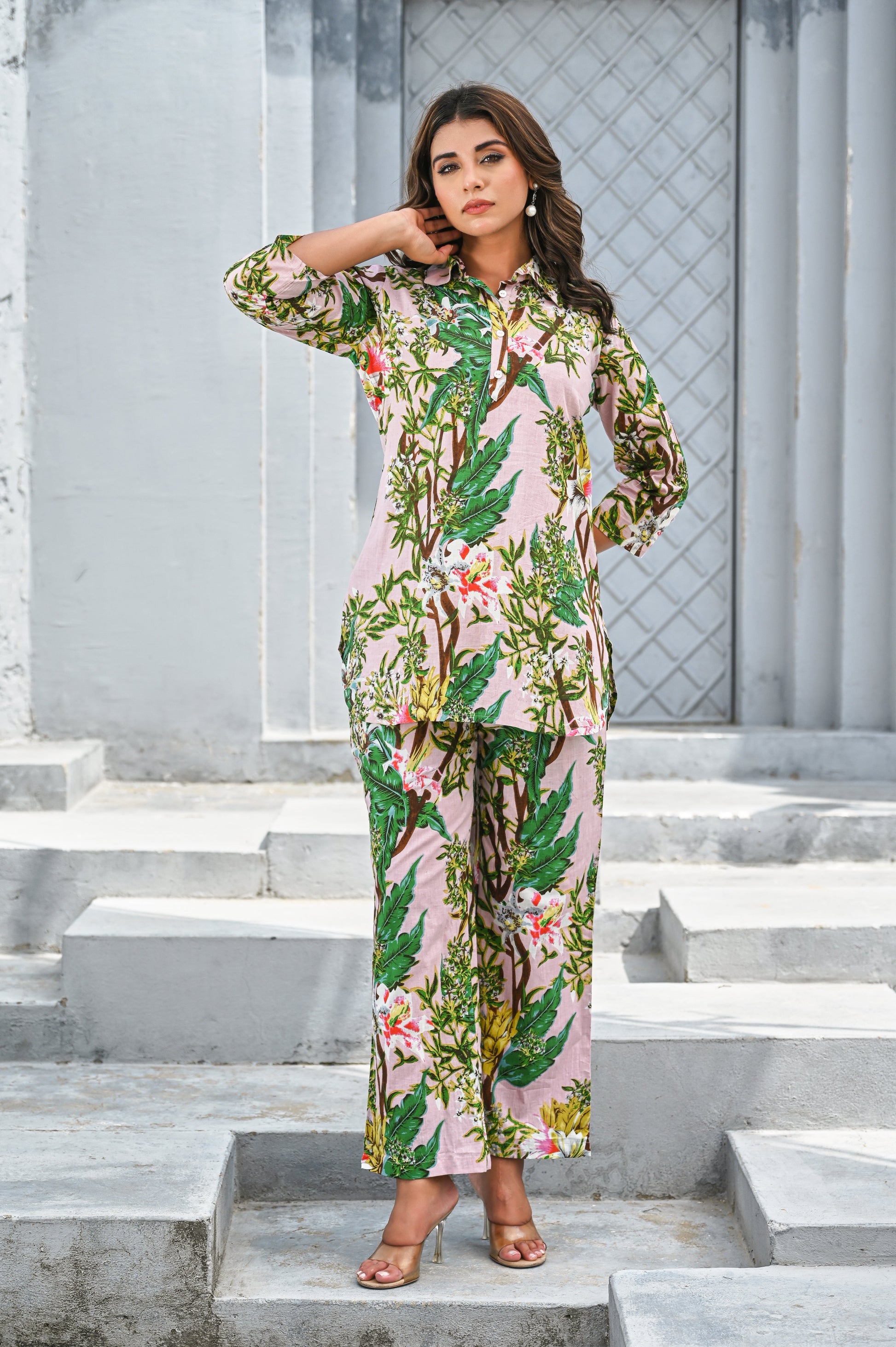 Women’s Pink Tropical Floral Print Co-ord Set – Cotton