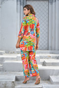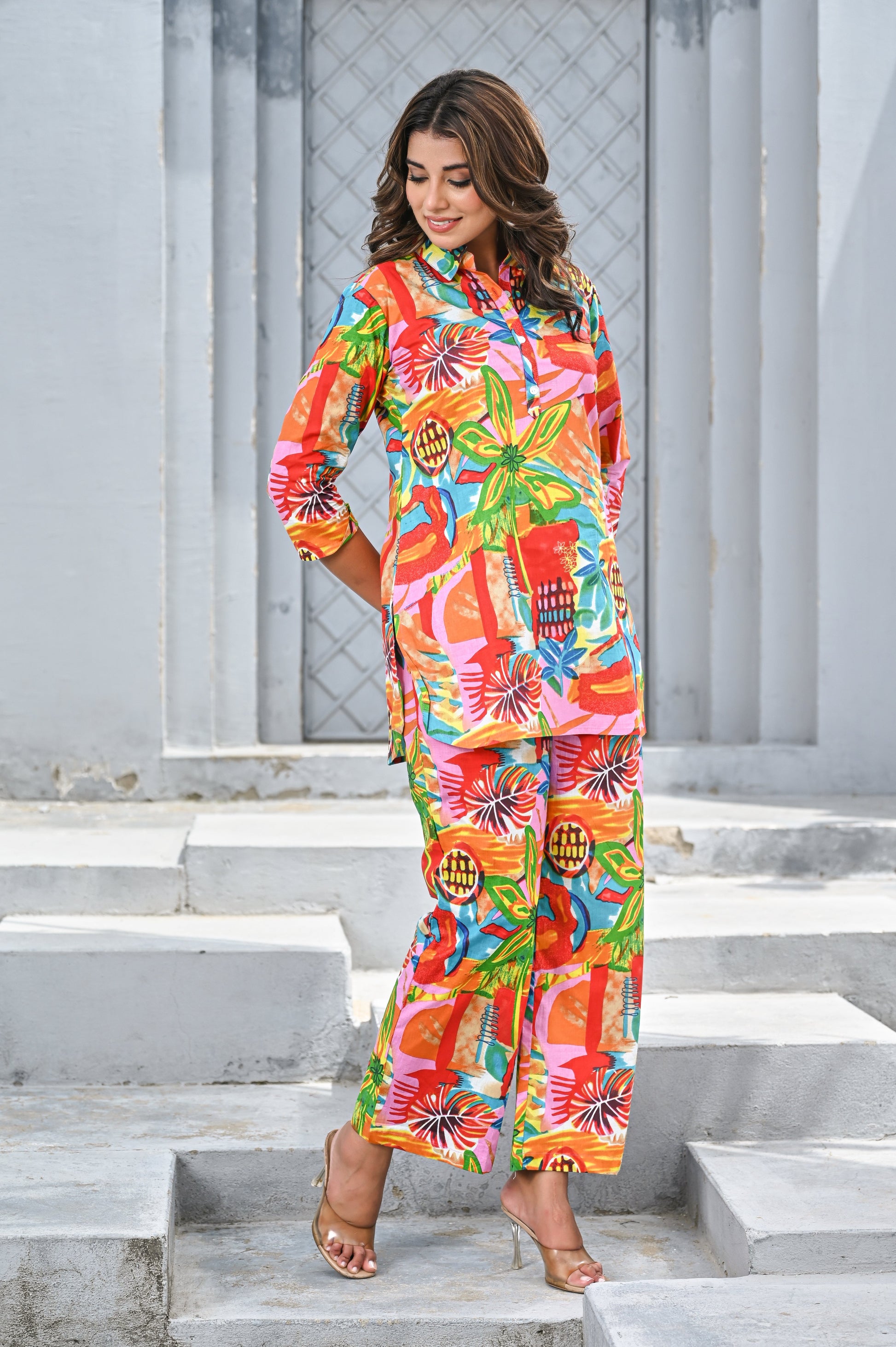 Women’s Multicolor Tropical Print Co-ord Set – Vibrant Shirt & Wide-Leg Pants