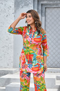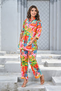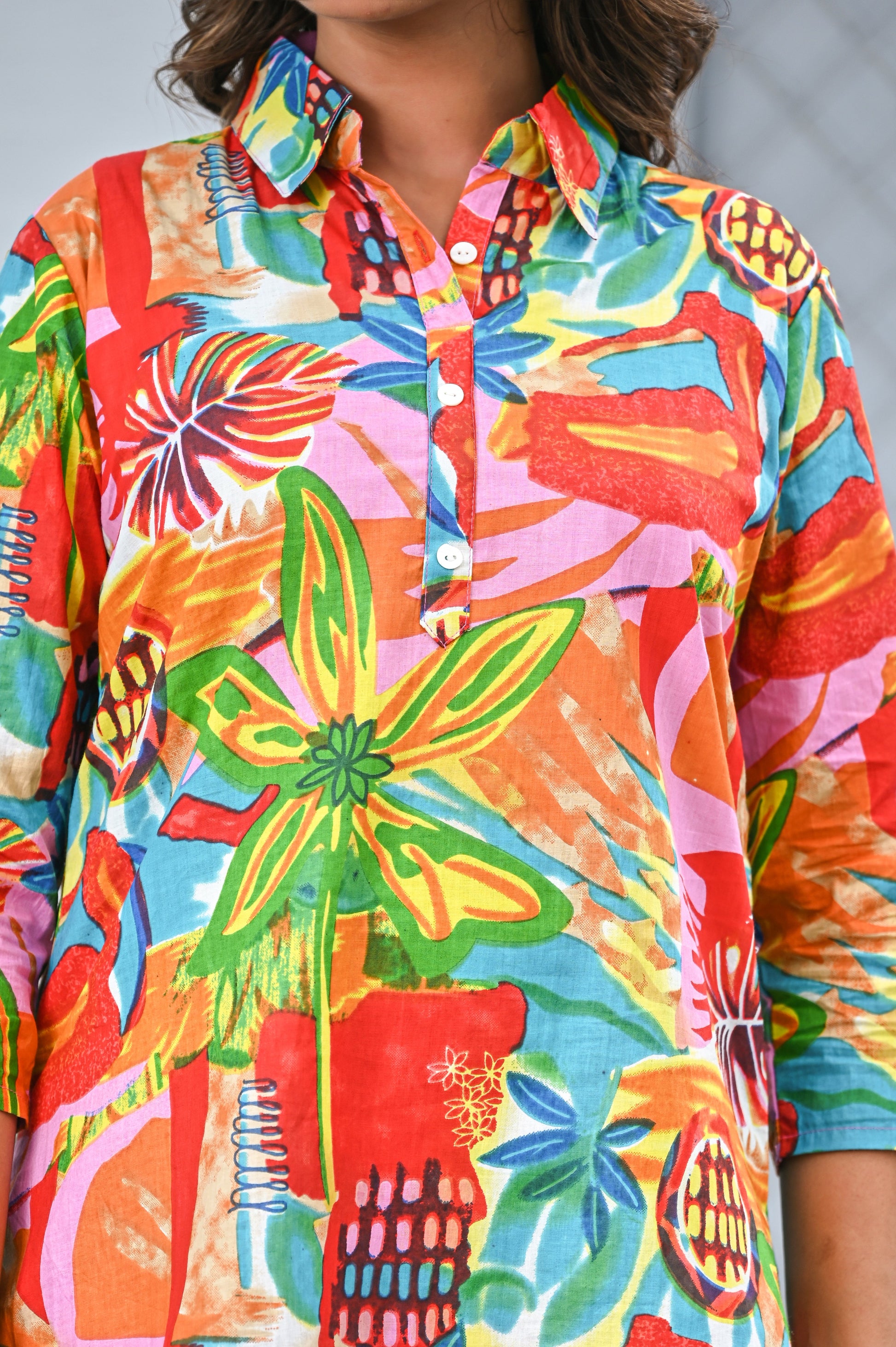 Turn heads with this bold and colorful tropical print co-ord set. Featuring a lively mix of vibrant colors and exotic motifs, the button-front shirt pairs perfectly with wide-leg pants for a playful yet chic look. Ideal for vacations, summer outings, or adding a pop of color to your everyday wardrobe.