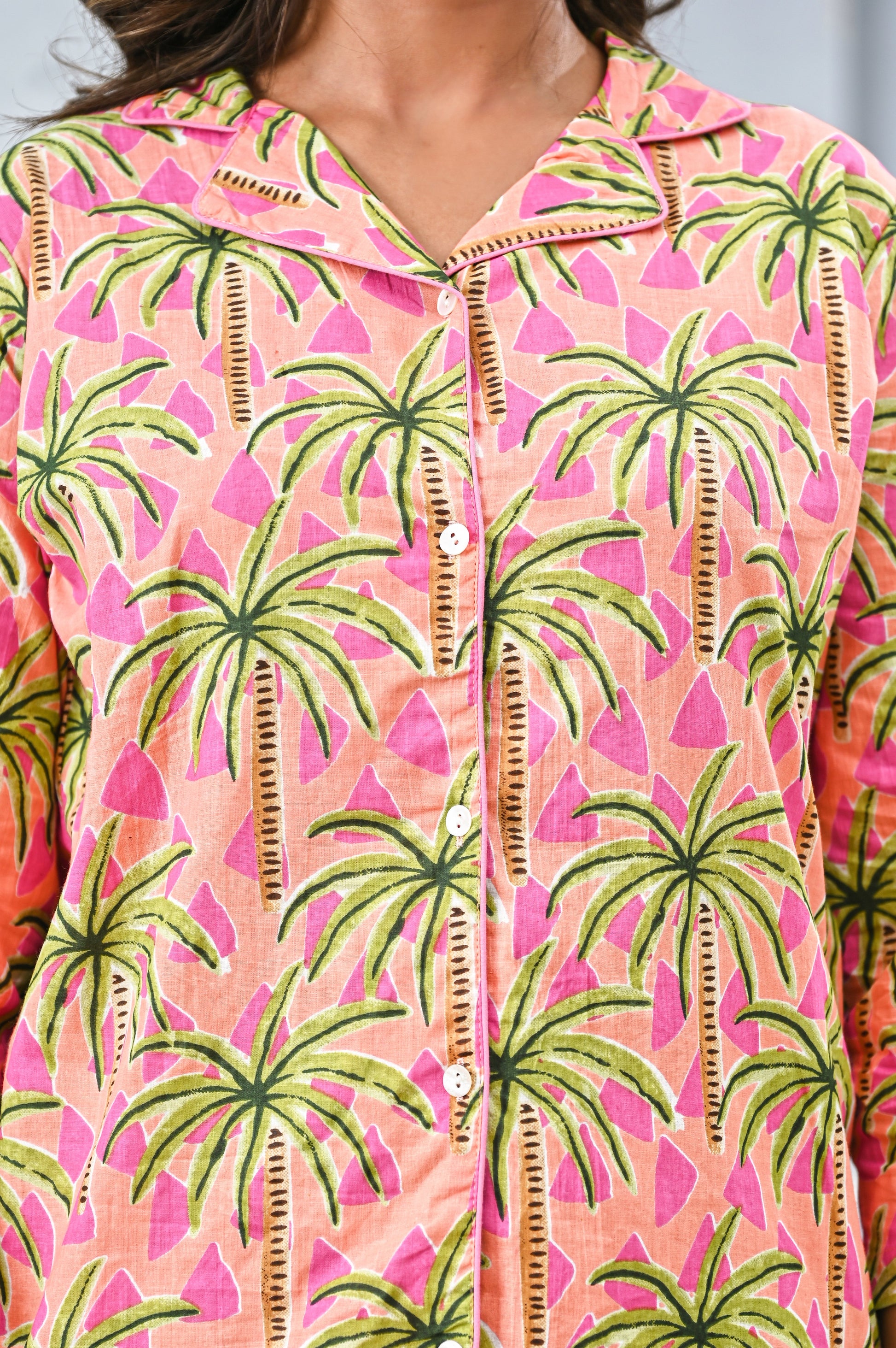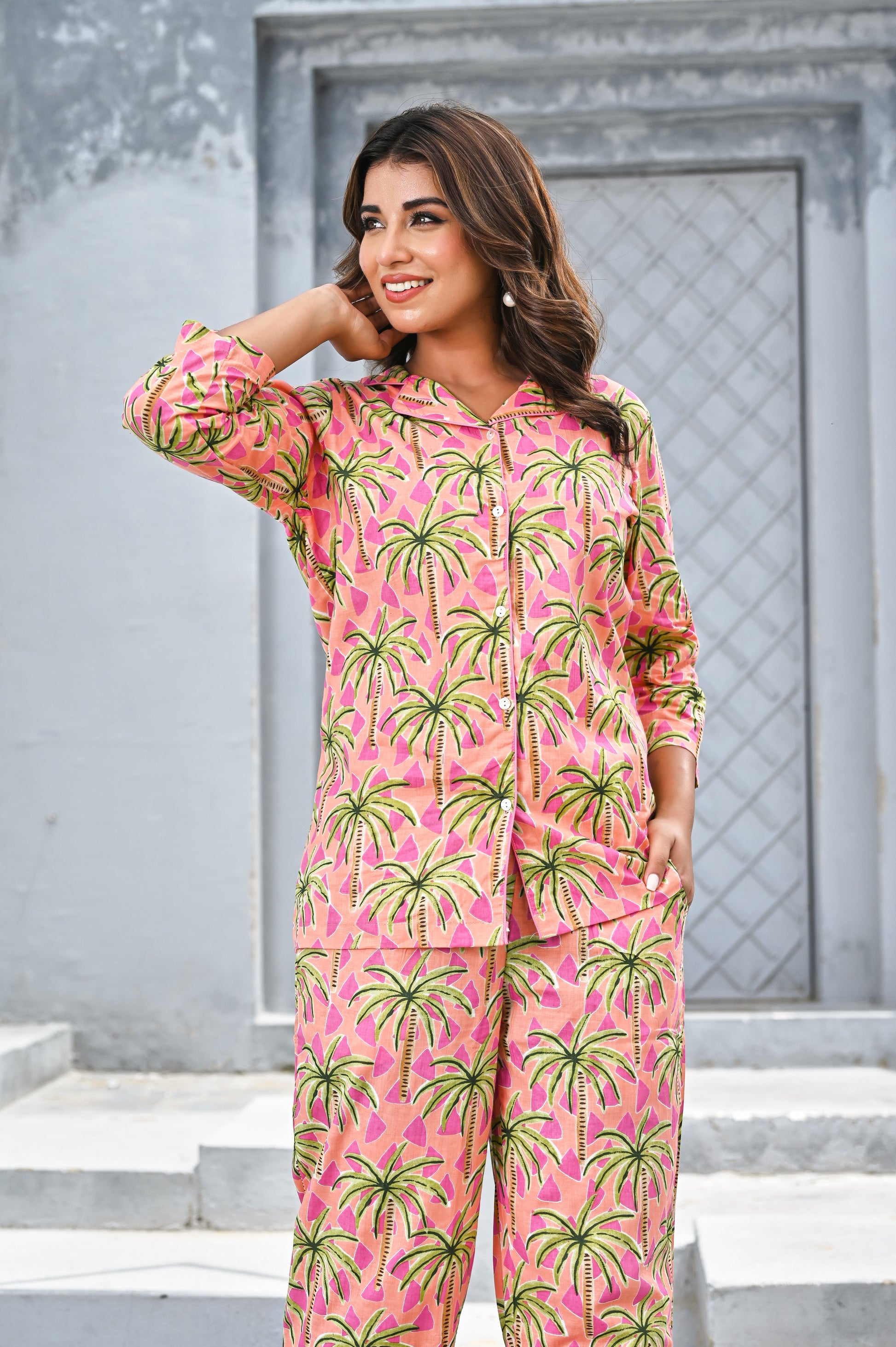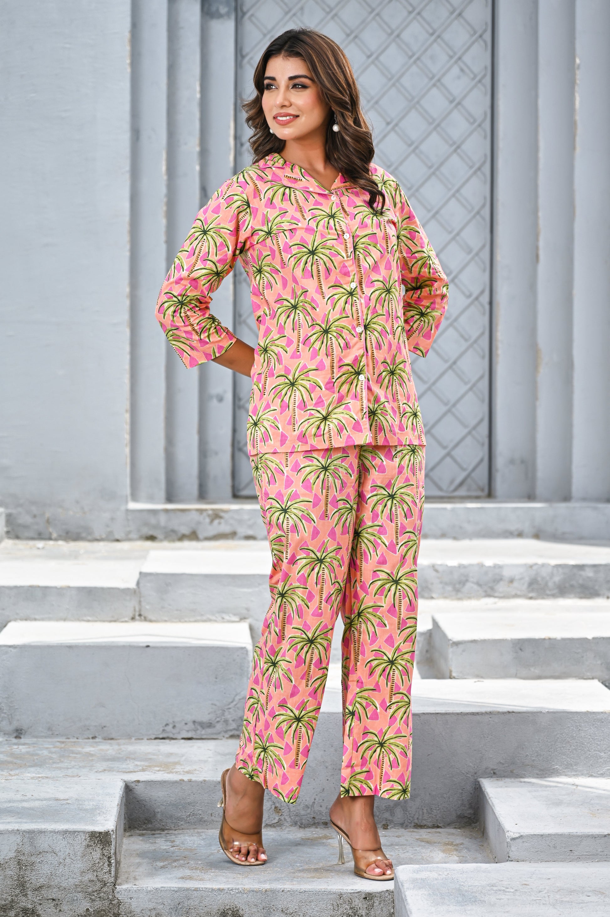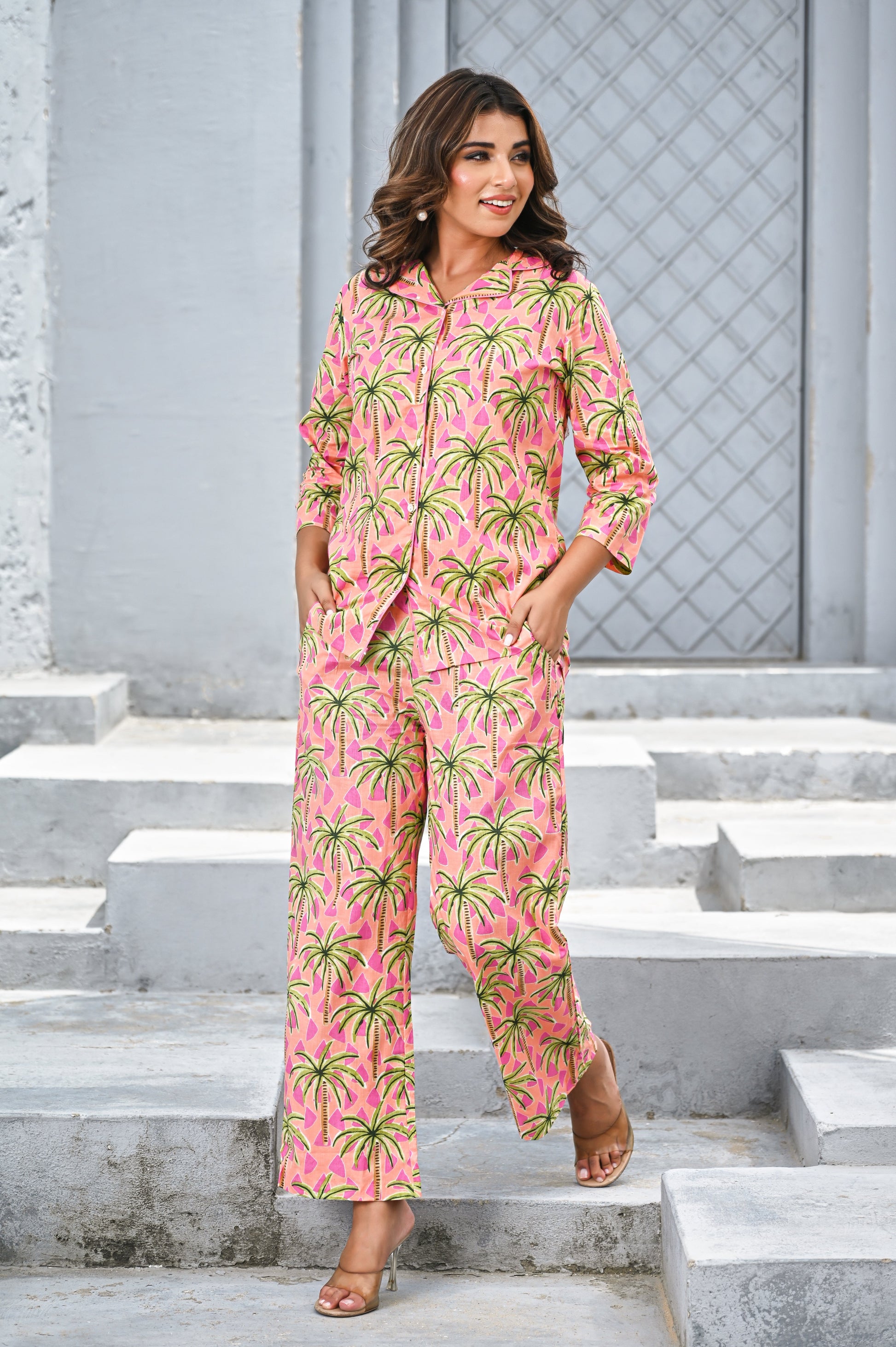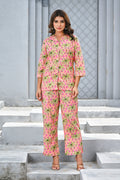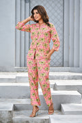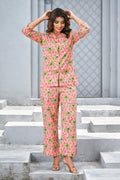 Bring vacation vibes to your everyday style with this vibrant pink tropical co-ord set. Featuring lush green palm prints over a bright pink base, the relaxed-fit shirt with 3/4 sleeves pairs effortlessly with comfortable straight-leg pants. Perfect for resort wear, brunch outings, or lounging in colorful style.