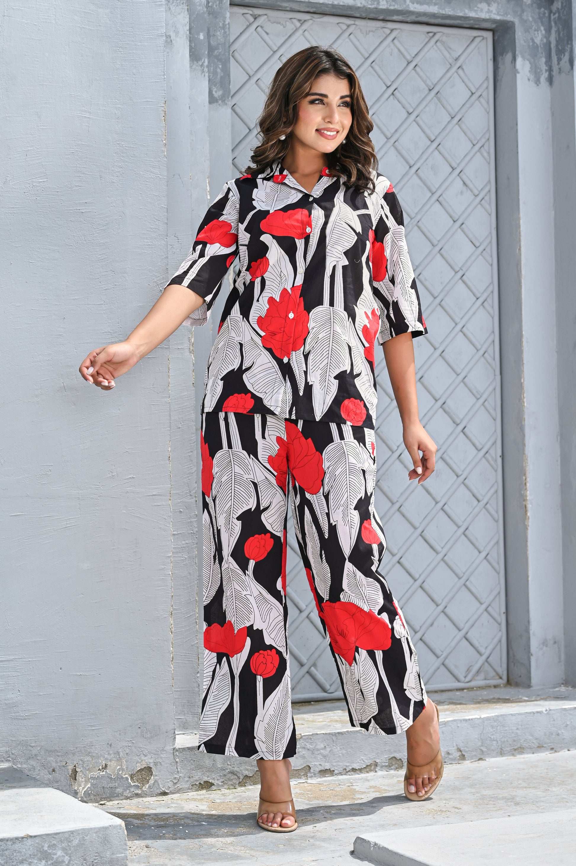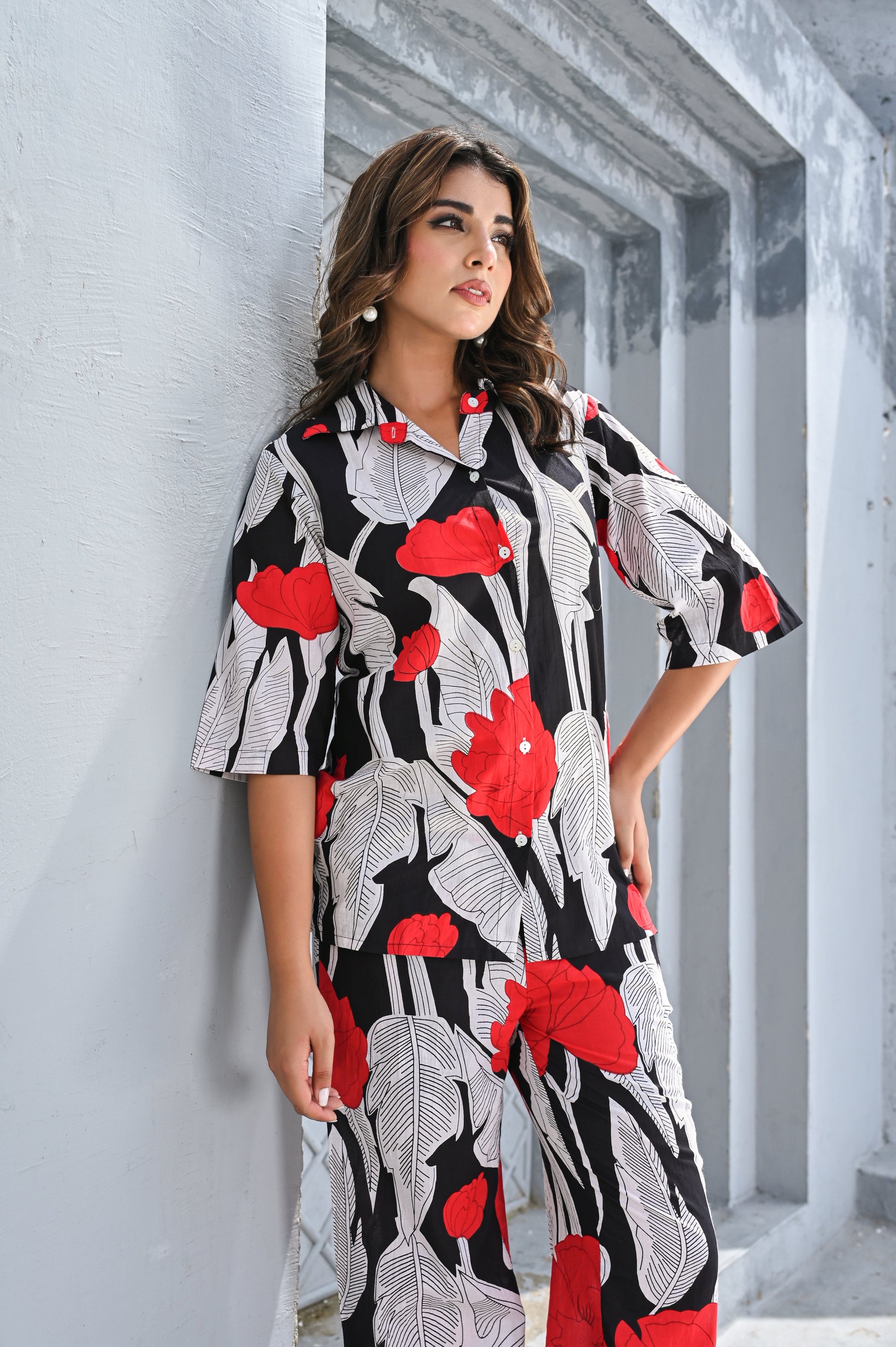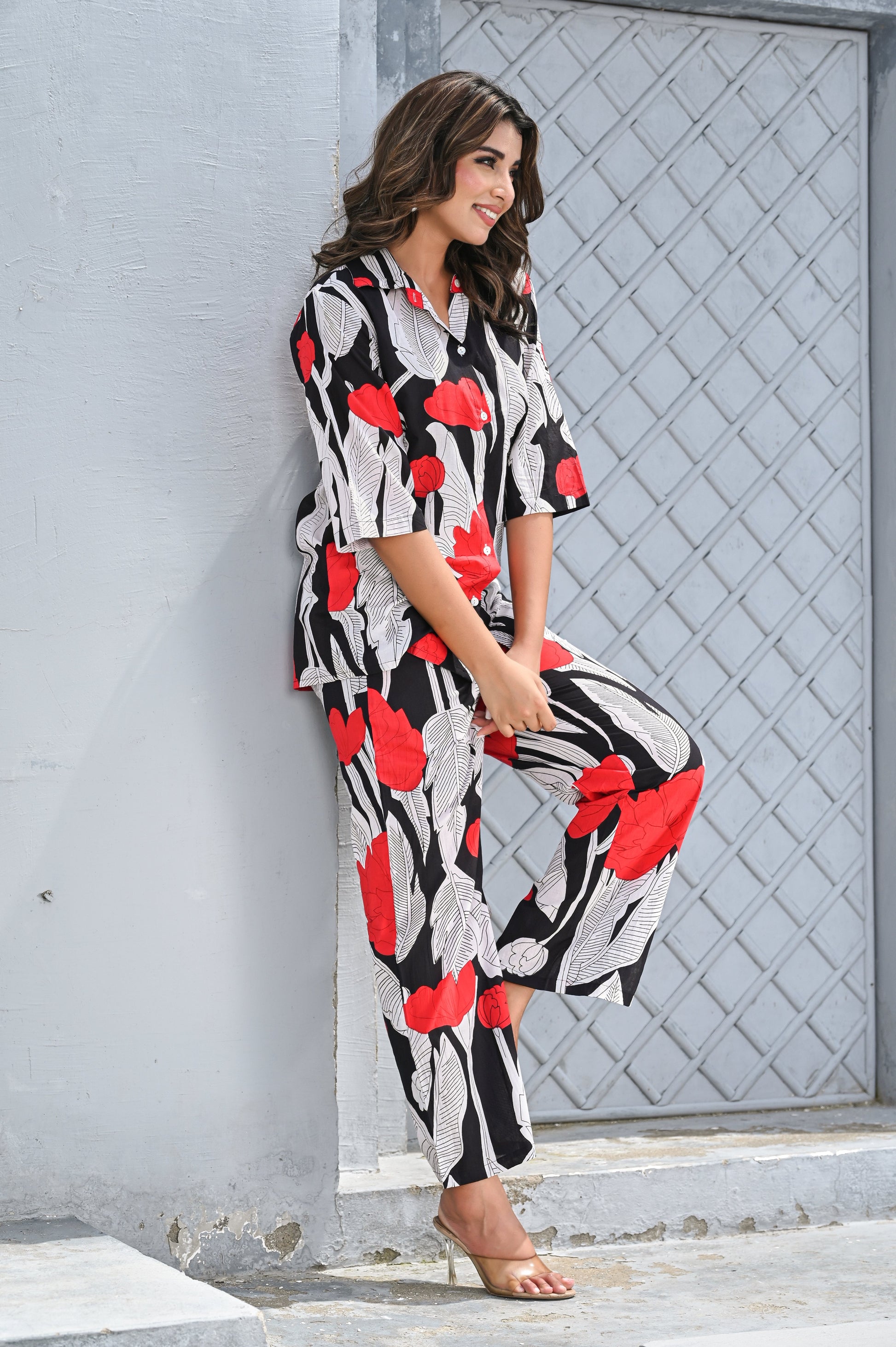 Women’s Black & Red Floral Print Co-ord Set – Relaxed Shirt & Wide-Leg Pants