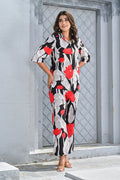 Make a bold fashion statement with this stunning black co-ord set, featuring vibrant red florals and elegant white leaf patterns. The relaxed-fit shirt with a button-down front pairs perfectly with flowy wide-leg pants, giving you both comfort and style. Perfect for vacations, brunch dates, or lounging in luxury.