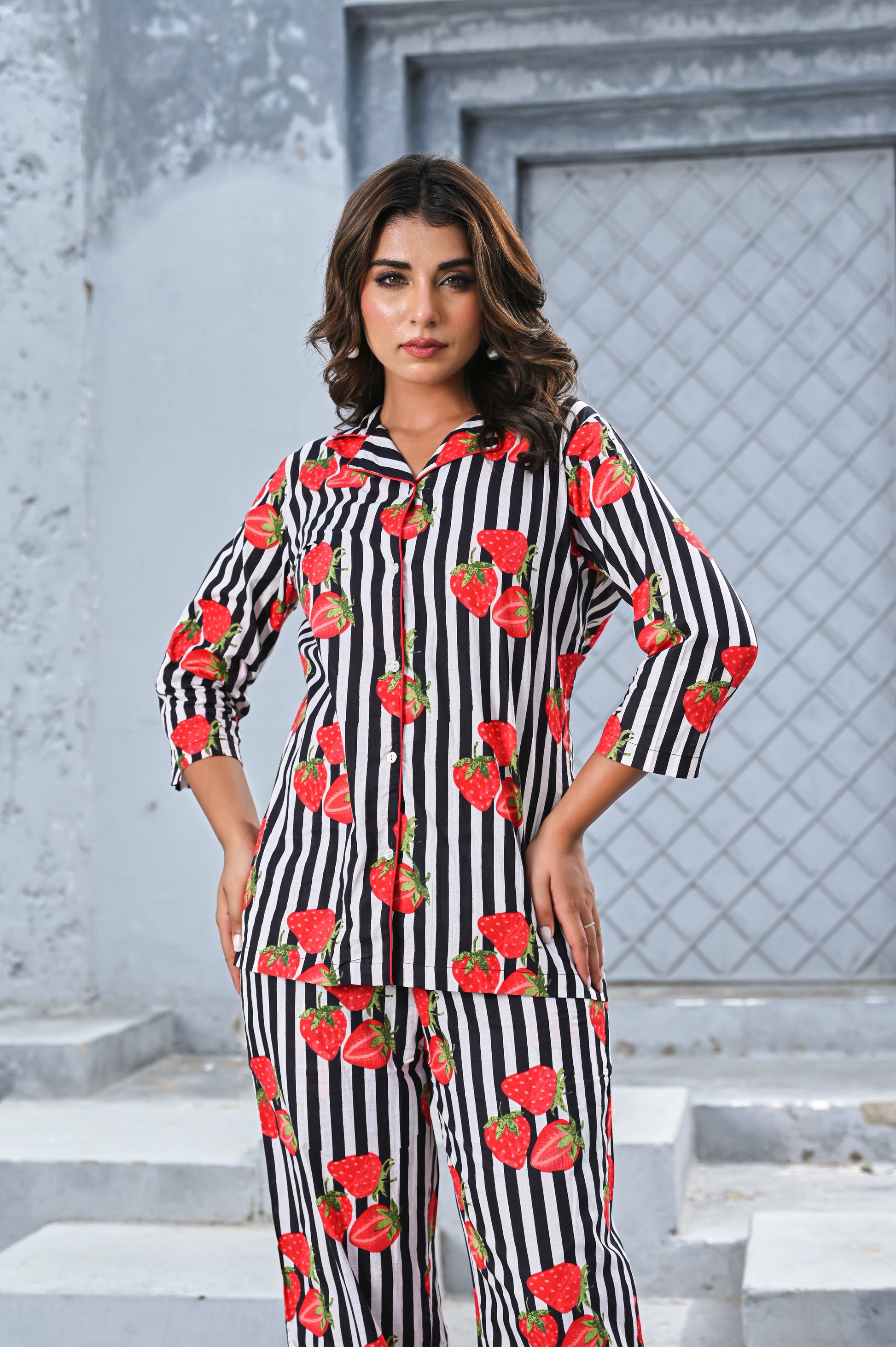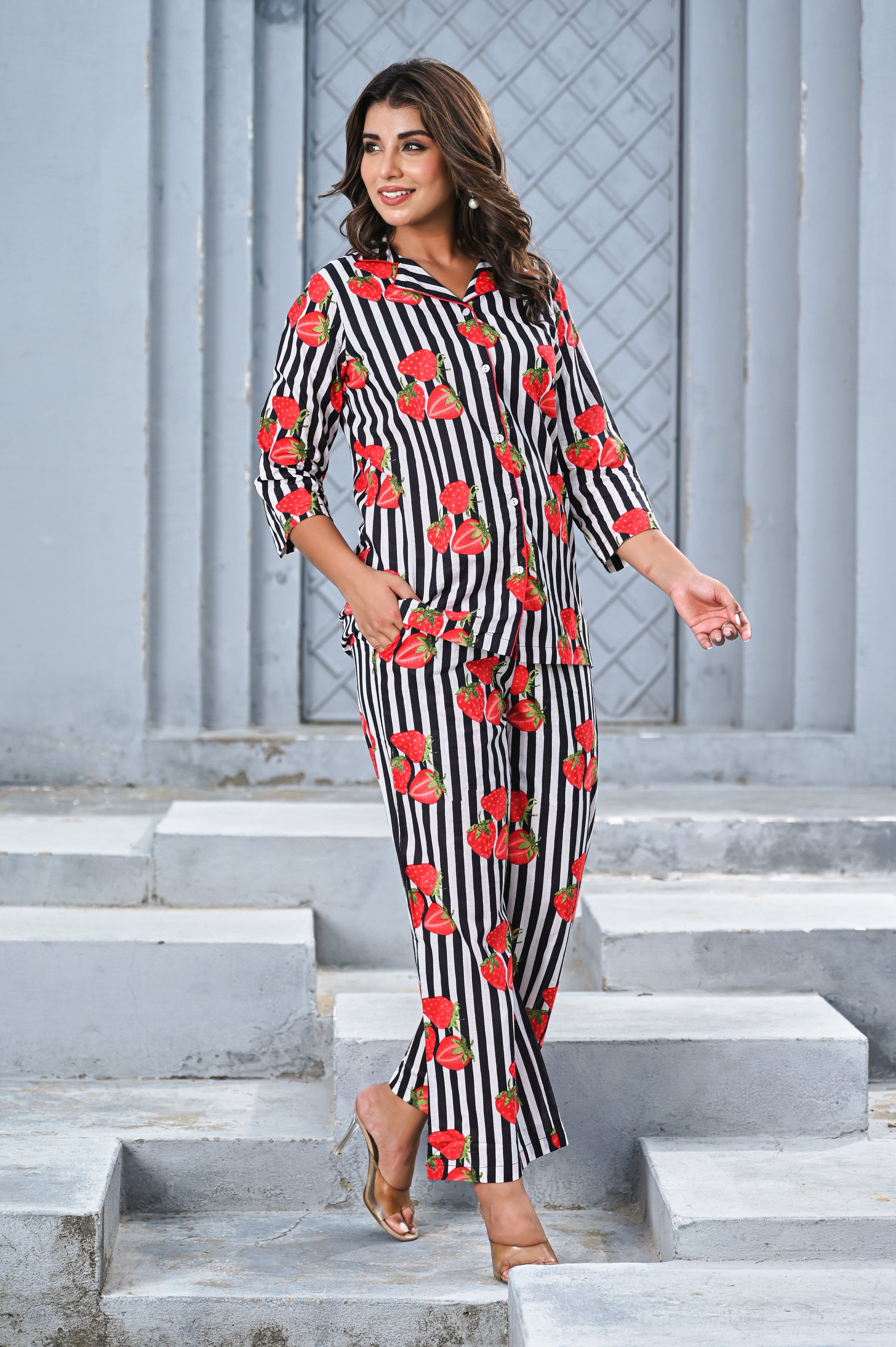 Women’s Black & White Striped Strawberry Print Co-ord Set