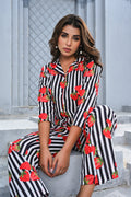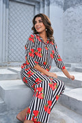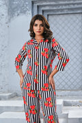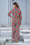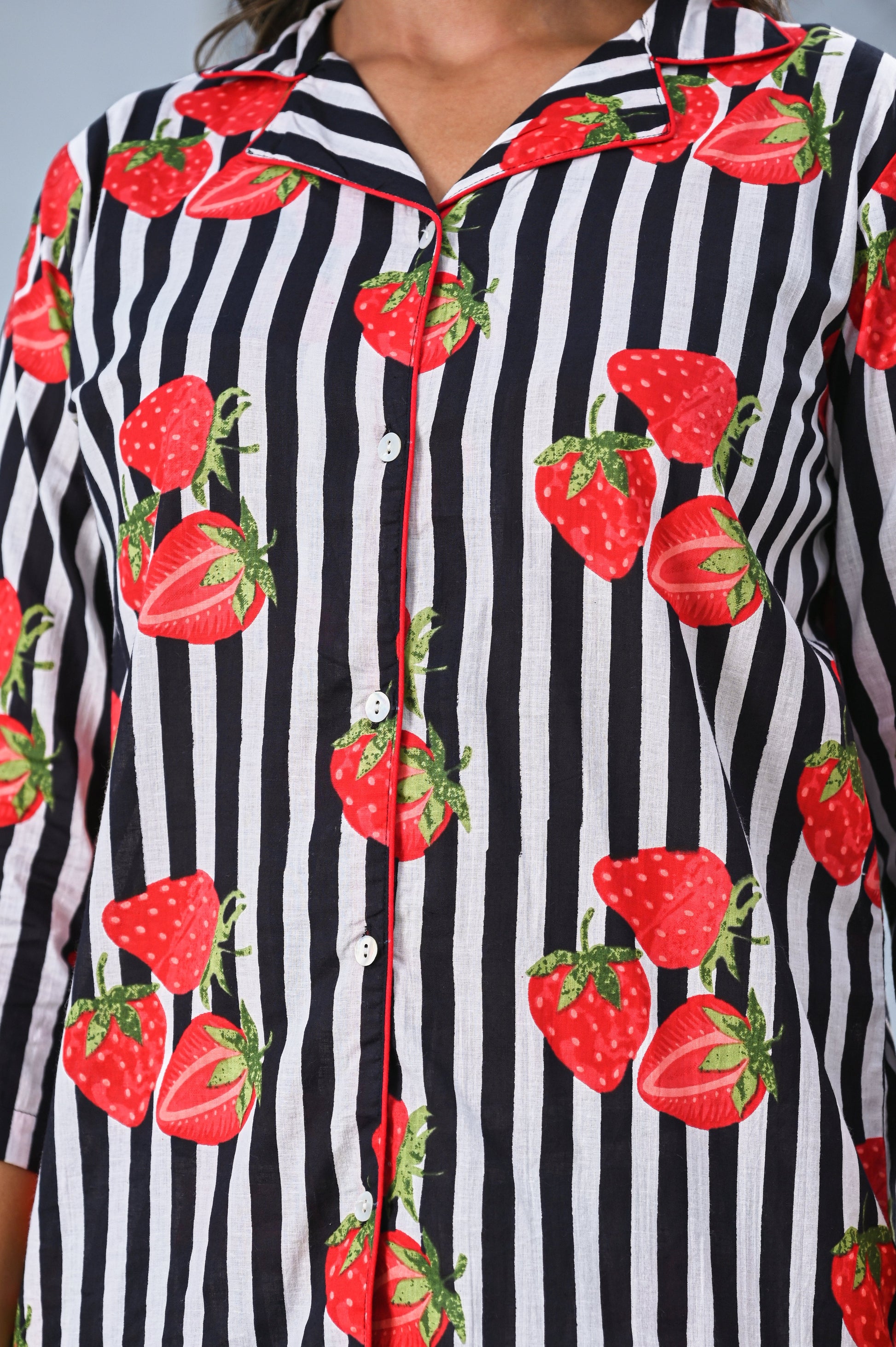 Bring a playful twist to your everyday style with our Black & White Striped Strawberry Print Co-ord Set. Featuring a button-down shirt with 3/4th sleeves and matching wide-leg pants, this set combines bold stripes with vibrant strawberry prints for a fun, fashion-forward look. Perfect for brunch dates, lounging in style, or vacation wear, this co-ord set keeps you effortlessly chic and comfortable all day long.
