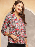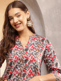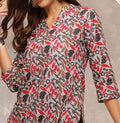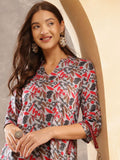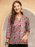Autumn Whisper Cotton Tunic Top – Grey Base with Red & Black Print