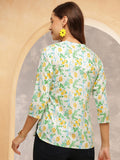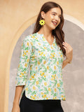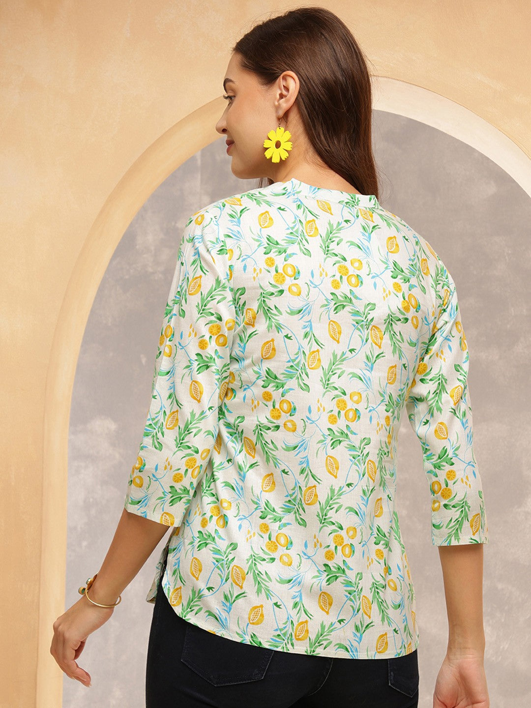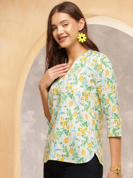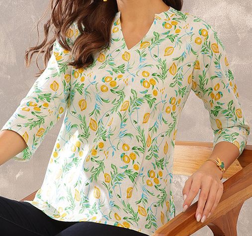 Add a splash of freshness to your everyday style with this charming lemon-printed cotton tunic. Crafted from soft and breathable cotton, this tunic features a soothing white base adorned with vibrant yellow lemons and green leafy motifs, giving it a cheerful, breezy feel. The straight-cut silhouette is designed for comfort without compromising on style.