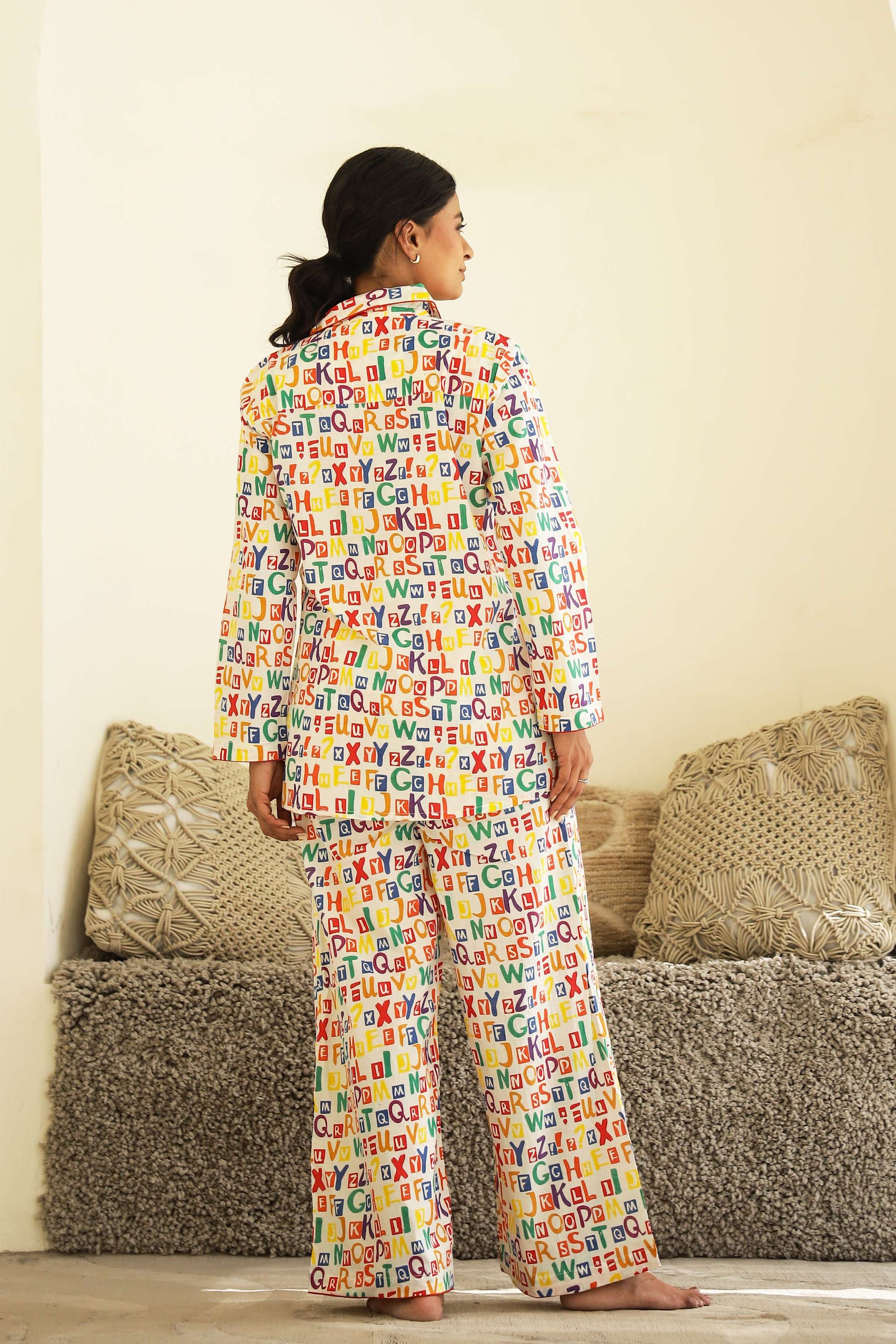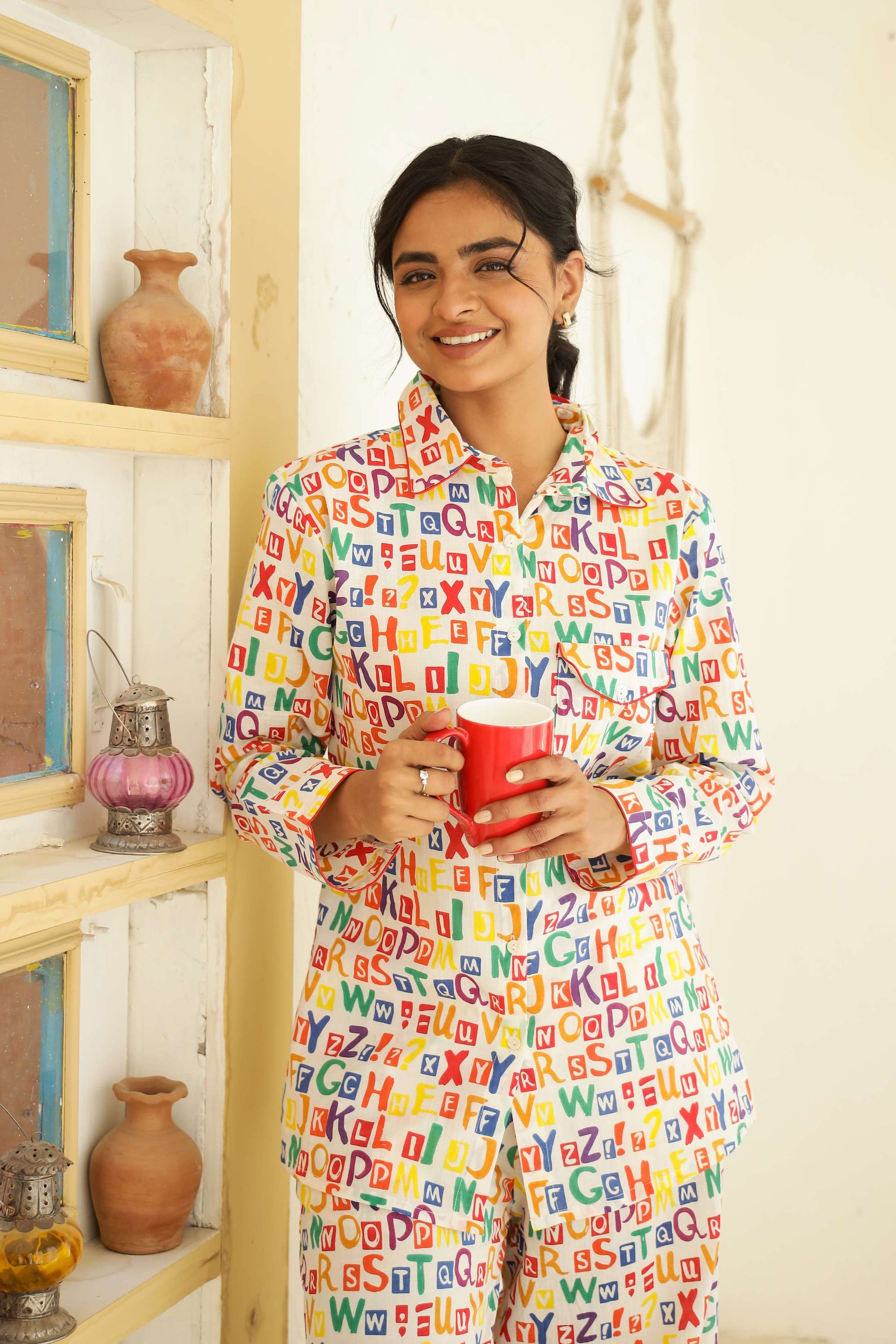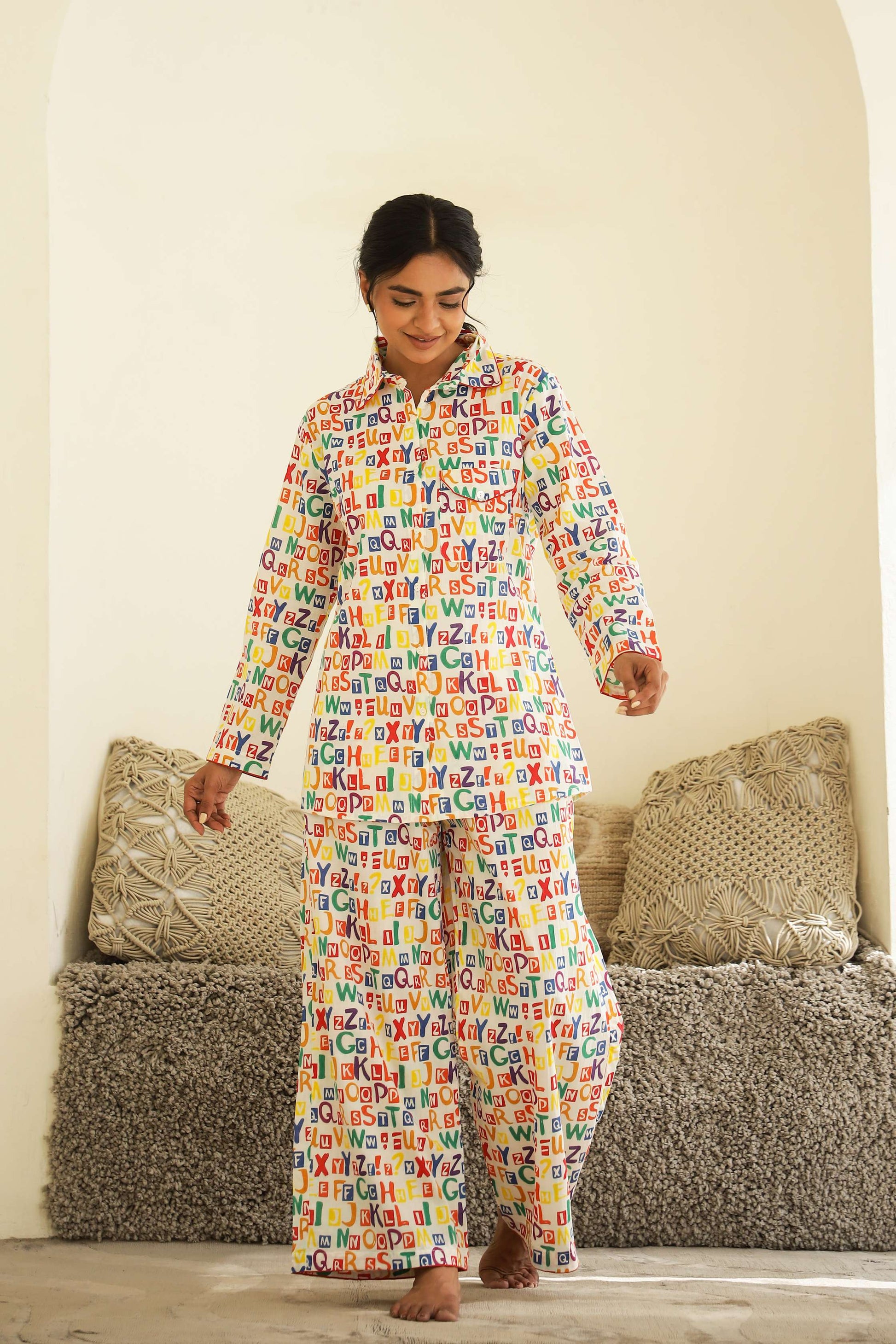 Add a playful twist to your everyday wardrobe with our Multicolour Alphabet Print Cotton Co-Ord Set. Bursting with vibrant letters in a rainbow of colors, this quirky set is perfect for those who love to stand out while staying ultra-comfy.