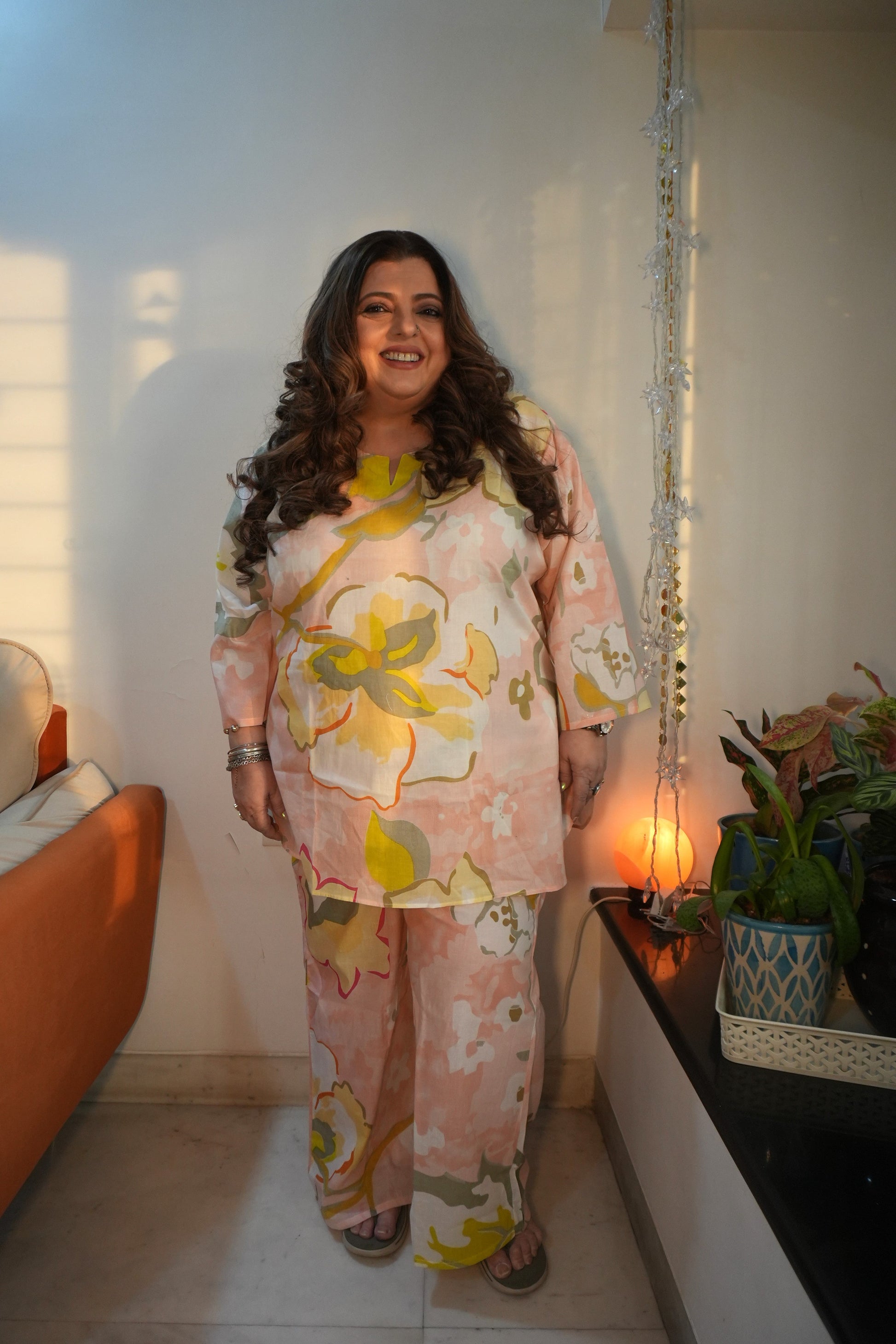 Experience modern elegance with this comfortable Abstract Floral Kurta and Pant Set. This matching two-piece ensemble features a stunning artistic, watercolor-style floral print in gentle pastel shades like Blush Pink or Soft Yellow. The tunic-style kurta has a flattering, slightly A-line cut and a relaxed boat or scoop neckline. Paired with comfortable, straight-fit trousers in the same print, this set is ideal for stylish lounging, casual outings, or sophisticated resort wear.