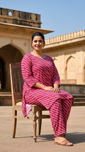 Featuring a round neck with a V-cut and 3/4th sleeves, this two-piece set pairs a breezy kurta-style top with matching straight-fit pants. The wavy white print on a pink base adds a cheerful touch, perfect for daily wear, casual outings, or relaxed weekends.