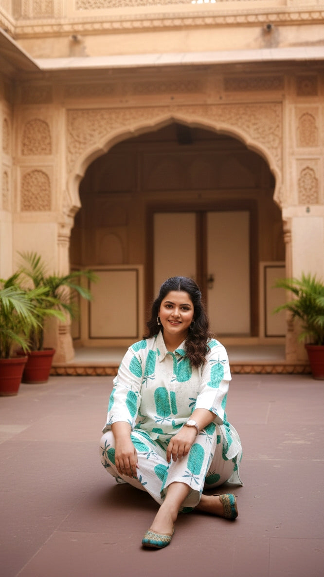 Step out in confidence and comfort with this plus-size green printed cotton co-ord set, thoughtfully designed for women who love style that moves with them. The soft cotton fabric keeps you cool all day, while the relaxed fit ensures a flattering and easy silhouette.
