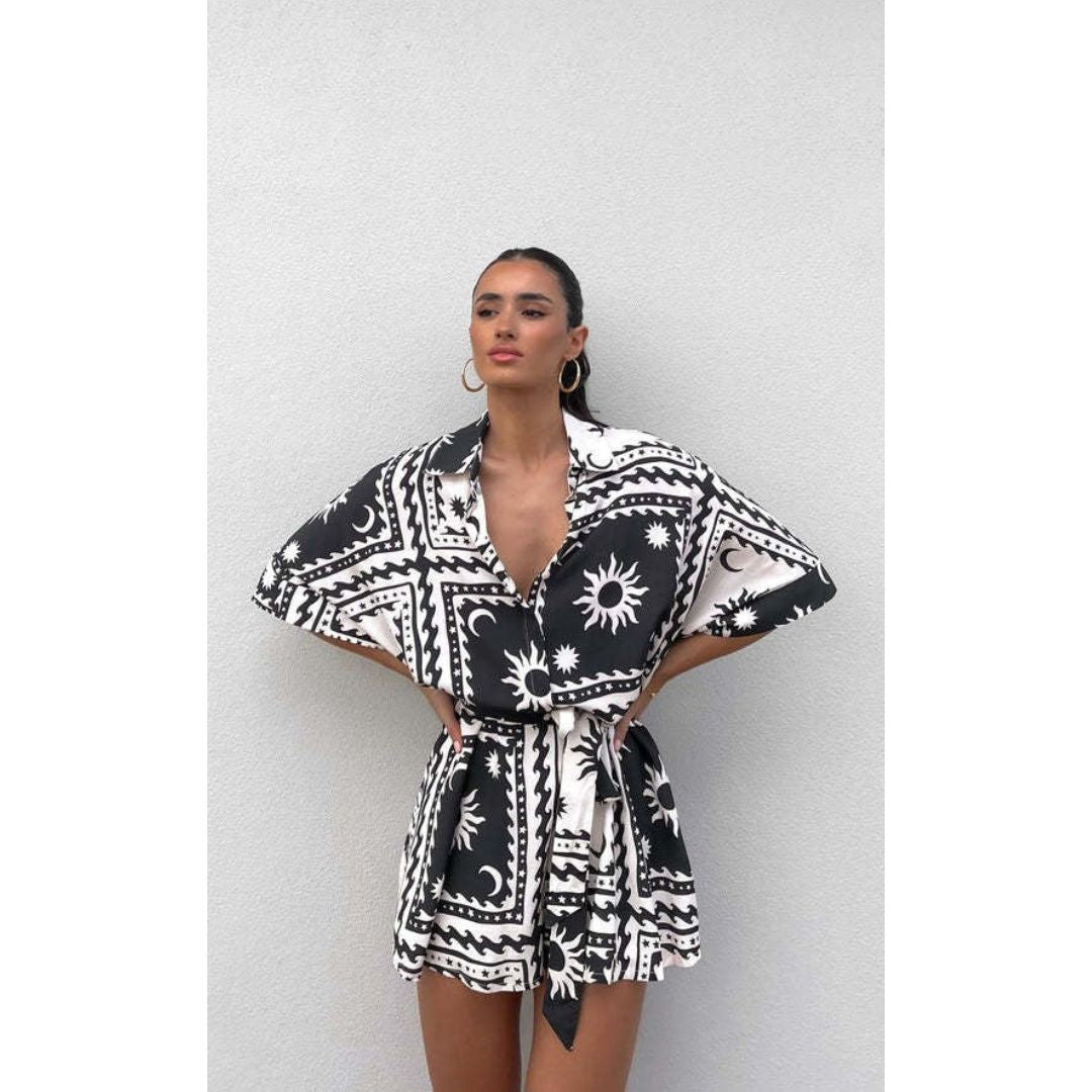 This casual playsuit is designed with a loose fit and made from high-quality polyester fabric, ensuring both comfort and style. The eye-catching graphic and geometric pattern adds a unique touch to this piece, making it a must-have for any fashion-forward individual.