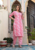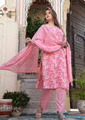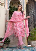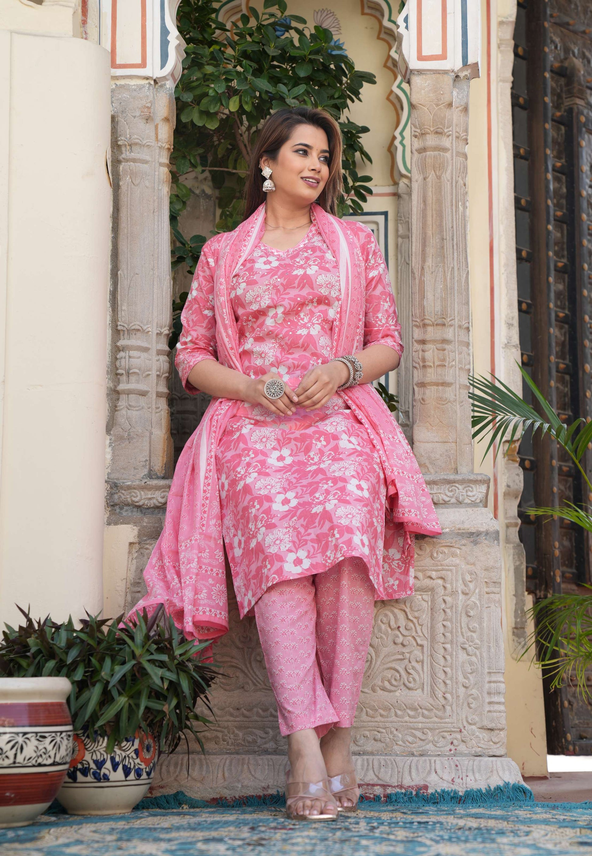 Stay stylish in this pink cotton suit set featuring charming floral prints and a lightweight dupatta. A versatile piece for festive moments and daily comfort.