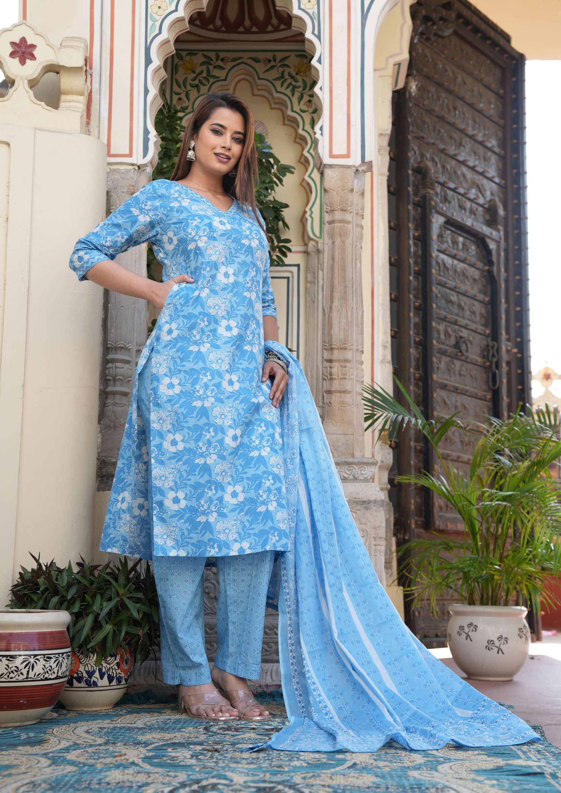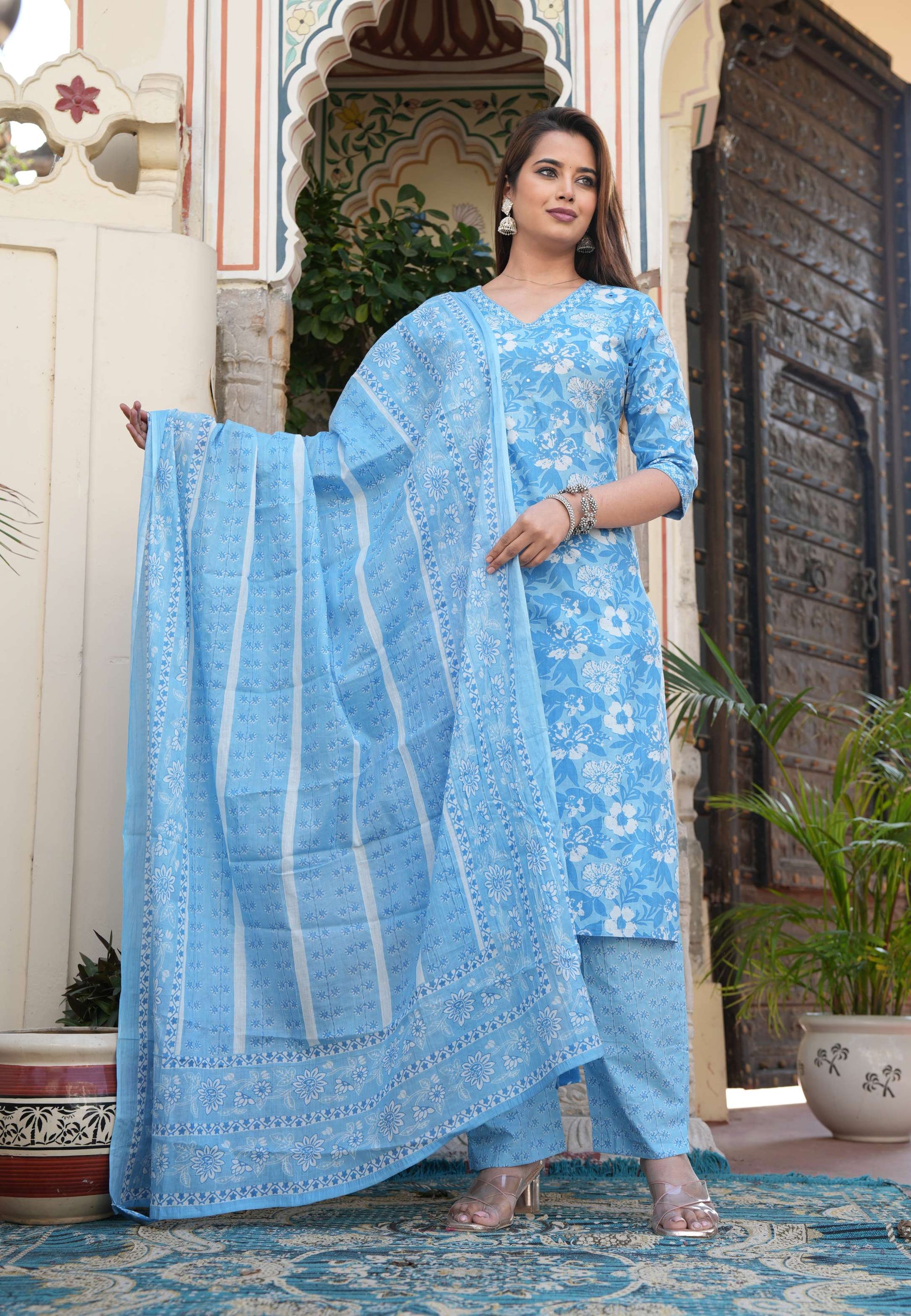 Elegant Sky Blue Printed Cotton Suit Set with Dupatta