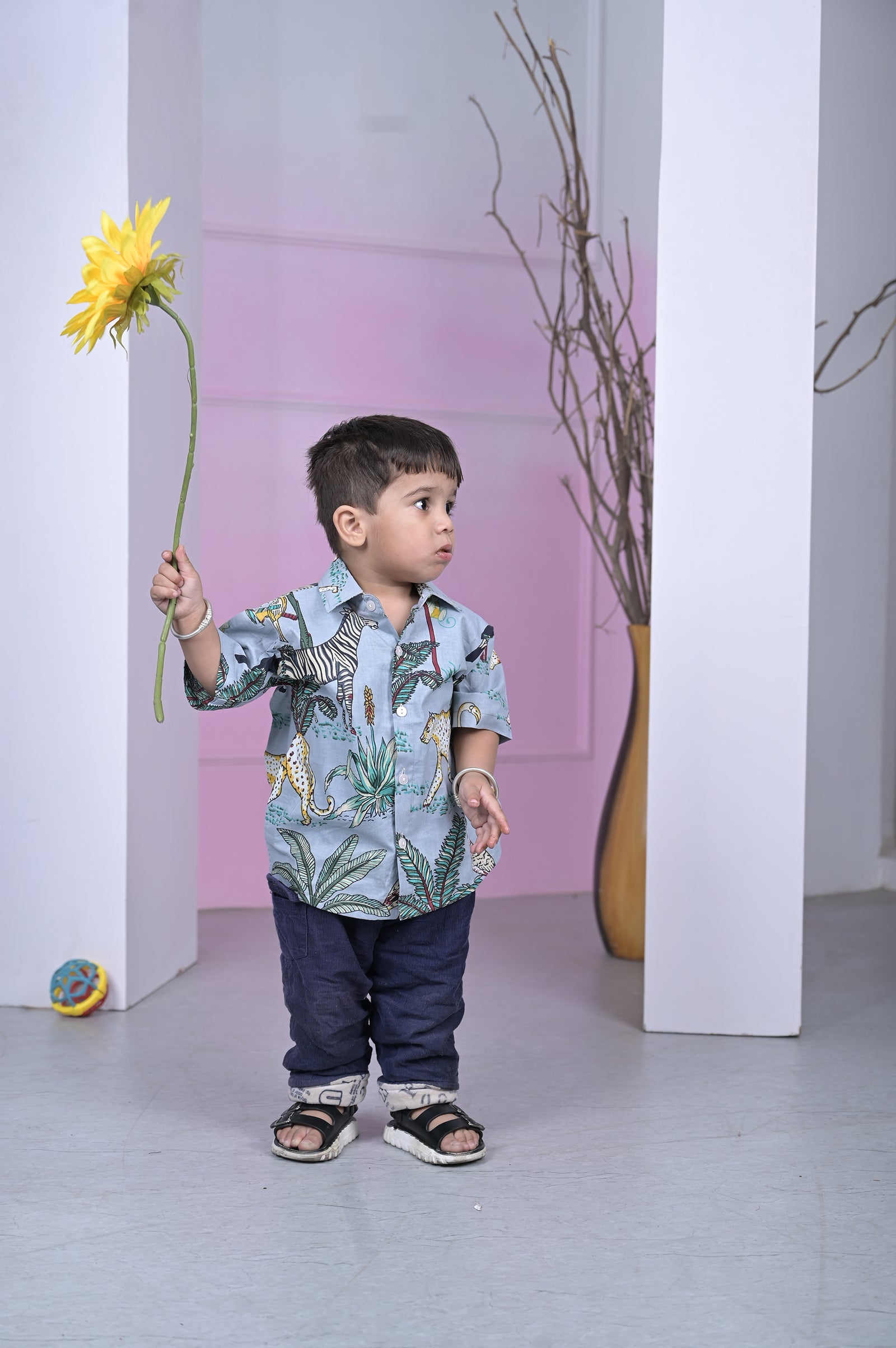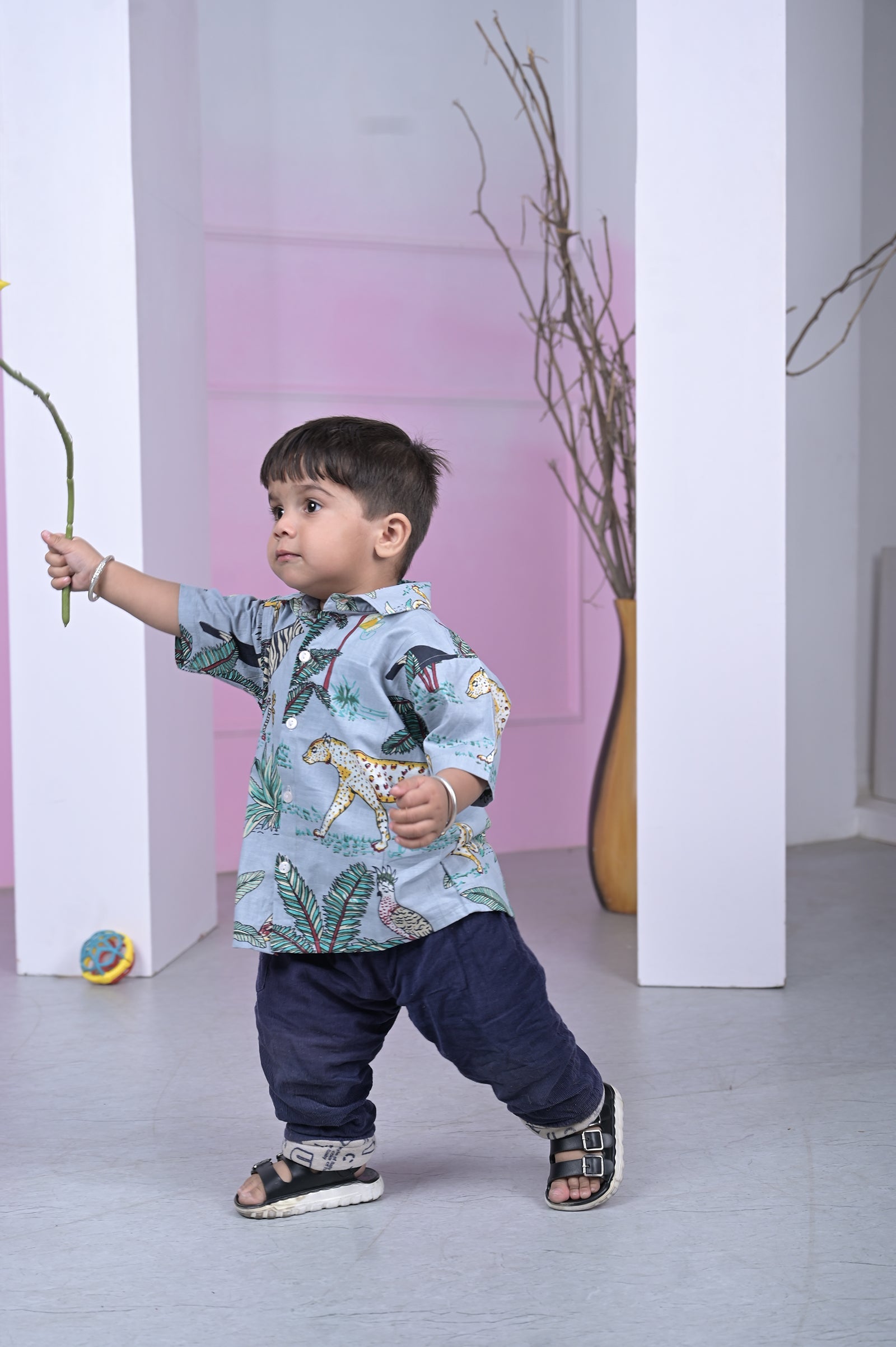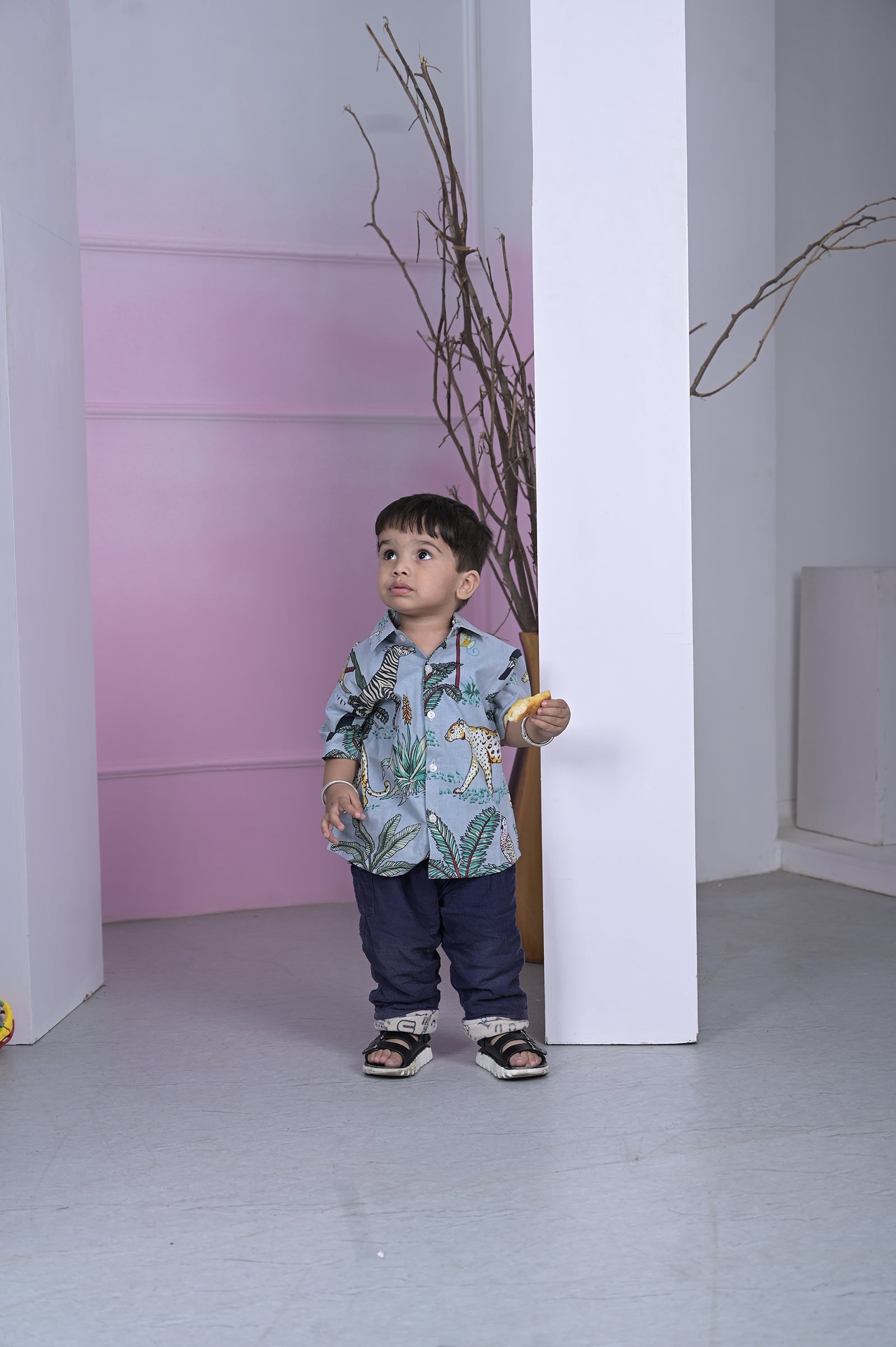 Let your little adventurer roam wild in this sky-blue cotton shirt, alive with playful zebras, cheetahs and lush jungle foliage. Perfect for playdates, park trips or casual family outings, it brings safari fun to every day.