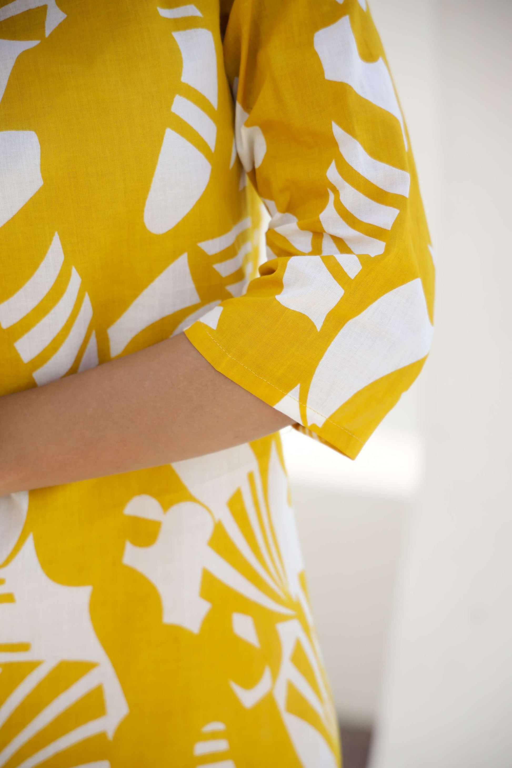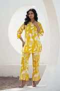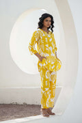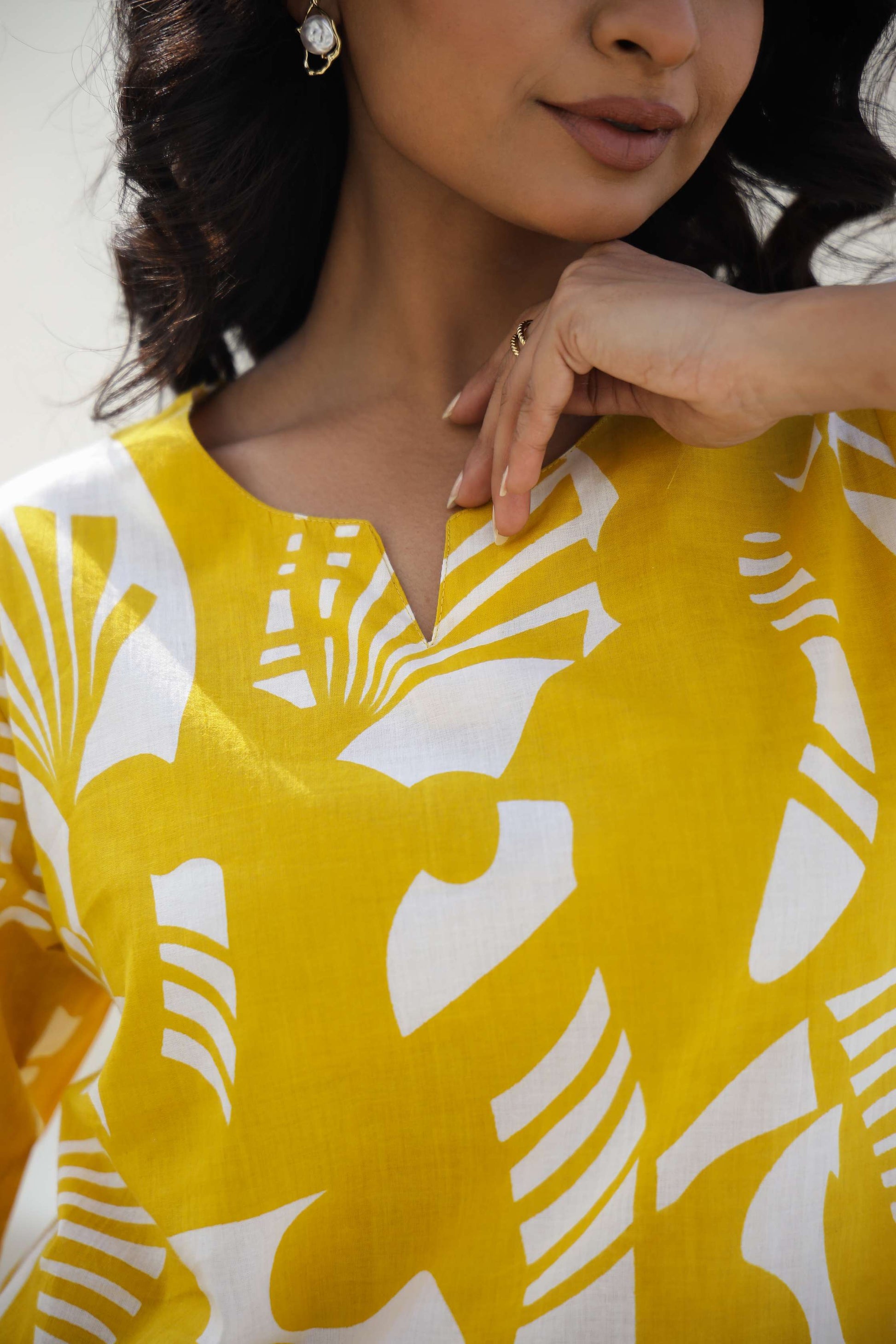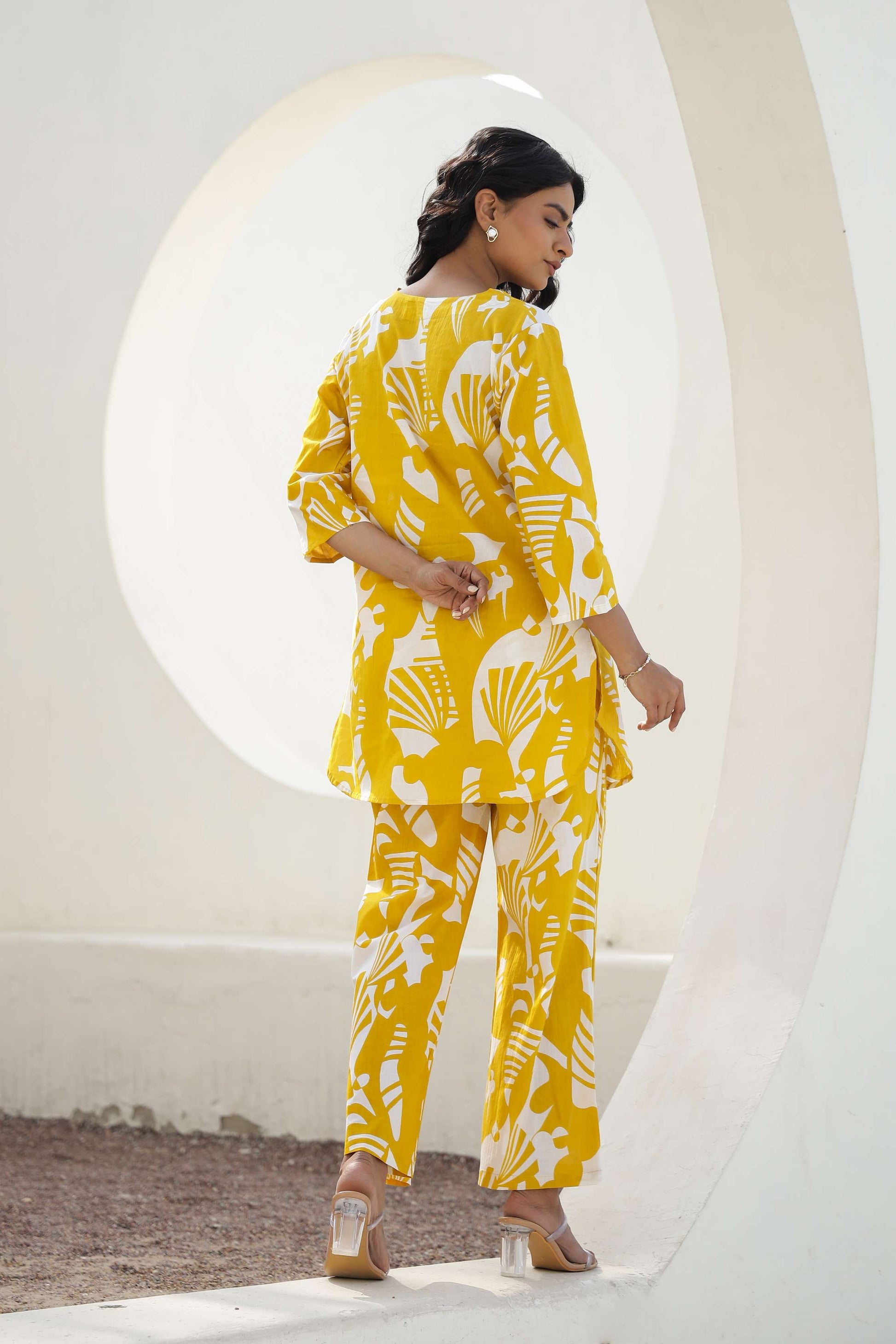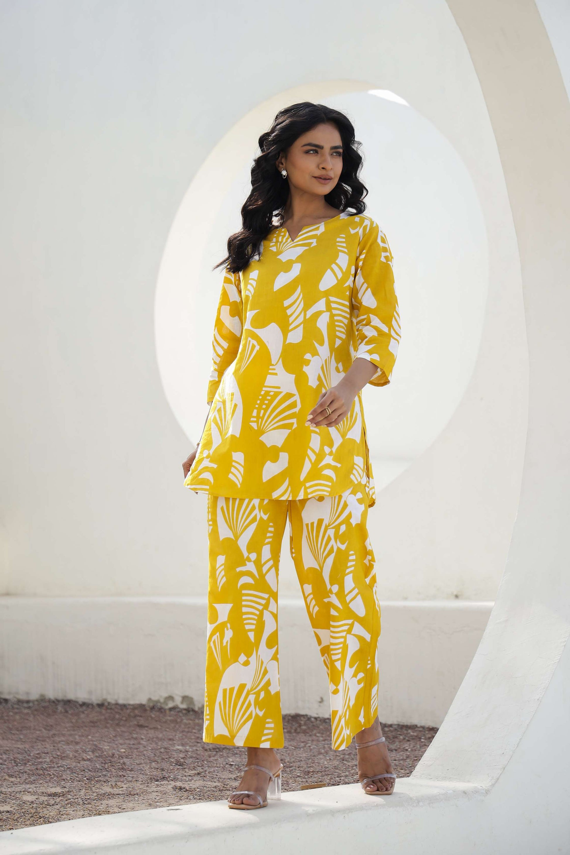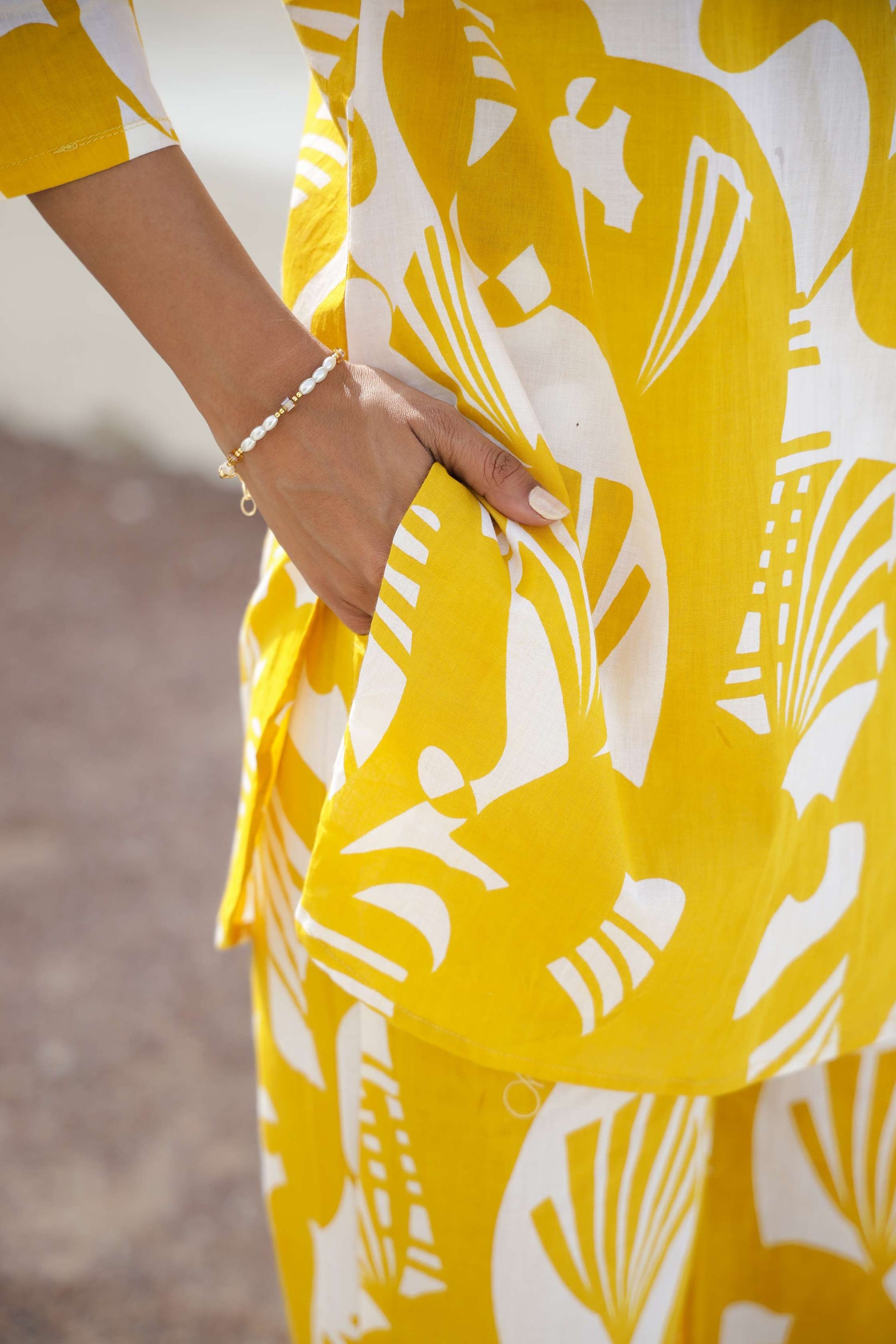 Brighten up your wardrobe with this Sunny Yellow Abstract Cotton Cord Set. Made from soft, breathable cotton, this vibrant co-ord set features a playful abstract print in fresh white on a bold yellow base. The set includes a relaxed-fit kurta top and straight-leg trousers, perfect for sunny day outings, casual brunches, or vacation styling.