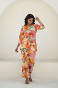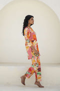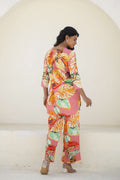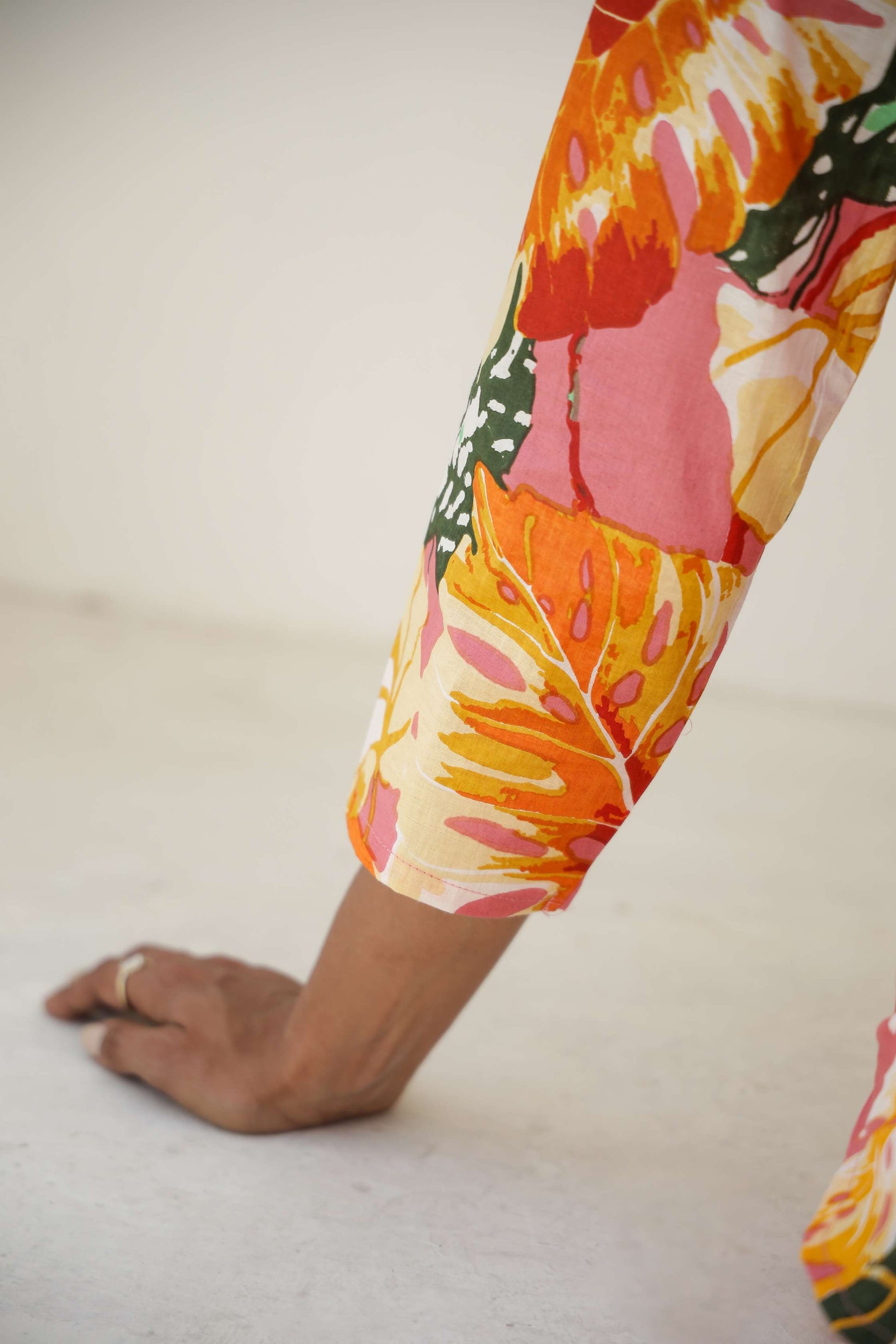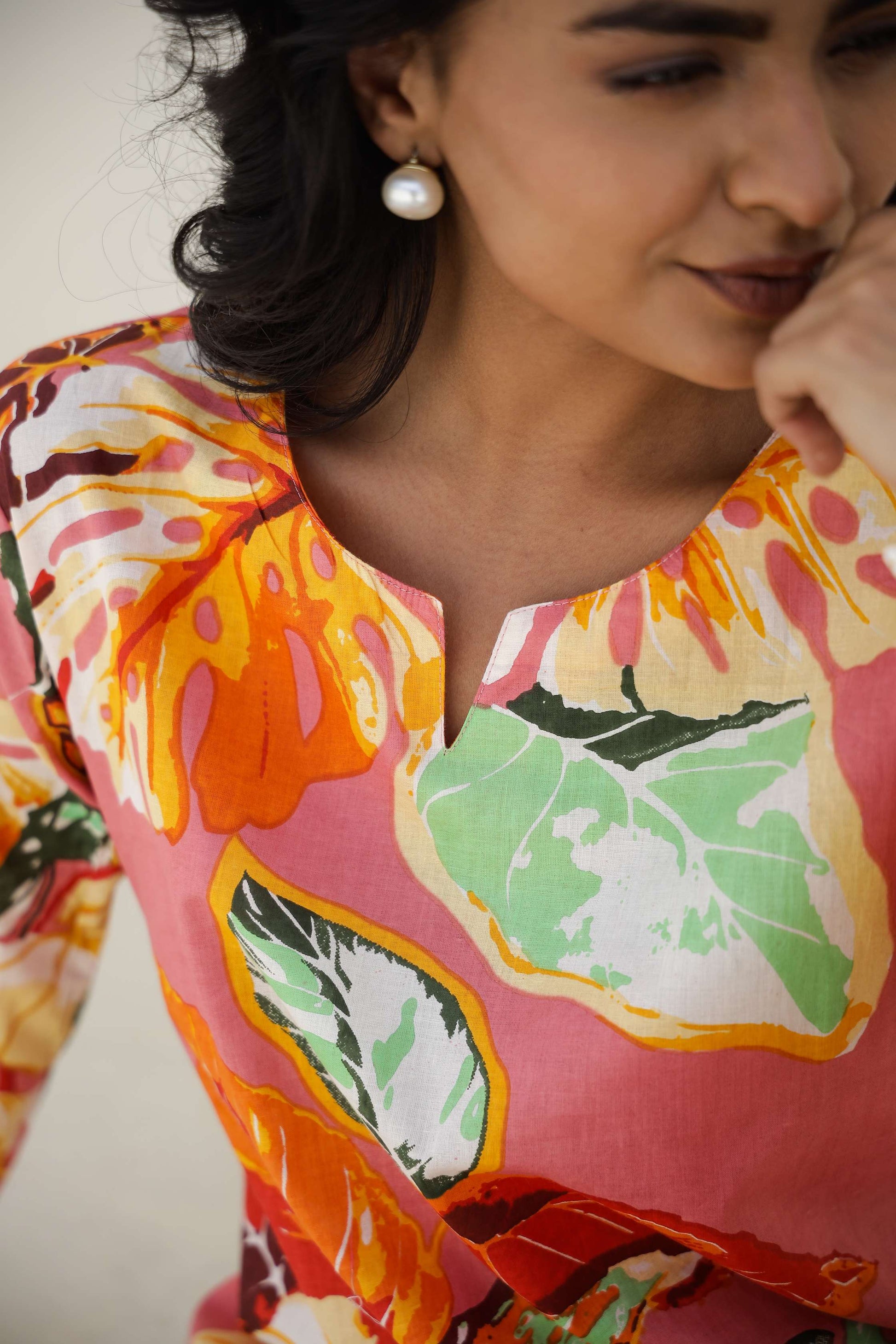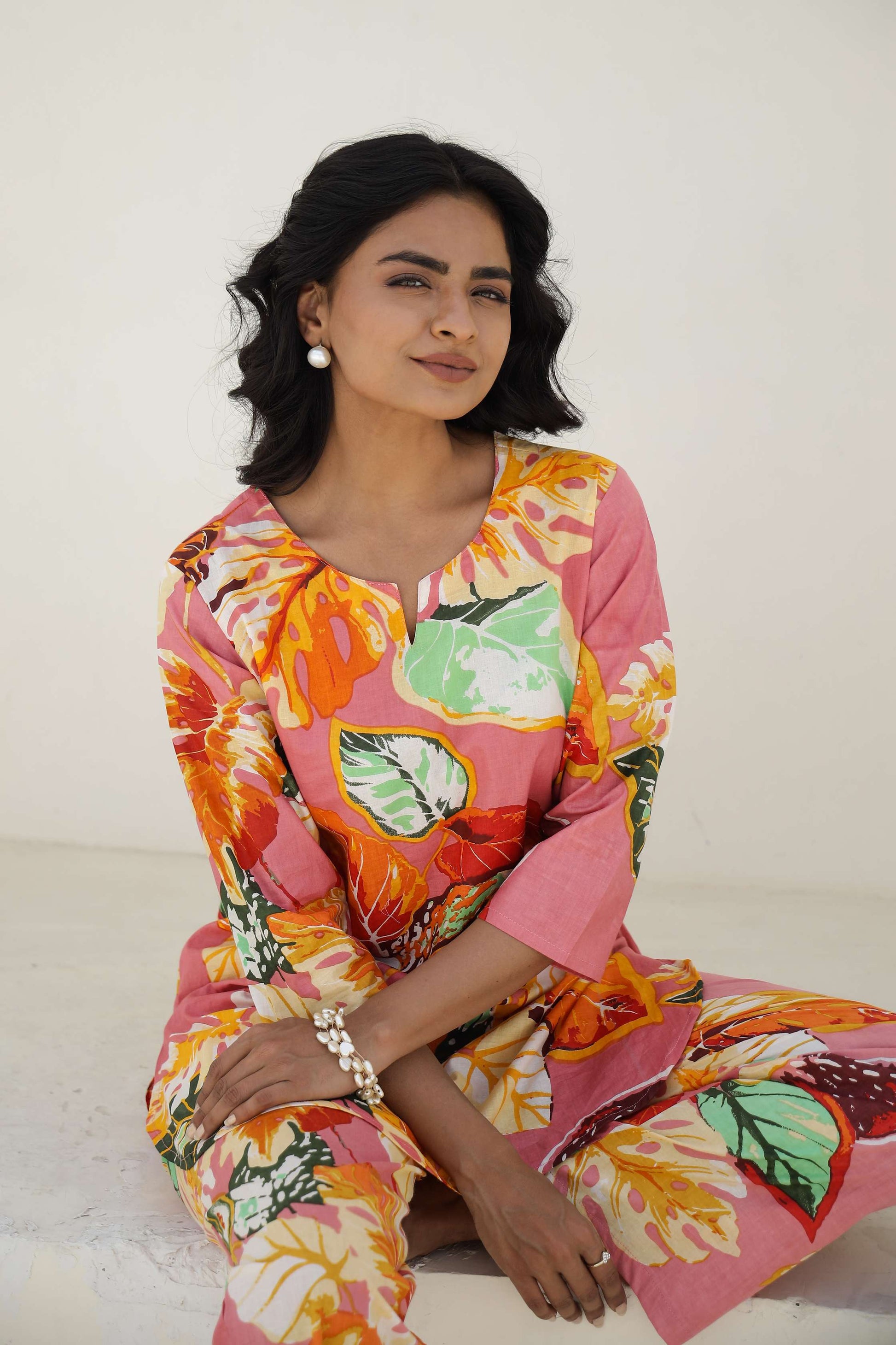 Add a burst of tropical flair to your wardrobe with this Tropical Bloom Pink Cotton Co-Ord Set. Drenched in bold hues of pink, orange, and green, this vibrant ensemble features a playful oversized leaf print that’s perfect for vacations, brunch dates, or casual get-togethers.