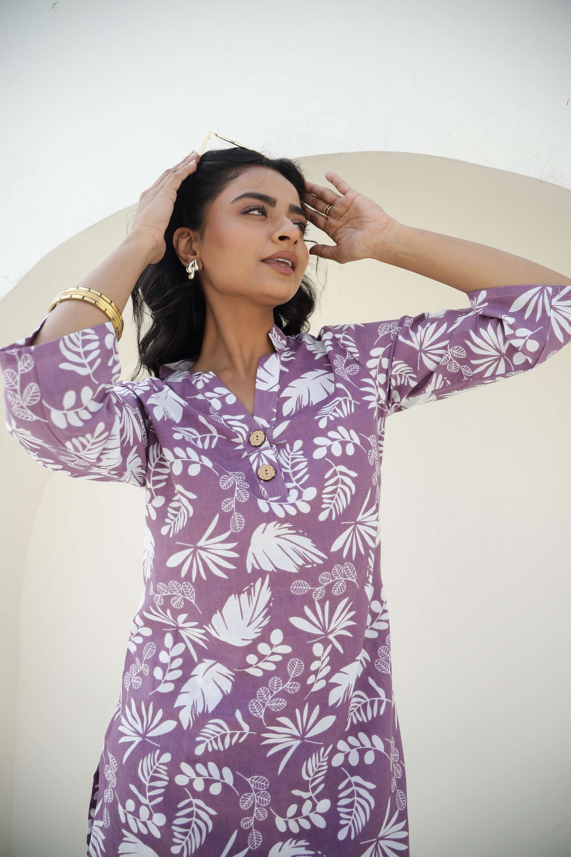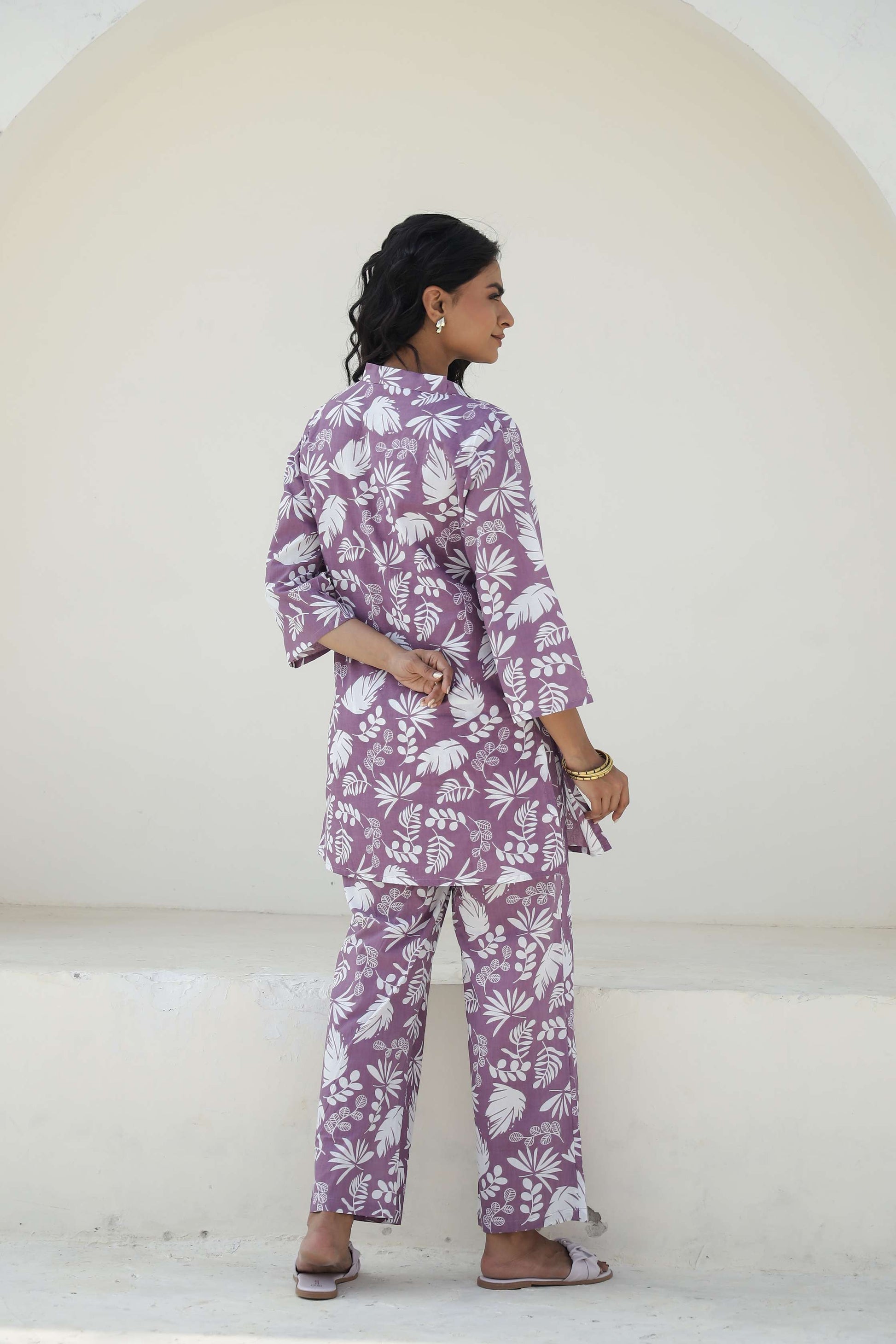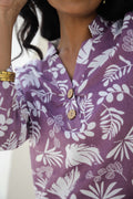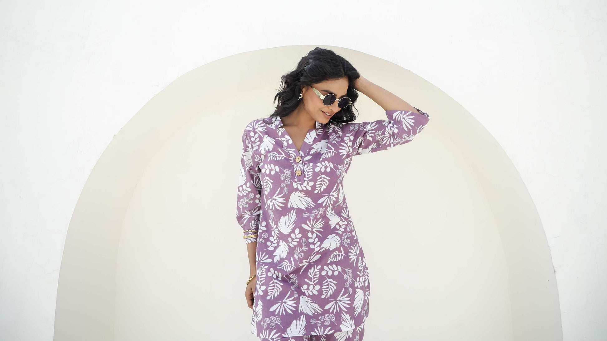 Upgrade your wardrobe with our Tropical Printed Co-ord Set, designed for effortless style and all-day comfort. Featuring a relaxed-fit top with a chic button detail and matching straight-leg pants, this versatile set is perfect for casual outings, travel days, brunch dates, or lounging at home. Available in two gorgeous colors - Pink and Purple, both adorned with fresh white tropical leaf prints.