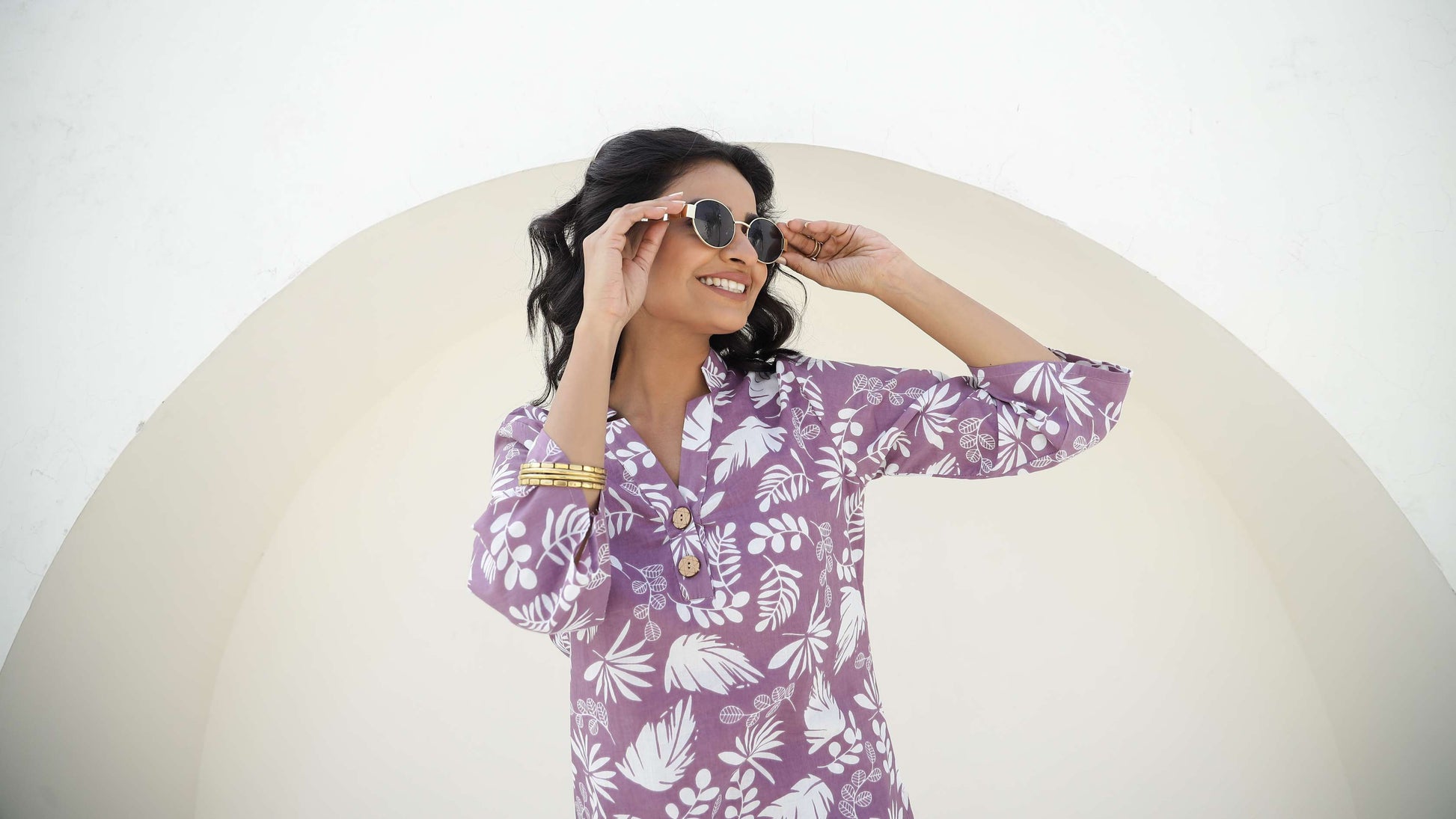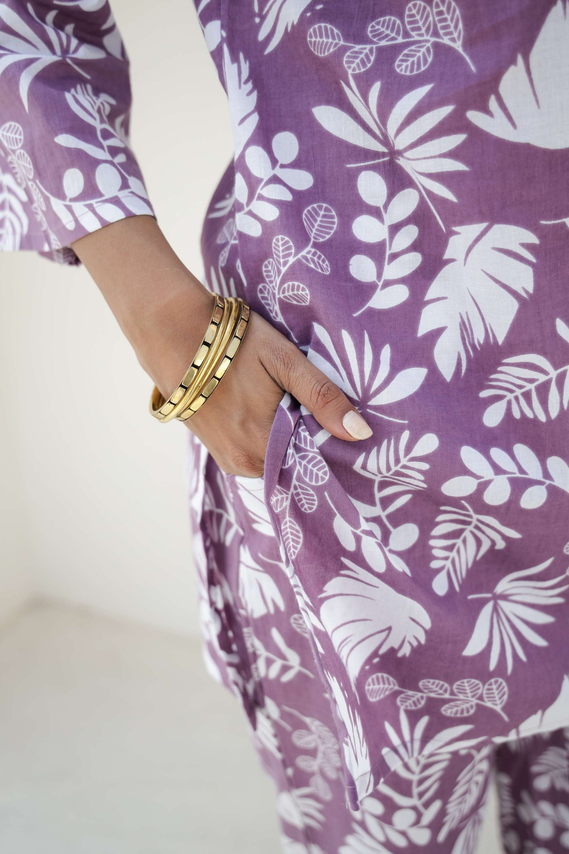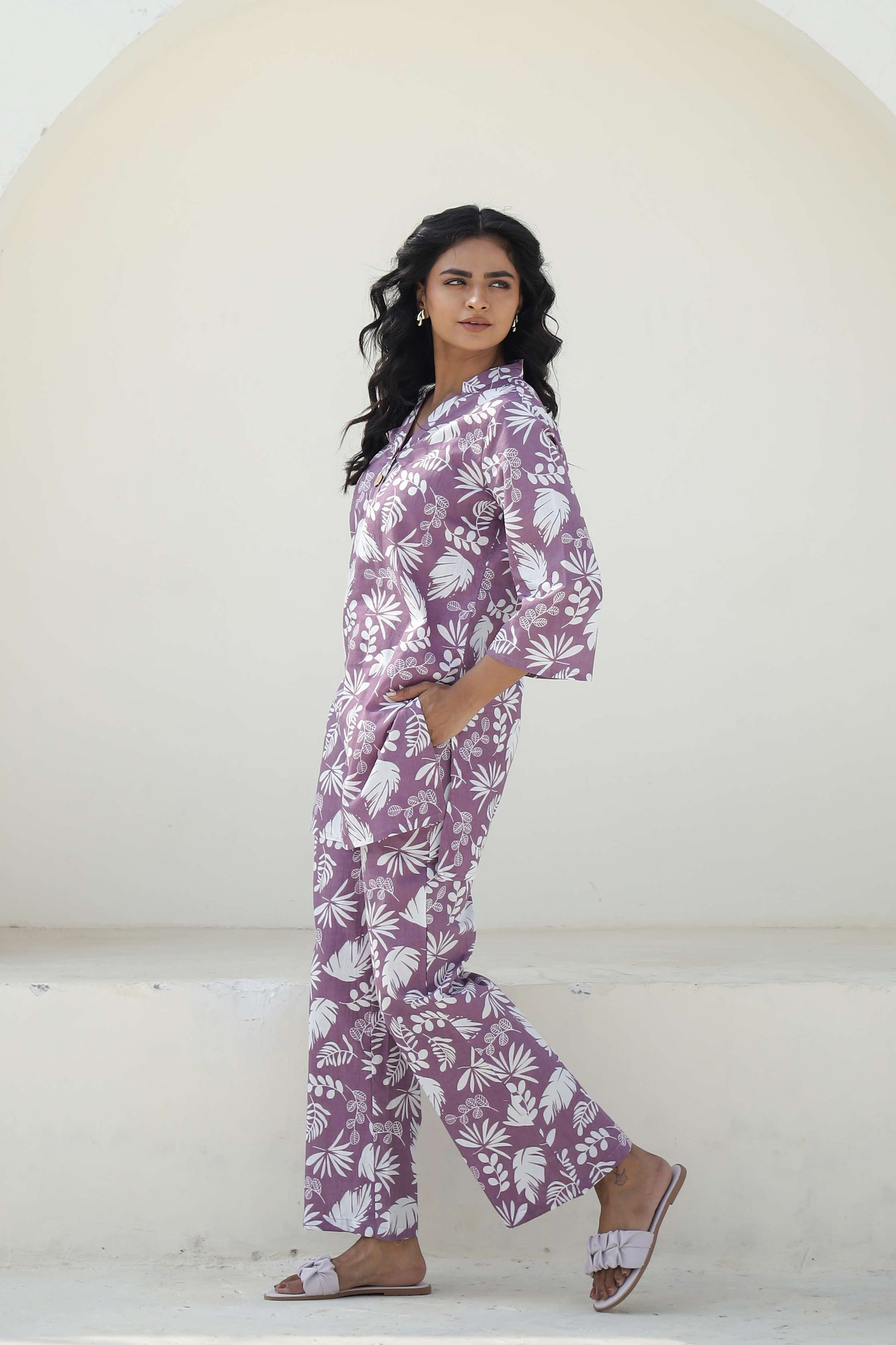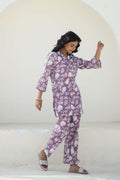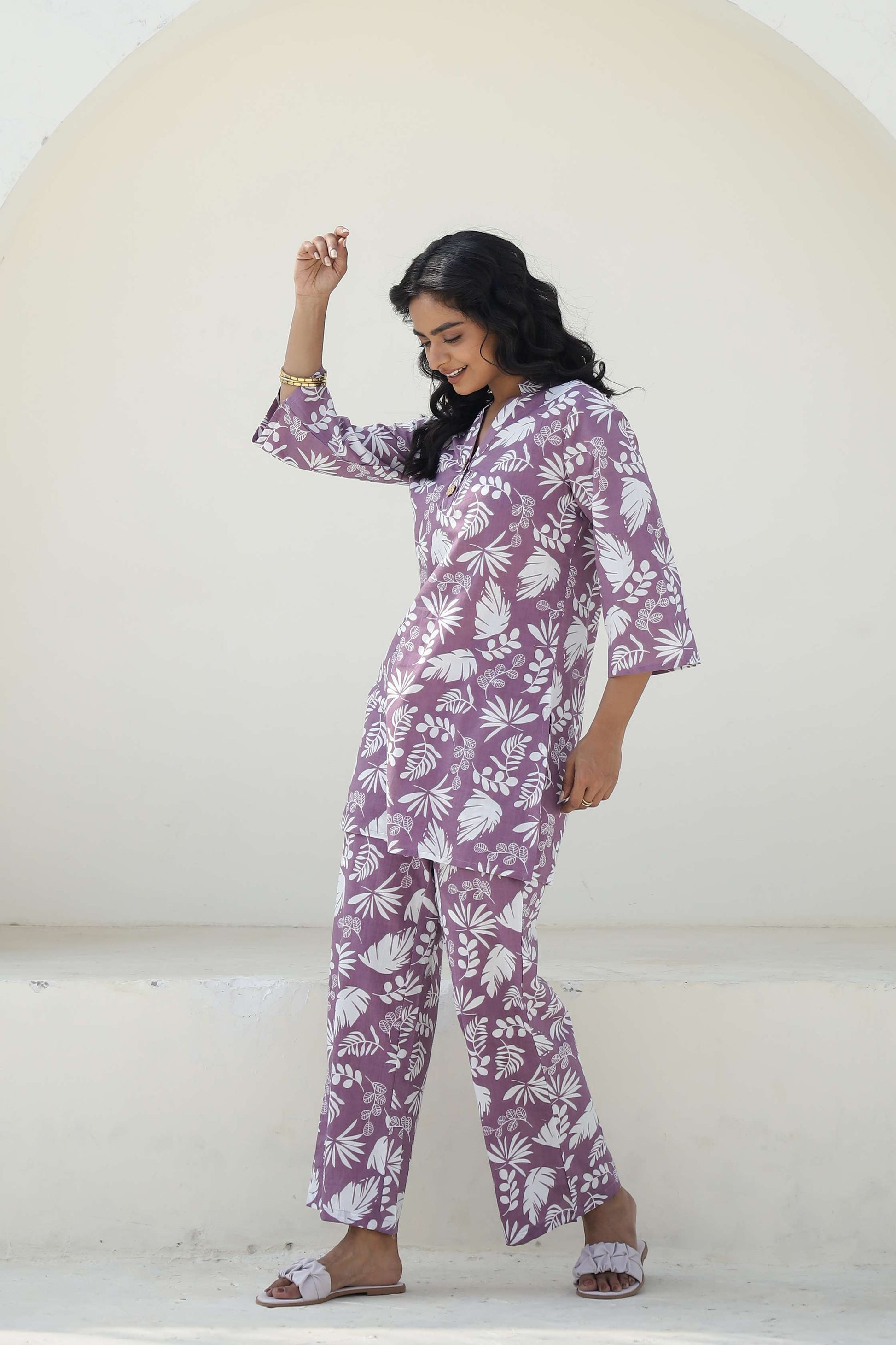 Upgrade your wardrobe with our Tropical Printed Co-ord Set, designed for effortless style and all-day comfort. Featuring a relaxed-fit top with a chic button detail and matching straight-leg pants, this versatile set is perfect for casual outings, travel days, brunch dates, or lounging at home. Available in two gorgeous colors - Pink and Purple, both adorned with fresh white tropical leaf prints.
