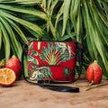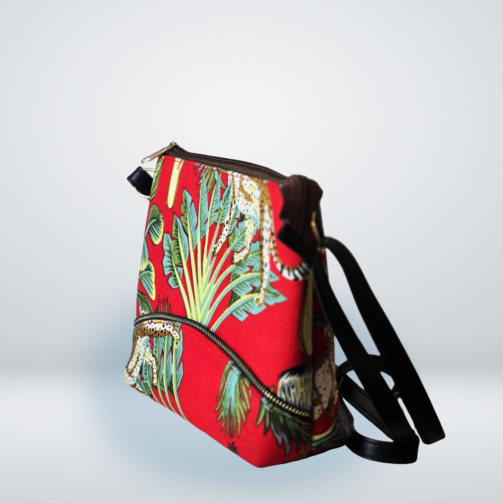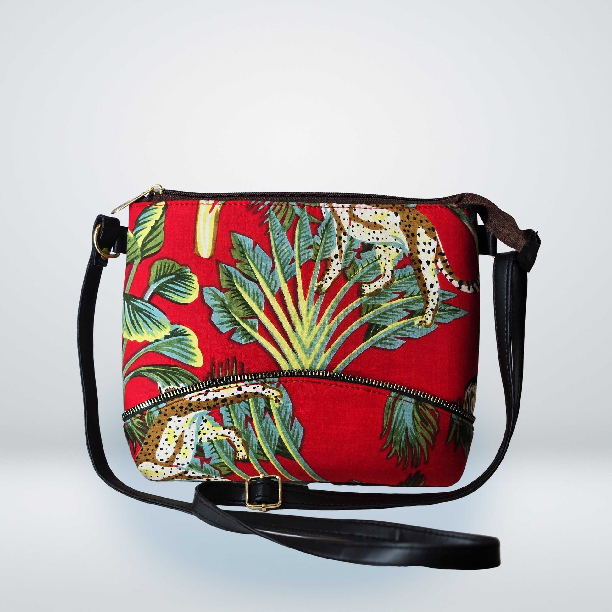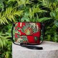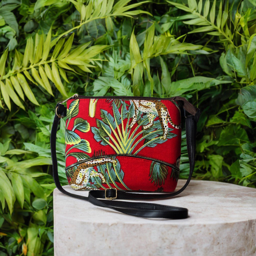 Add a splash of exotic style to your wardrobe with this chic Tropical Printed Crossbody Bag. Featuring a vibrant tropical design with lush green foliage and playful cheetah patterns on a striking red background, this bag brings the spirit of the jungle to your everyday look.
