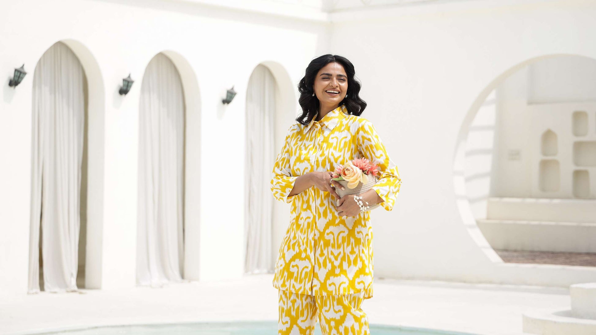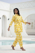 Make a bold statement with our stunning Vibrant Yellow Ikat Print Co-Ord Set. Designed for both comfort and style, this set features a relaxed-fit tunic with a button-down front and matching straight-leg pants. The striking yellow and white ikat pattern adds a touch of elegance, making it perfect for casual outings, brunch dates, or vacation wear.