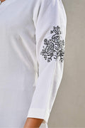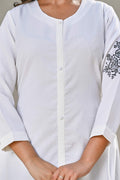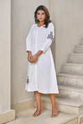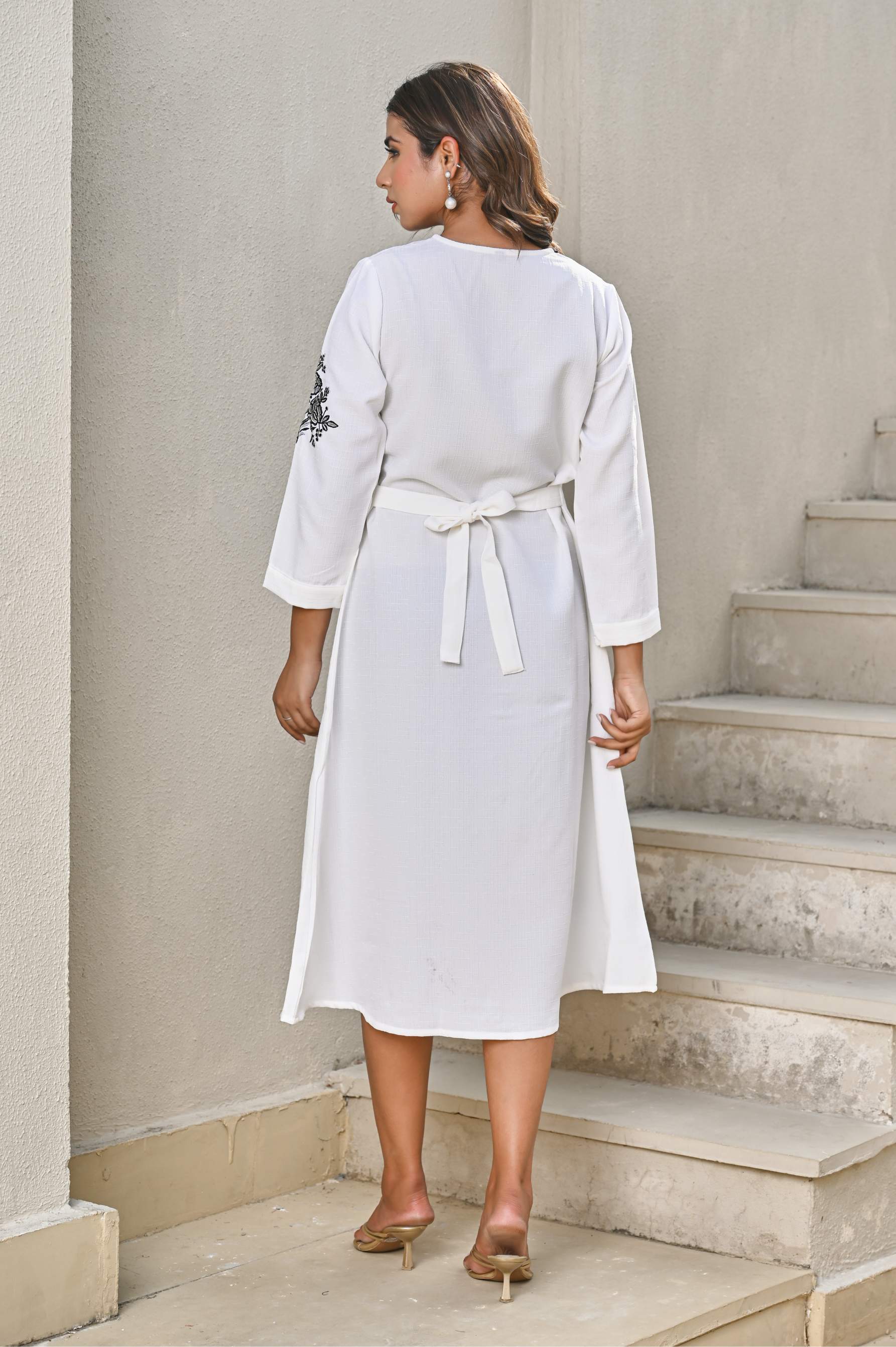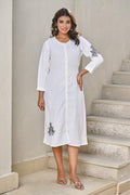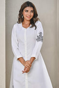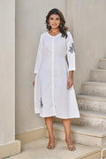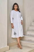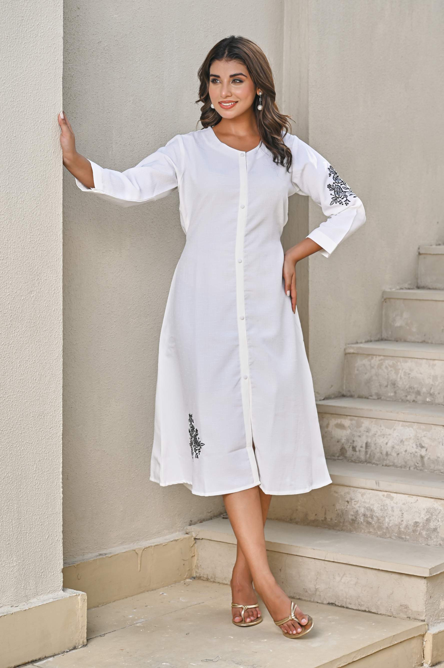 Elevate your look with this classy white dress designed in breathable cotton fabric. Featuring monochrome black floral embroidery and a smart front-button design, this dress blends elegance with everyday versatility. Its clean silhouette flatters all body types, making it a wardrobe must-have.