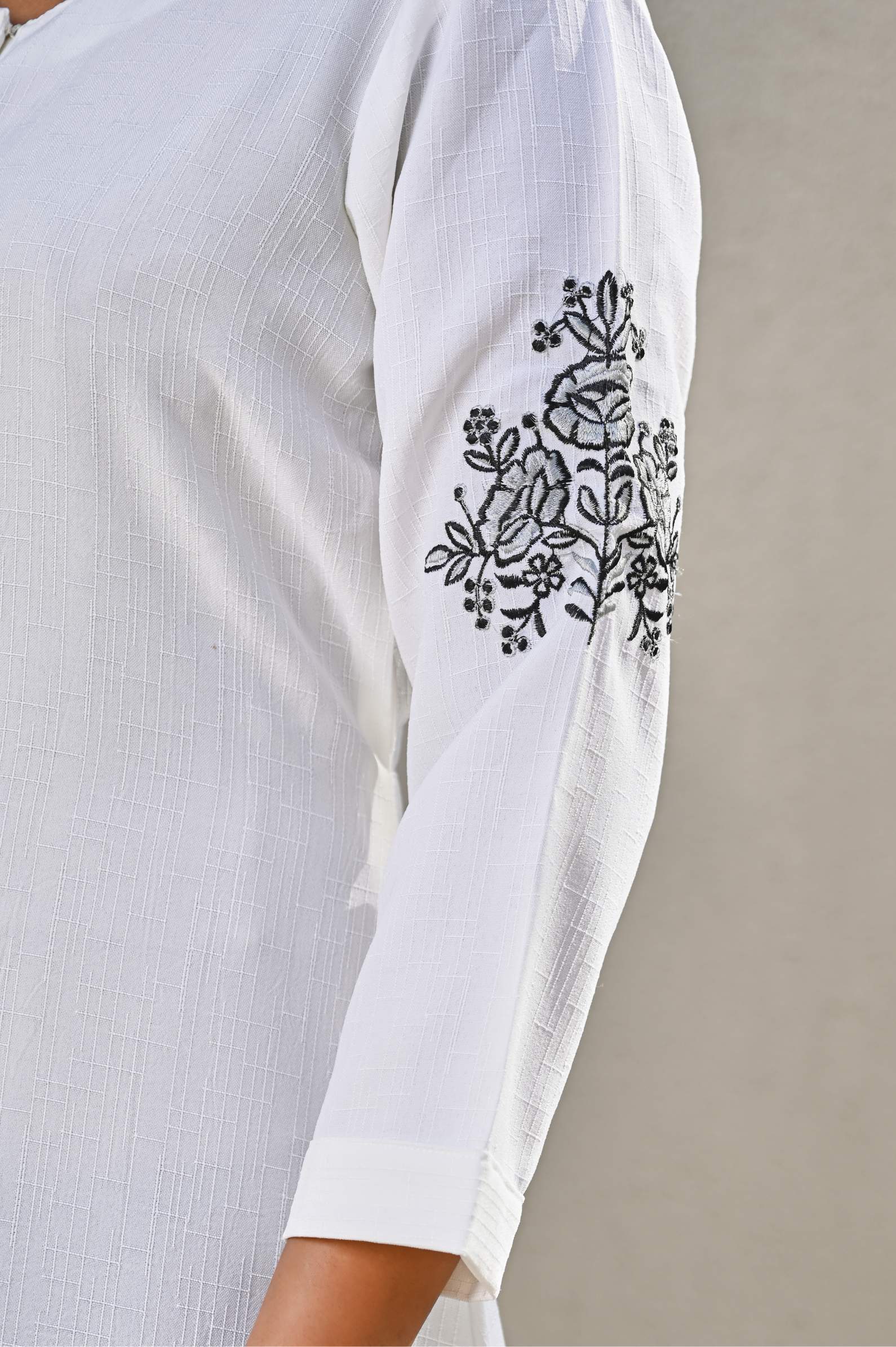 White Front-Button Cotton Dress with Black Floral Embroidery